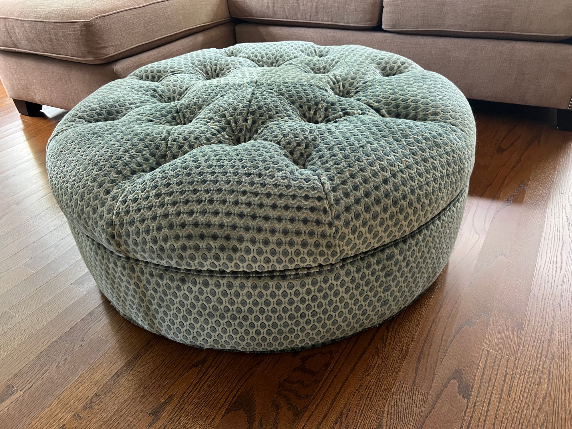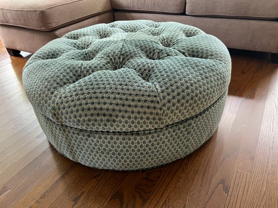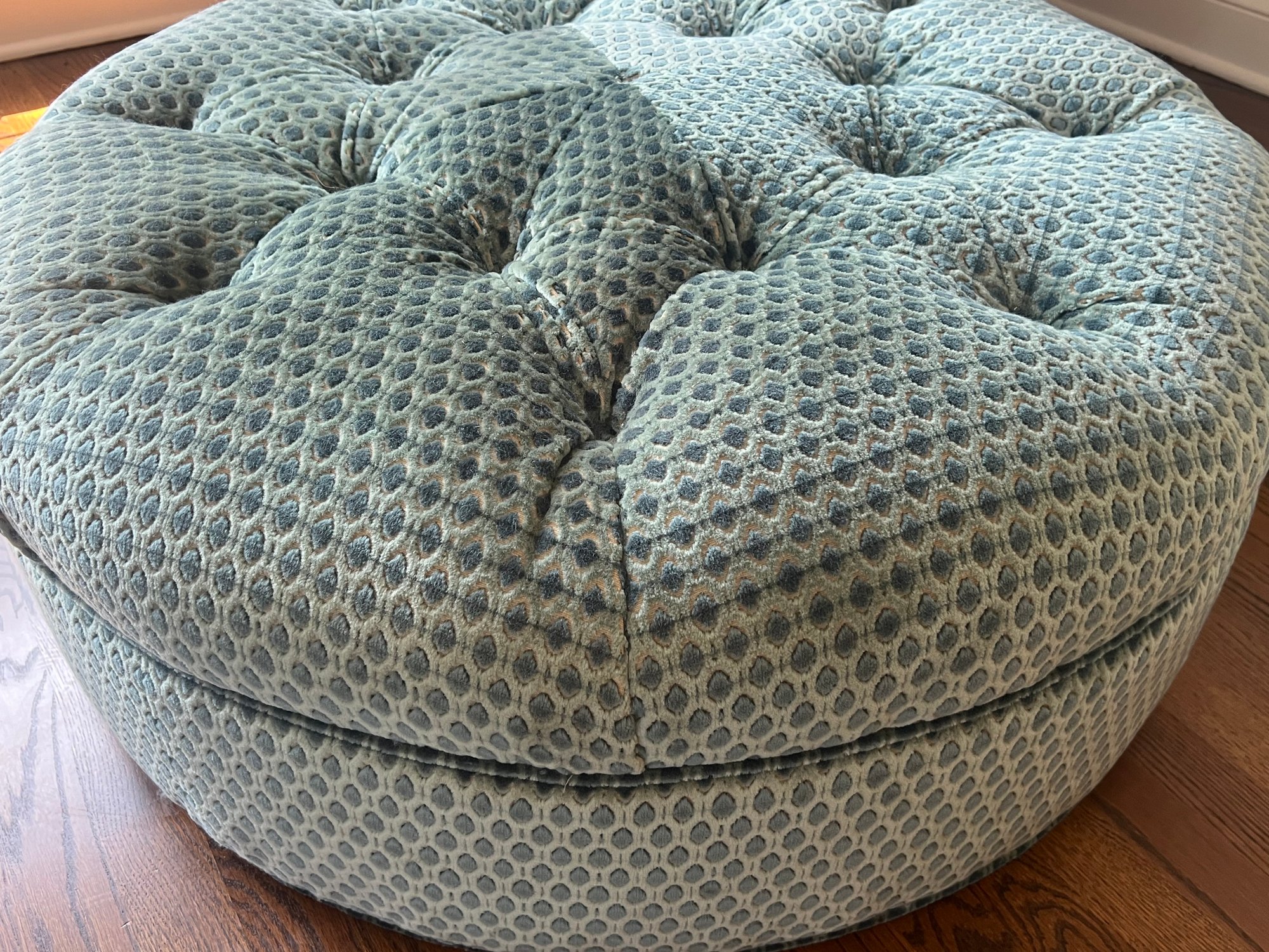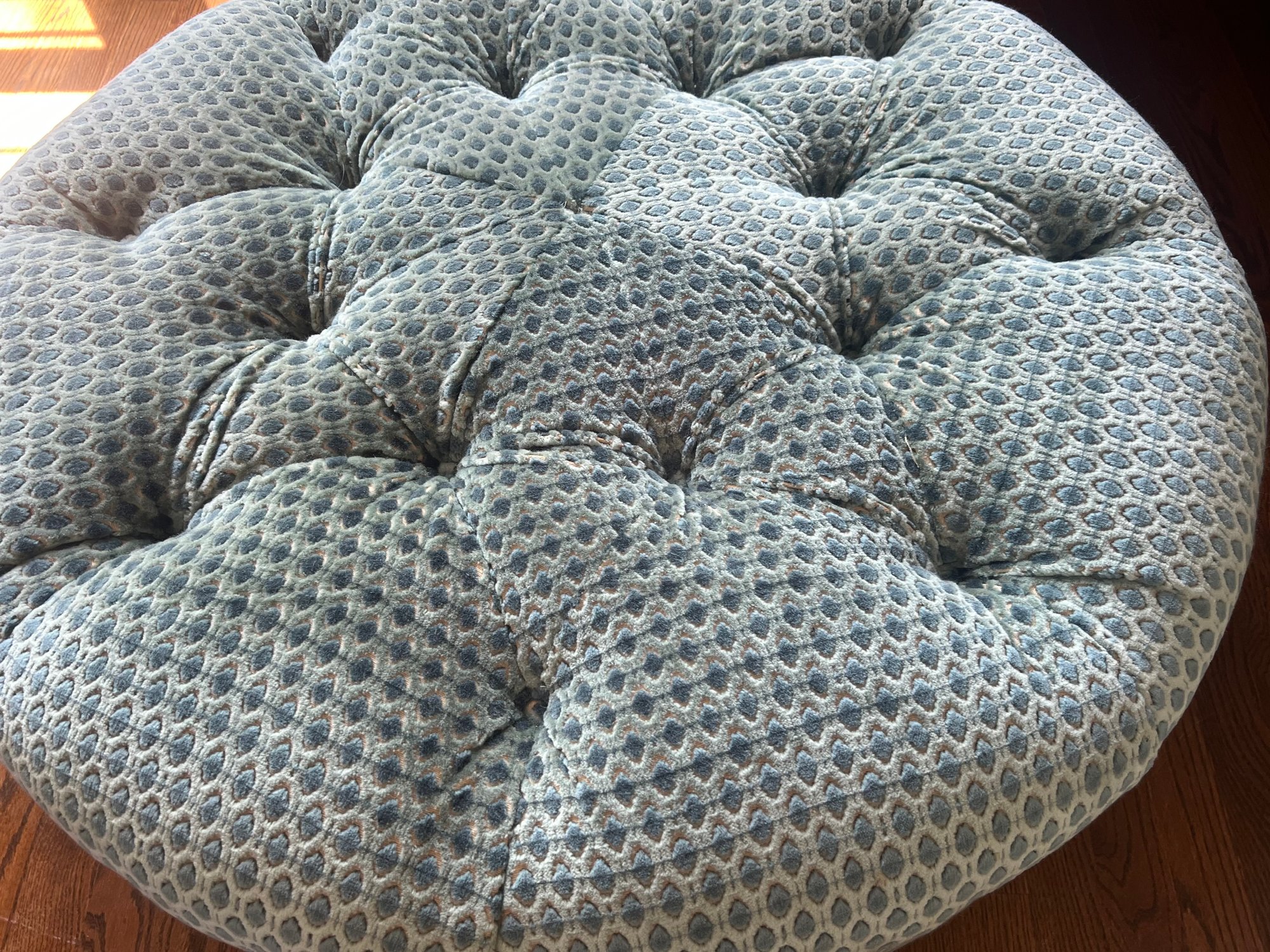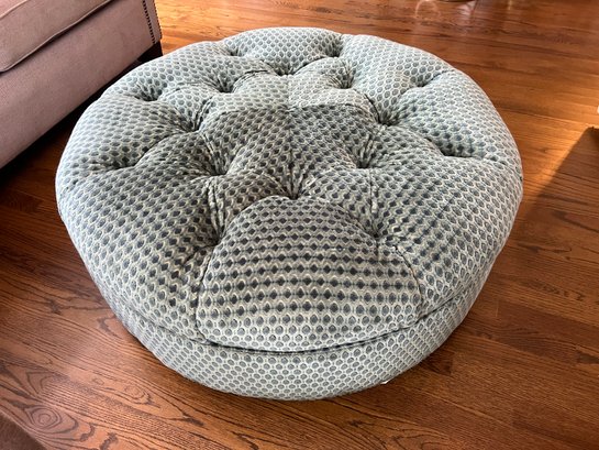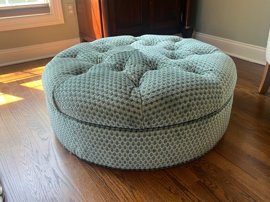 This adorable Lillian August circular ottoman is upholstered in a patterned raised velvet in tones of sea blues. The ottoman is in very good condition, please note one center button fell into the ottoman and appears when viewing it to be missing. Not readily visible.