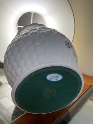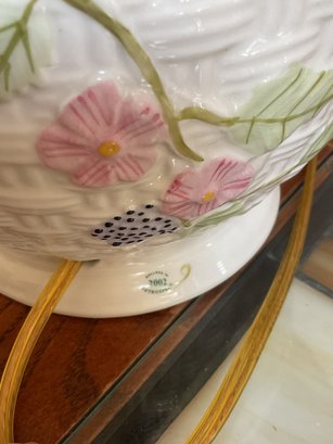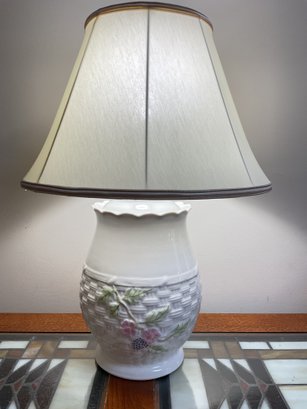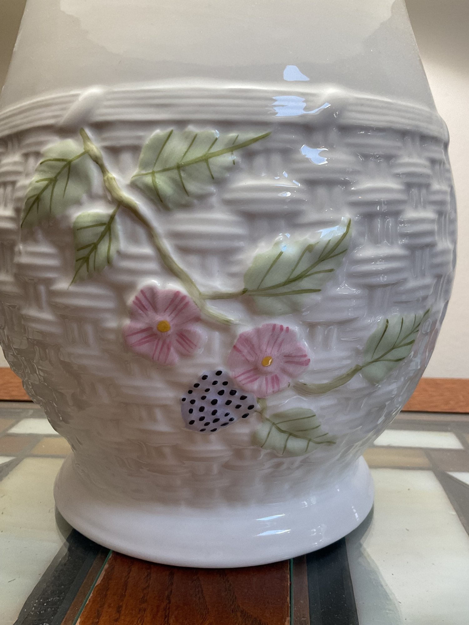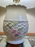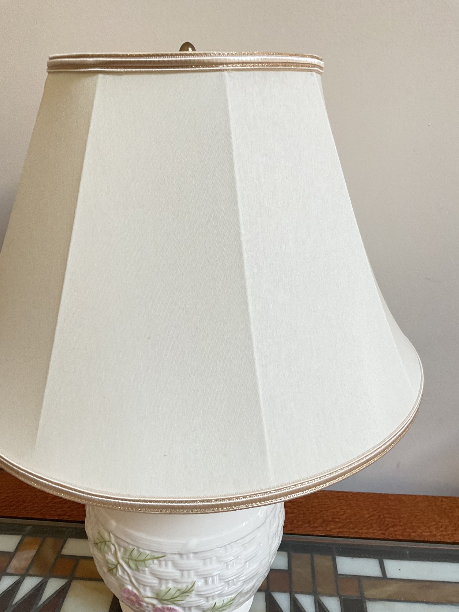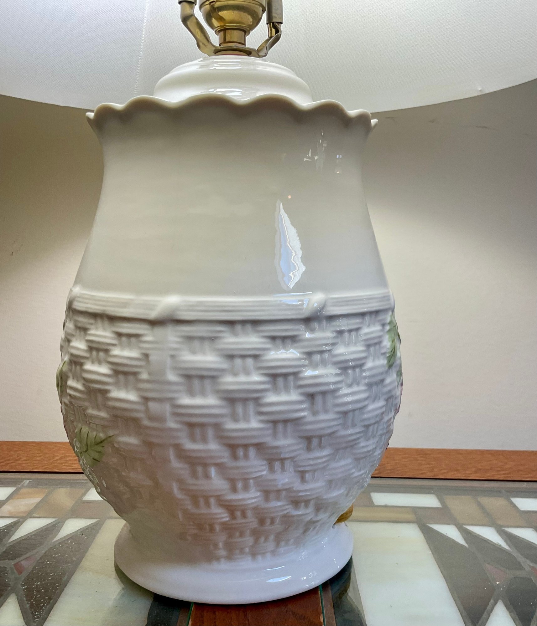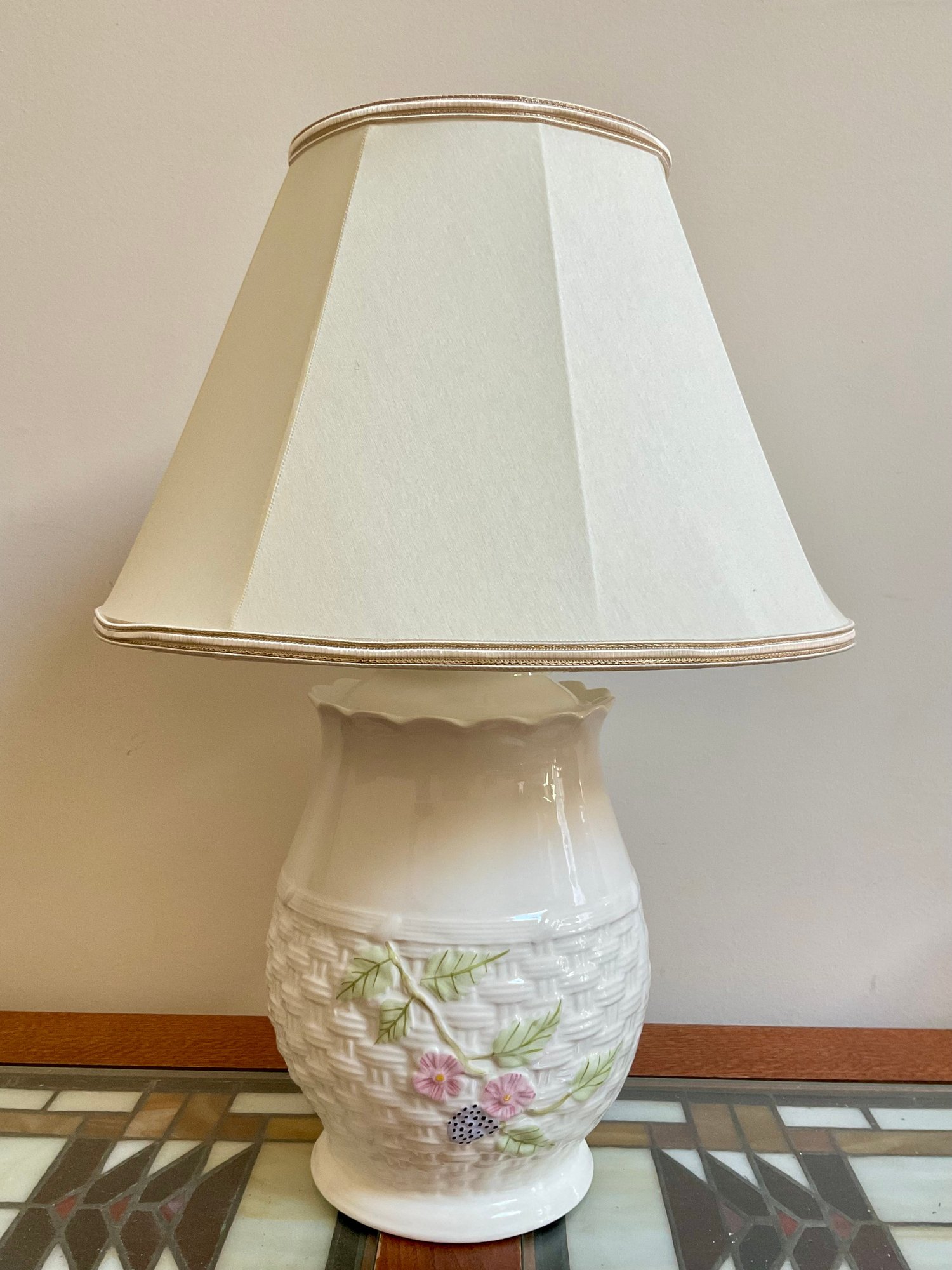 wow what a stunning lamp! Thai is Belleekās most iconic texture, designed to mimic the traditional hand-woven willow baskets of Ireland.this design features hand painted pink flowers and dark purple/black berries.