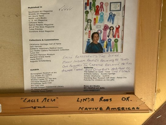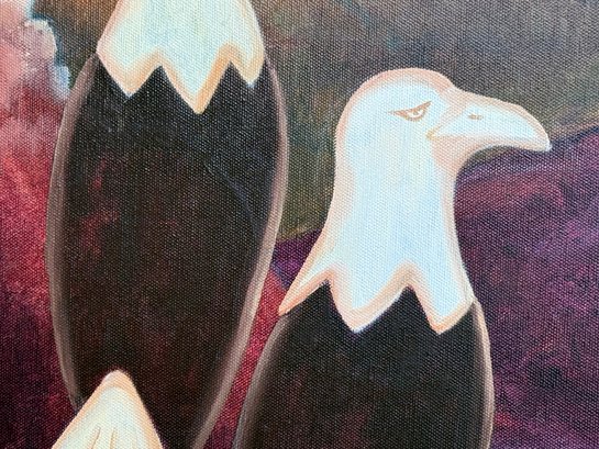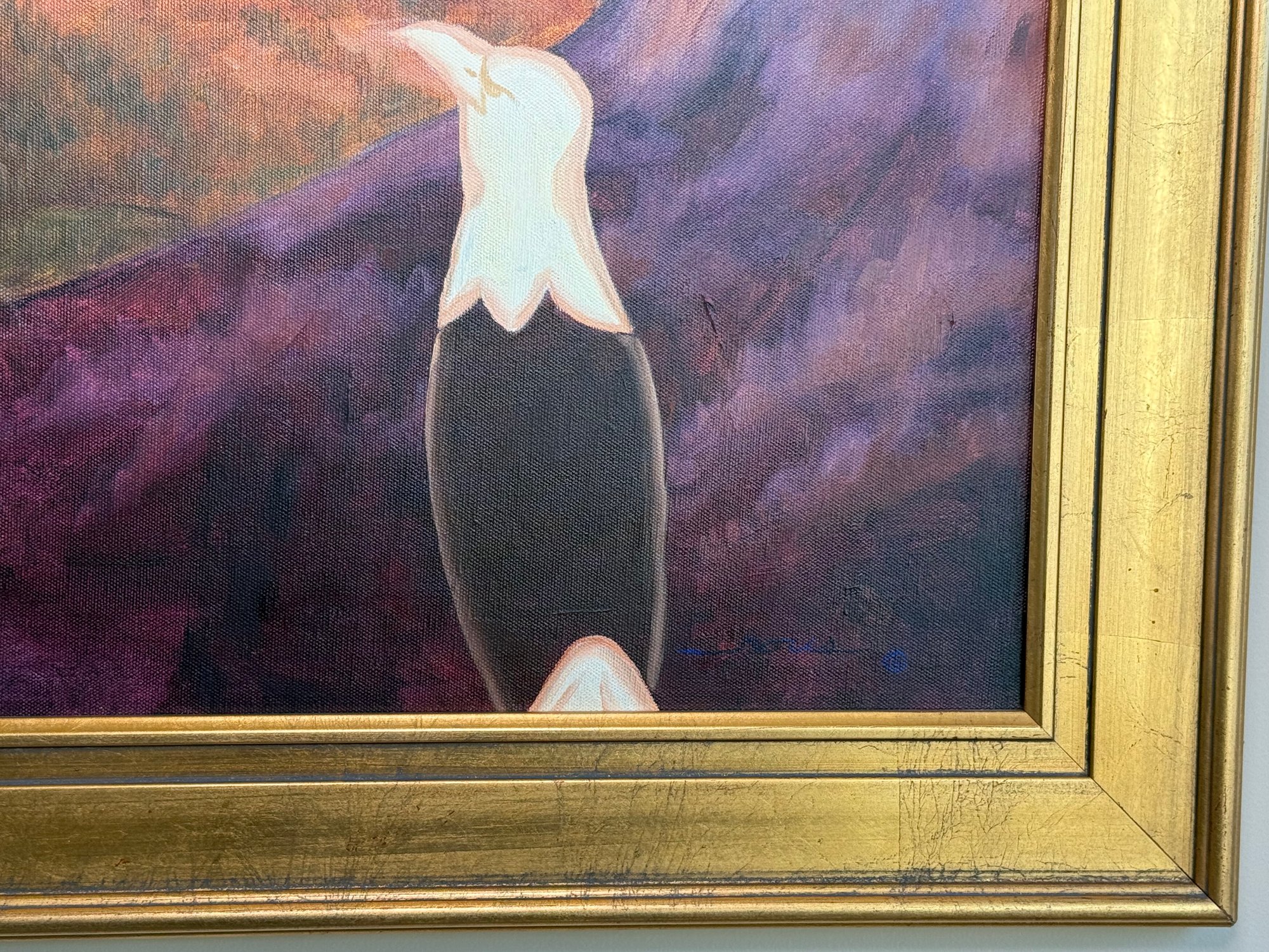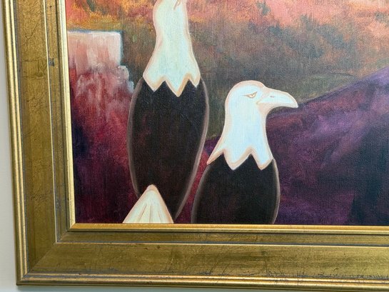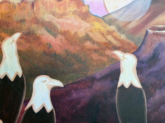 This beautiful oil painting on stretch canvas by Linda Rous, depicts three divine eagles in a Southwestern landscape. It is signed by artist in the lower right hand corner.