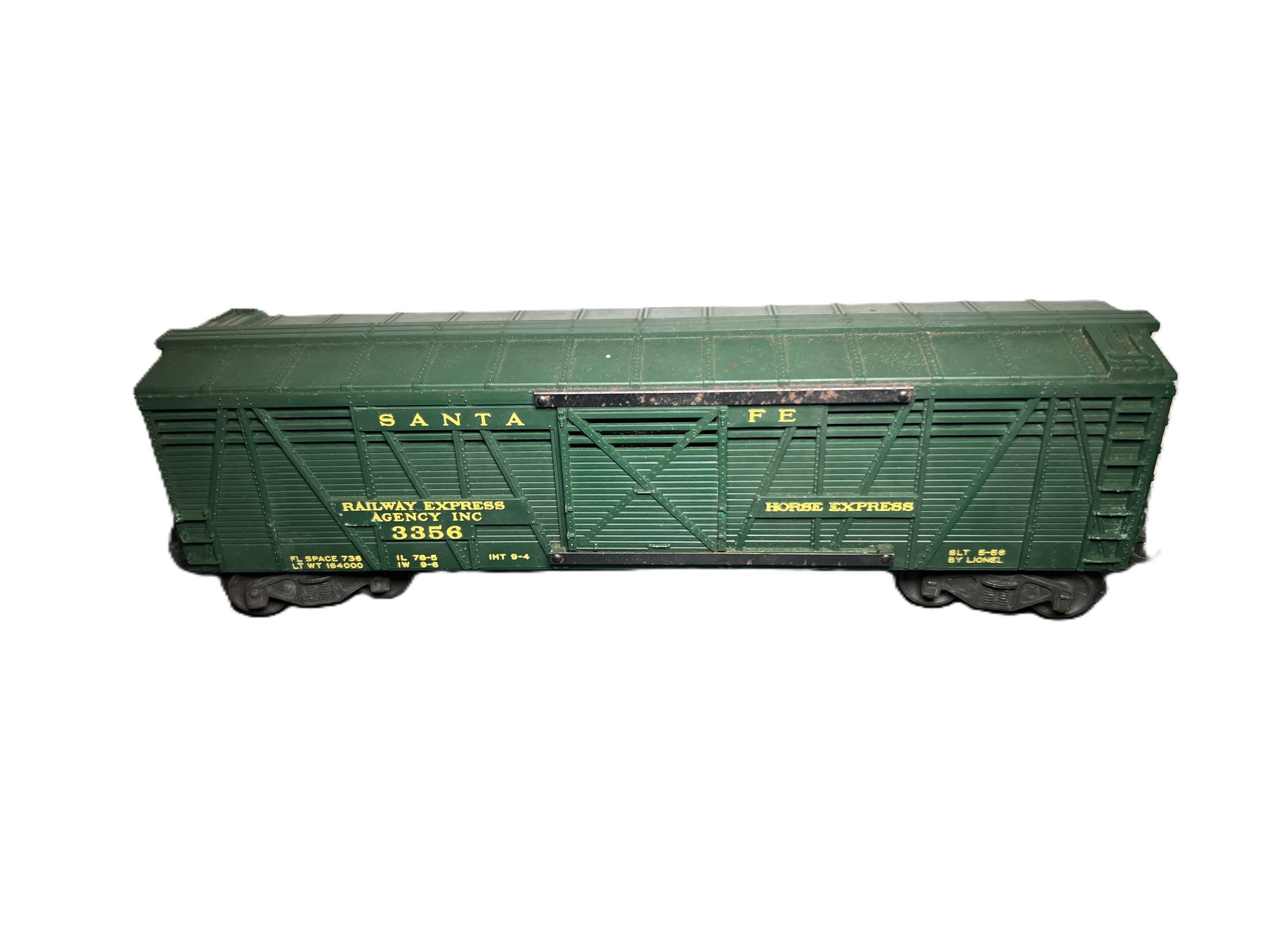 Vintage Lionel no. 3356 Santa Fe O-gauge train car.