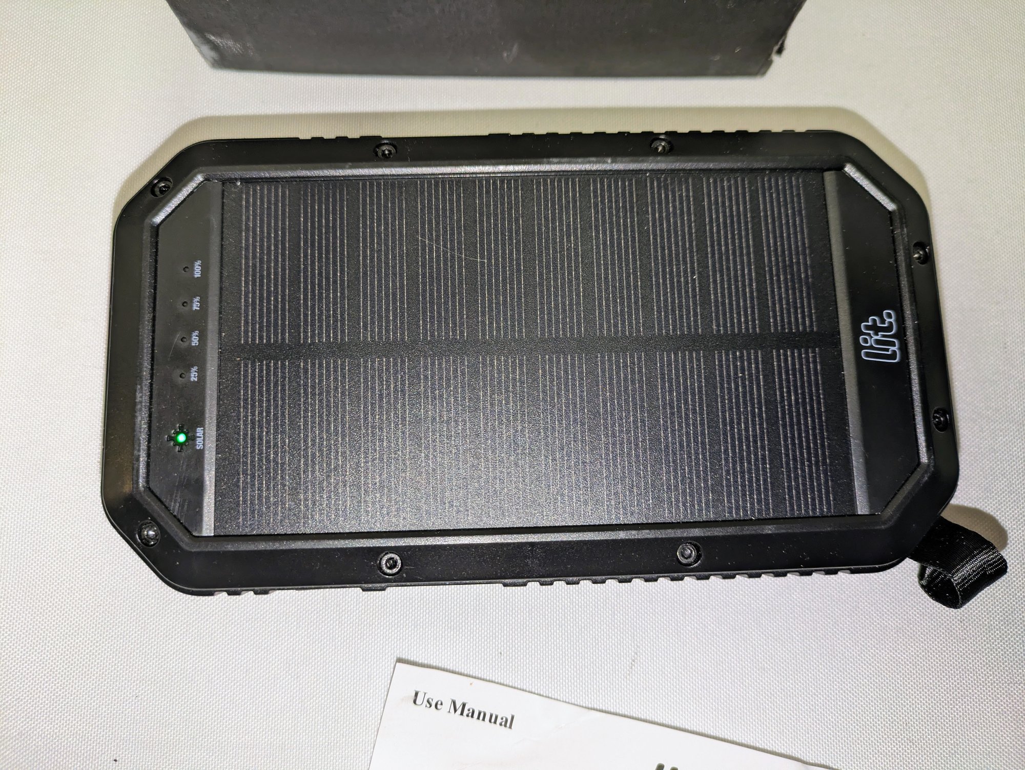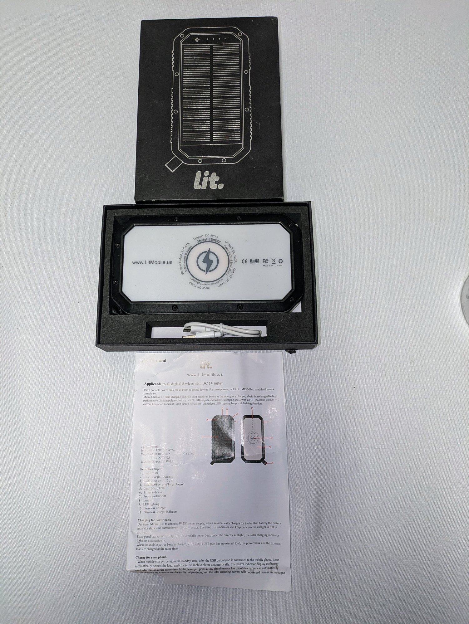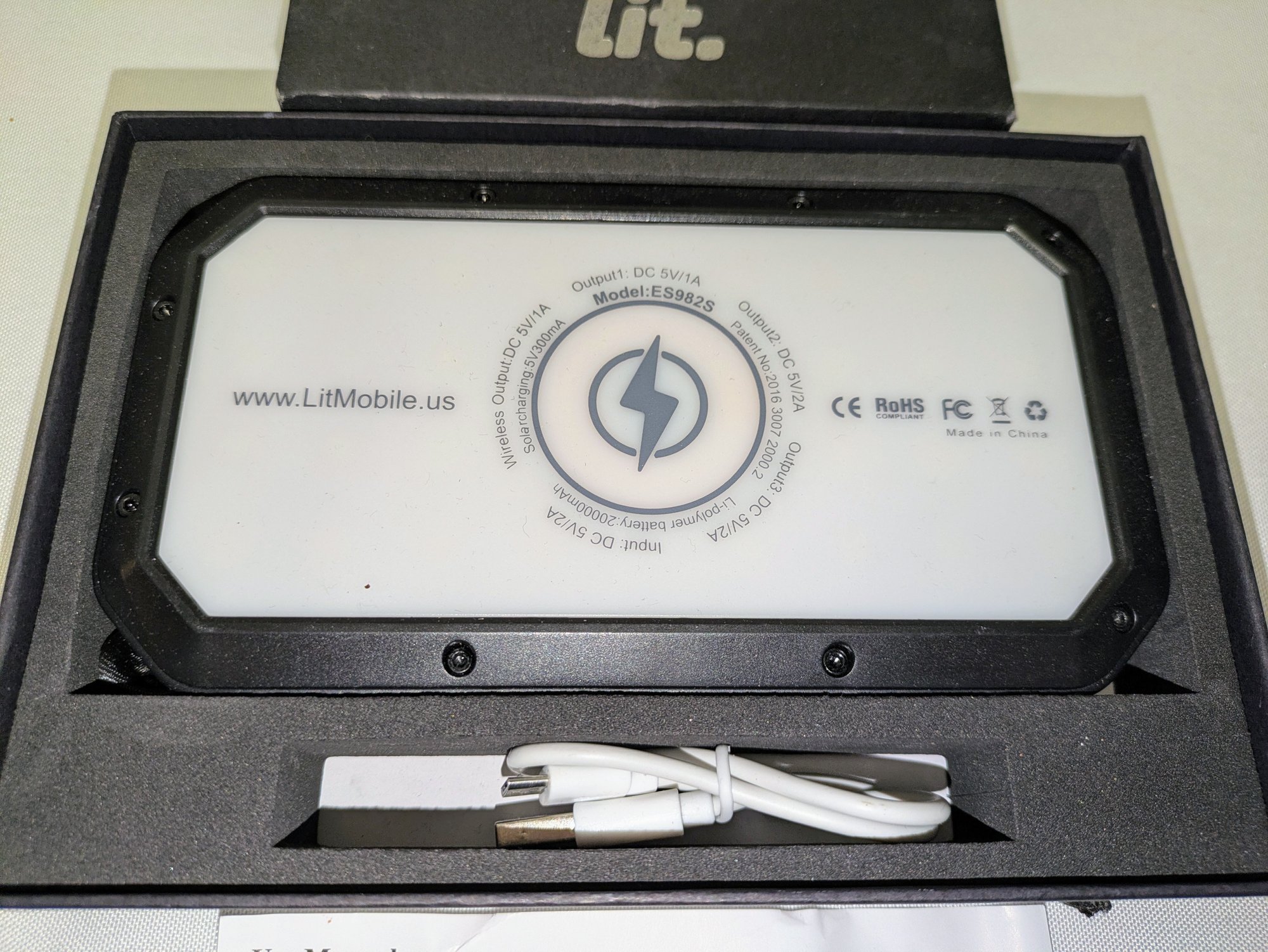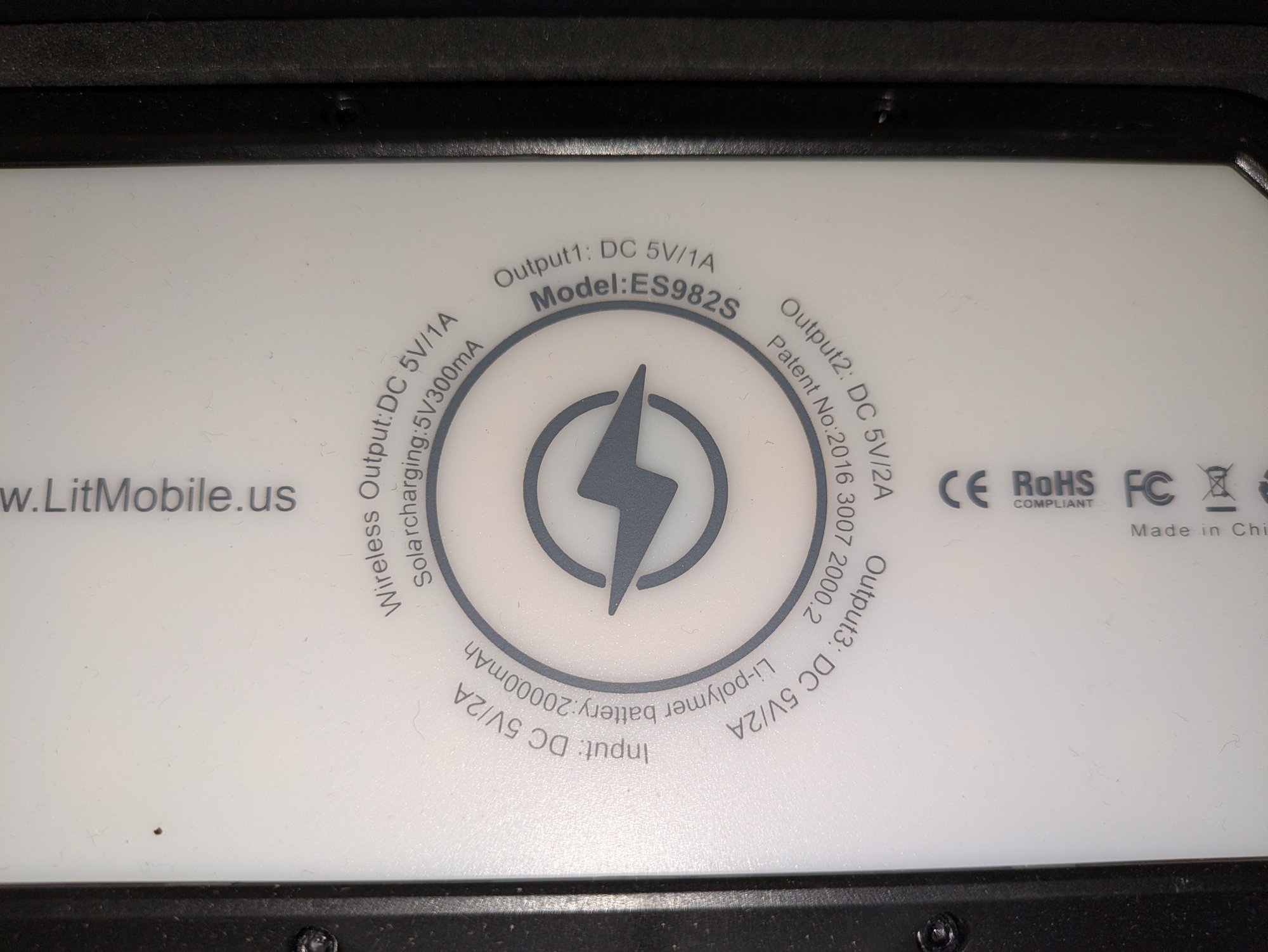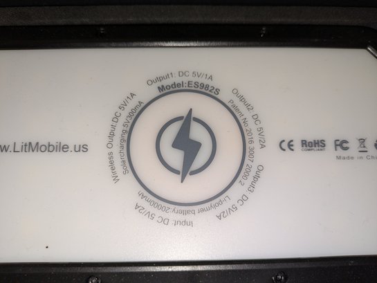 Lit mobile solar power bank - Model ES9825. Has a 20000mAh Li-polymer battery capacity.