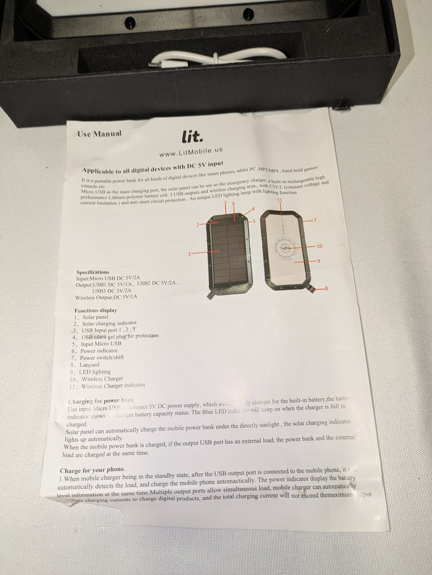 It supports wireless charging with an output of DC 5V/1A. It can be recharged via solar charging (5V 300mA) or a wired input. It has multiple output ports, including two 5V/2A outputs and one 5V/1A output. 1"H x 4" x 7"