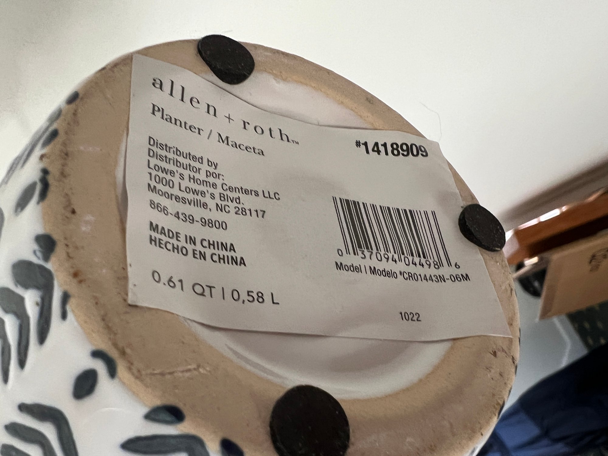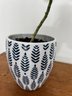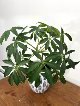 Petite living dwarf umbrella tree houseplant in a stylish glazed planter in a navy and white fern pattern. Dimensions overall - planter and dwarf tree 16" in height.