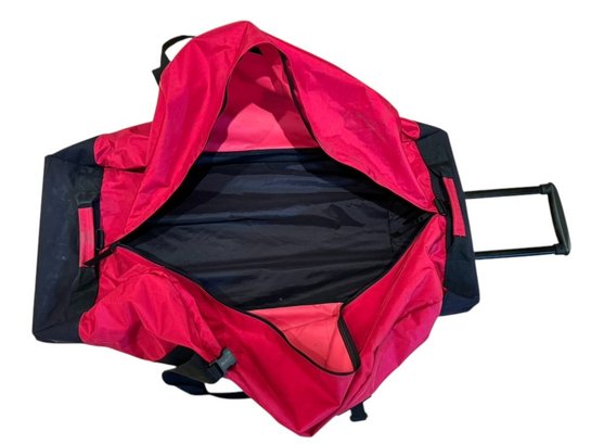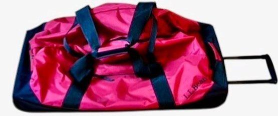 Black 28" by 16" with extendable handle, and two outer zipper compartments. In good used condition.