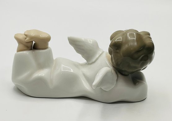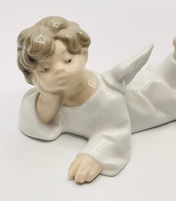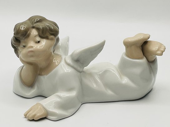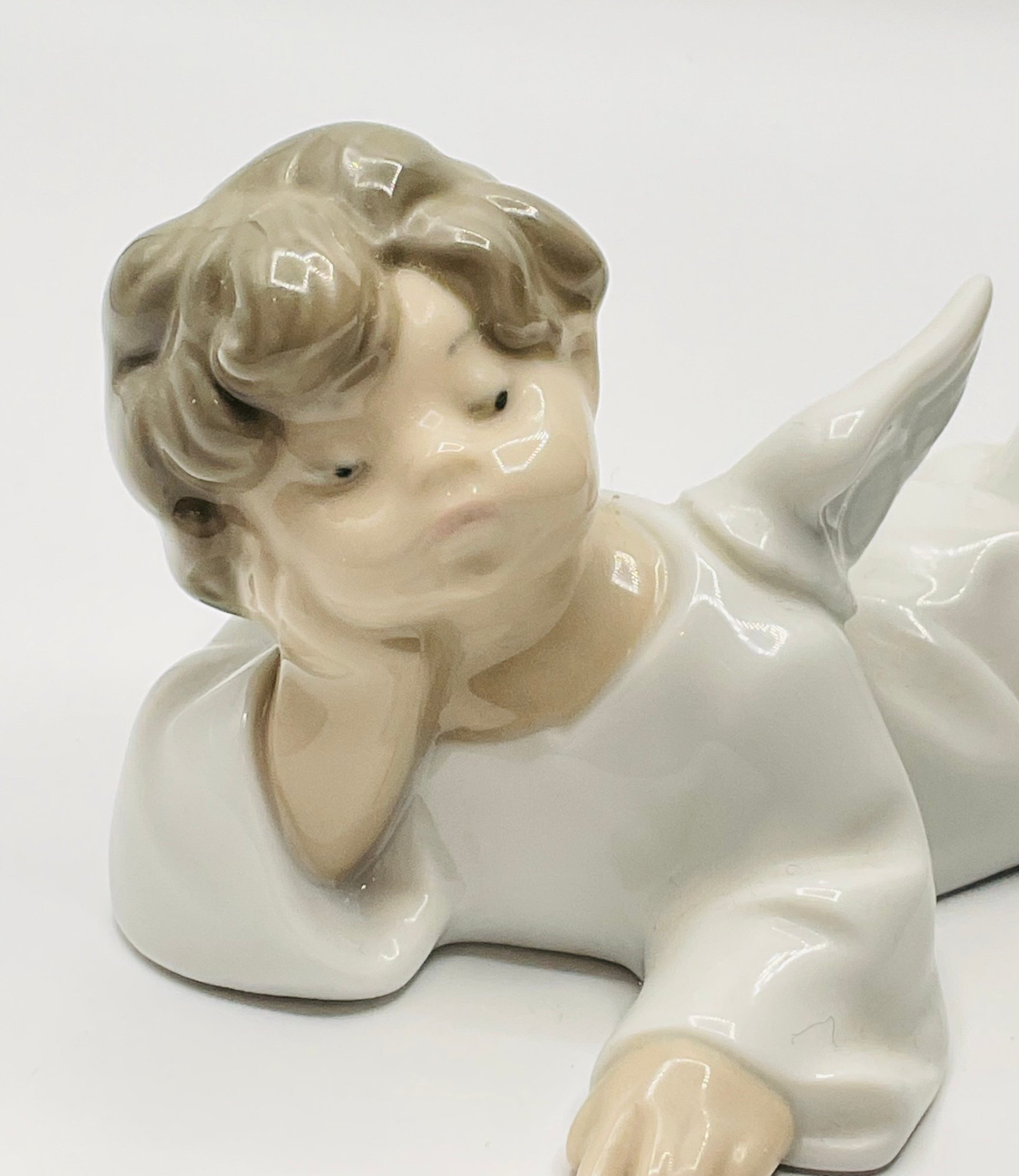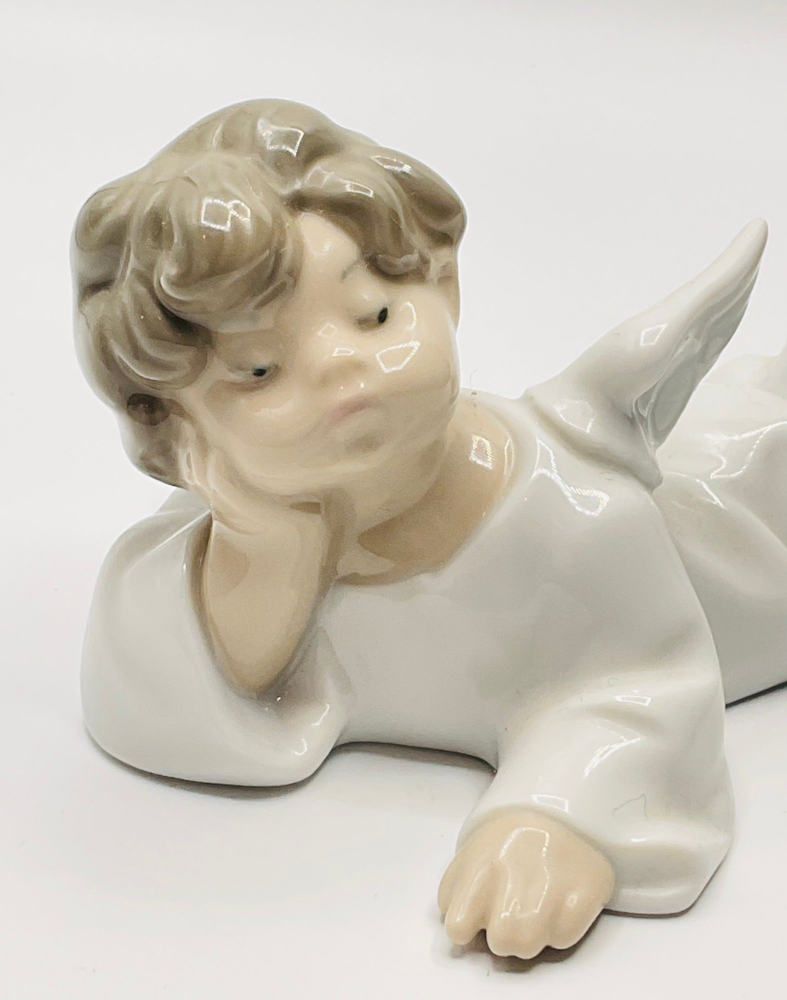 Reclining/Thinking Angel: A whimsical figure of a cherub resting on their stomach with chin in hand.