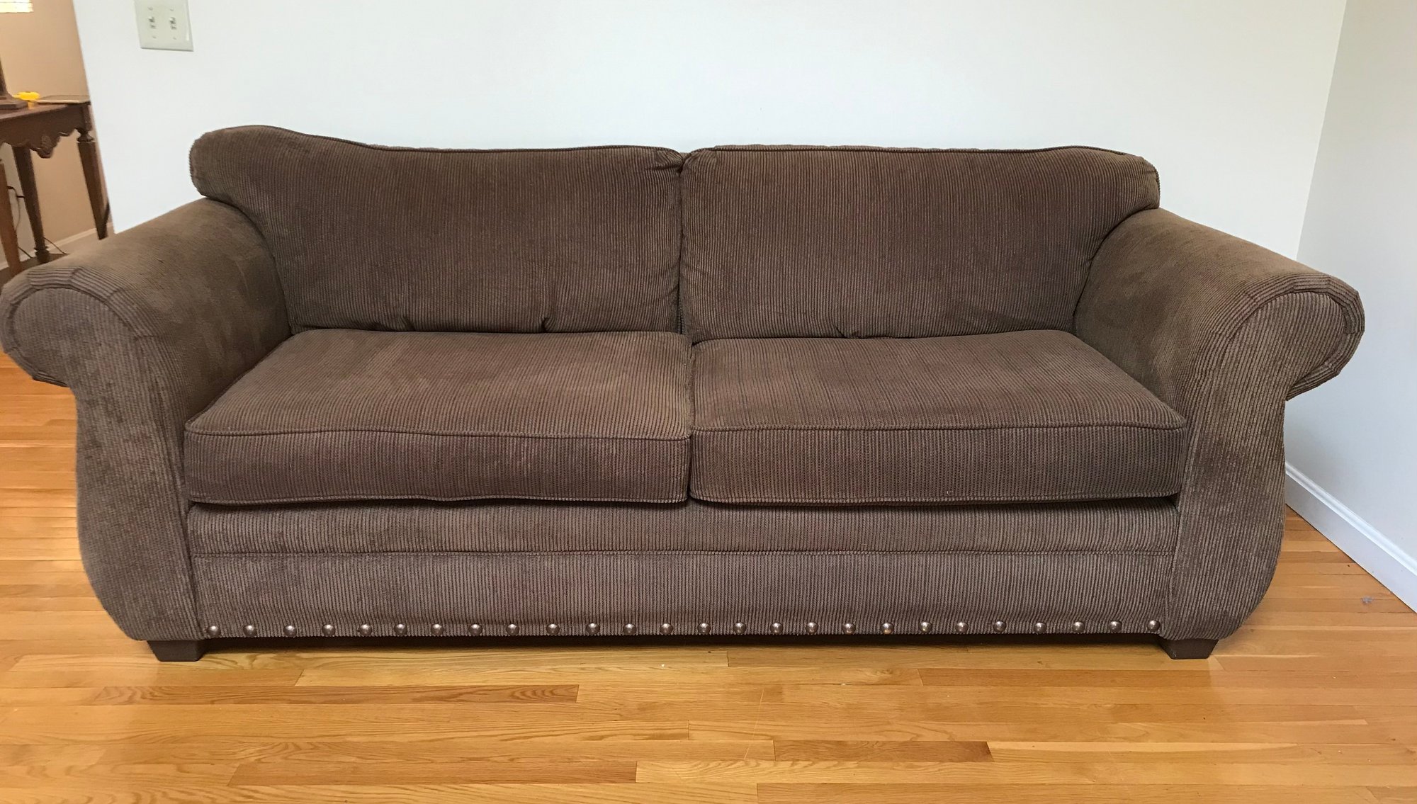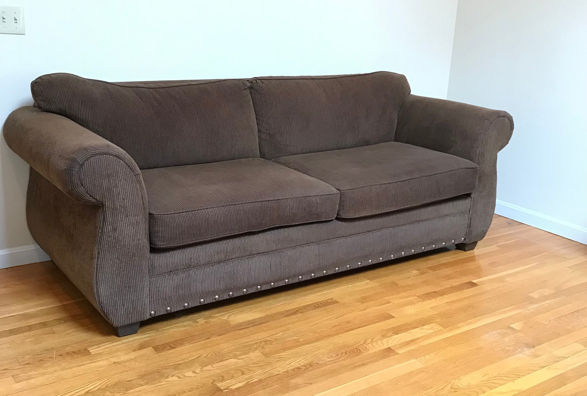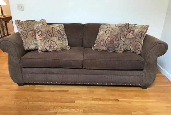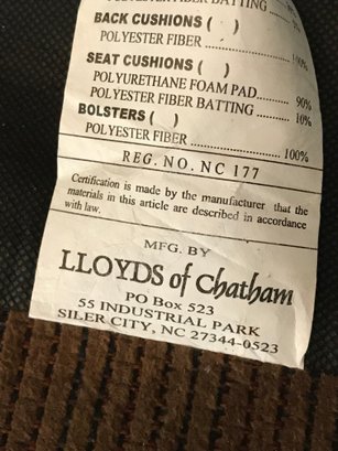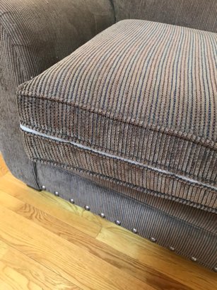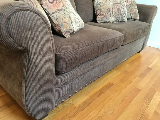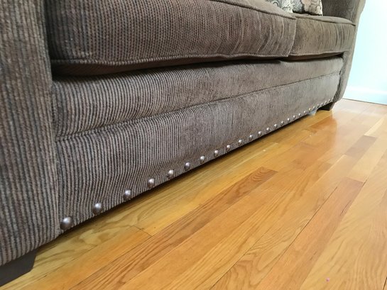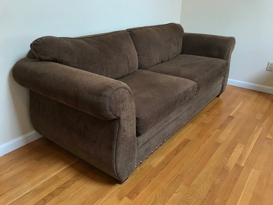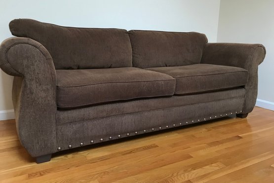 This is a substantial and comfortable sofa manufactured by Lloyds of Chatham in Siler City, NC. It features a rich, chocolate brown corduroy upholstery with a soft, ribbed texture and classic rolled arms. The base is accented with a decorative silver-tone nailhead trim, adding a touch of traditional flair.
