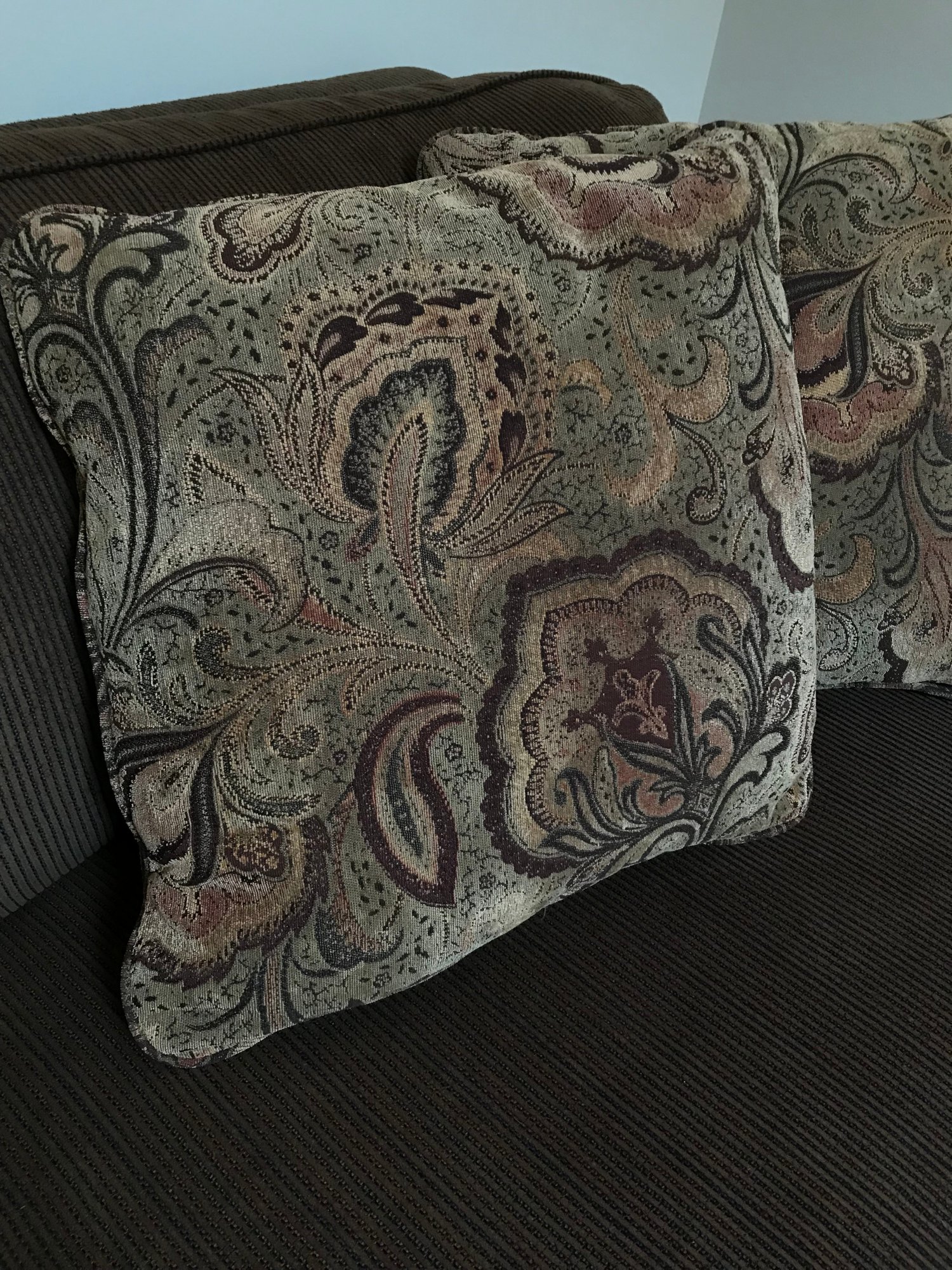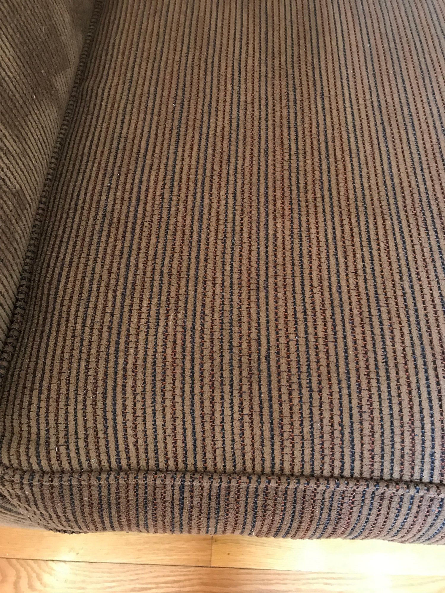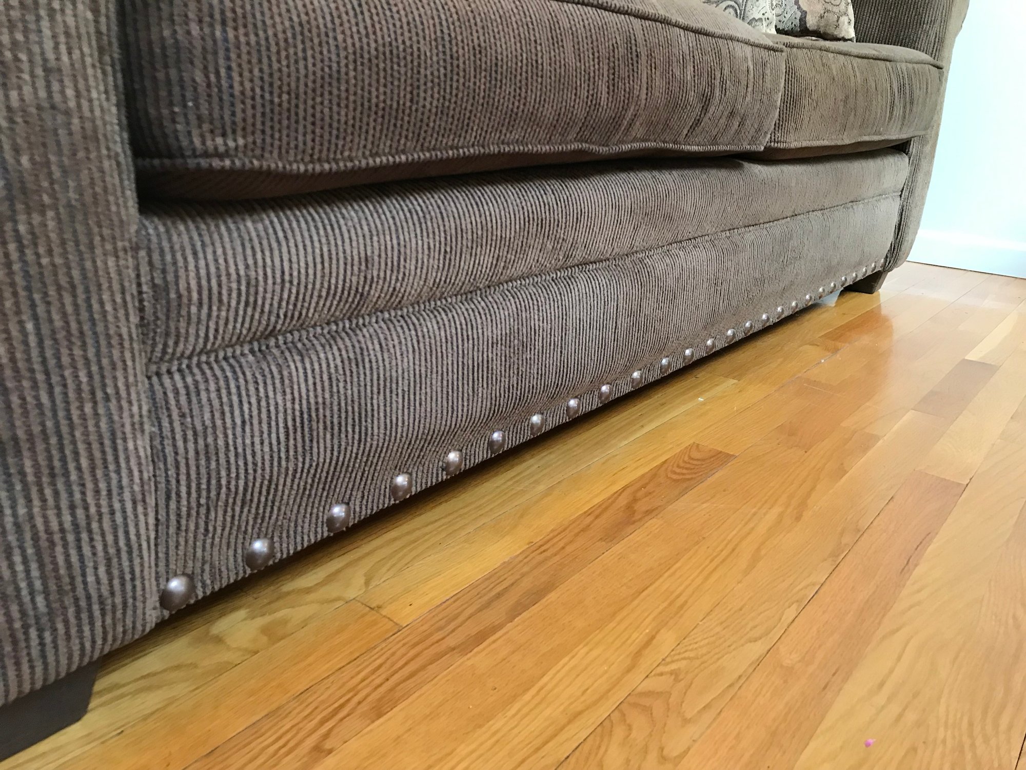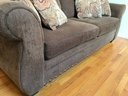 The sofa comes with two matching reversible cushions and four patterned accent pillows in earthy tones. According to the manufacturer’s tag, the seat cushions are constructed with high-density polyurethane foam and polyester fiber batting for lasting support.