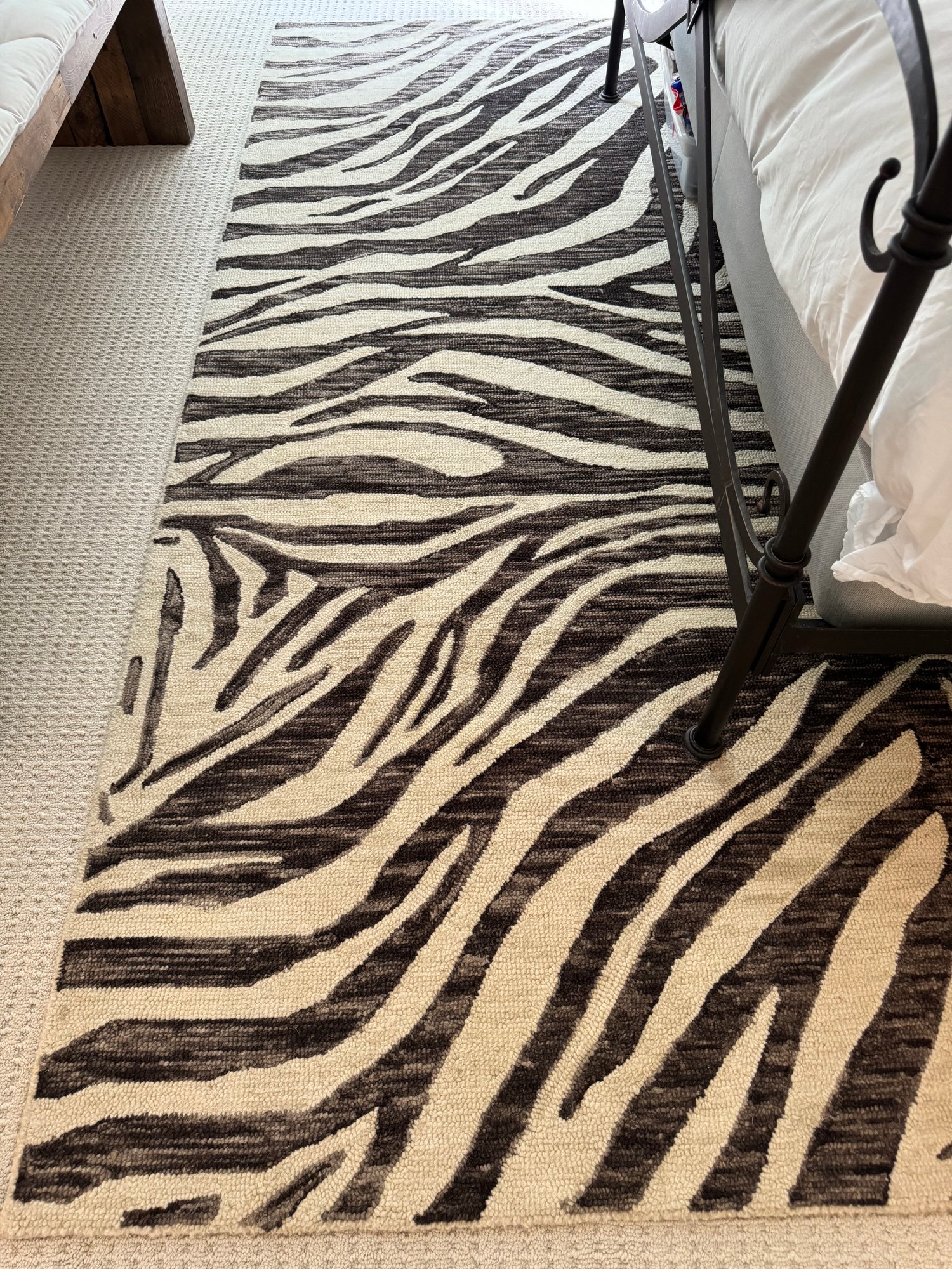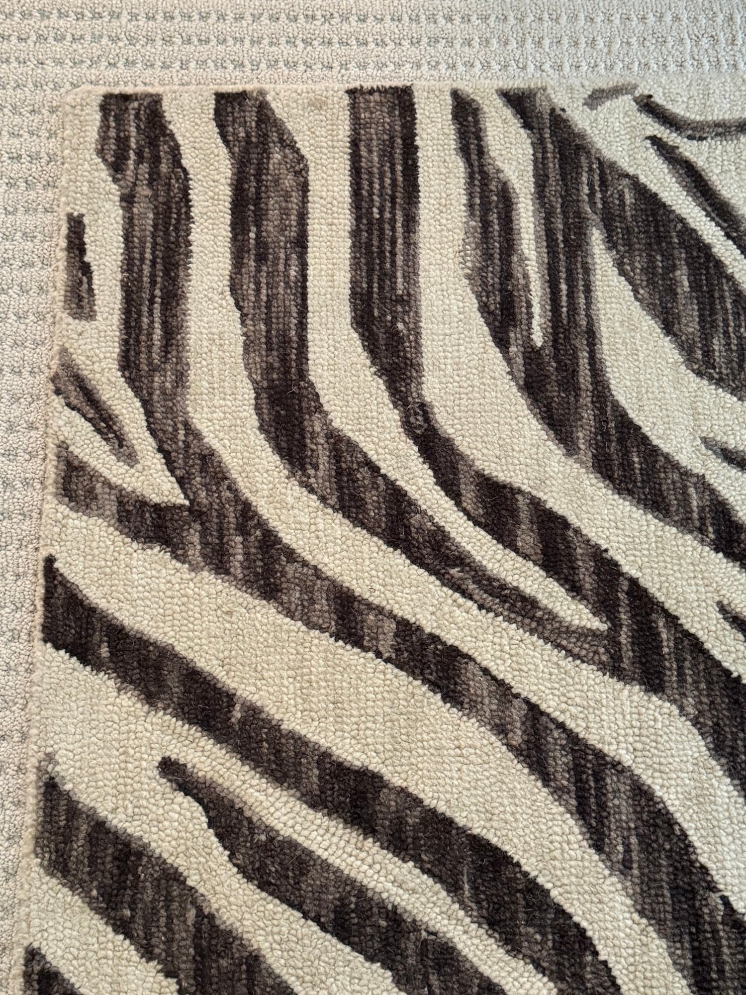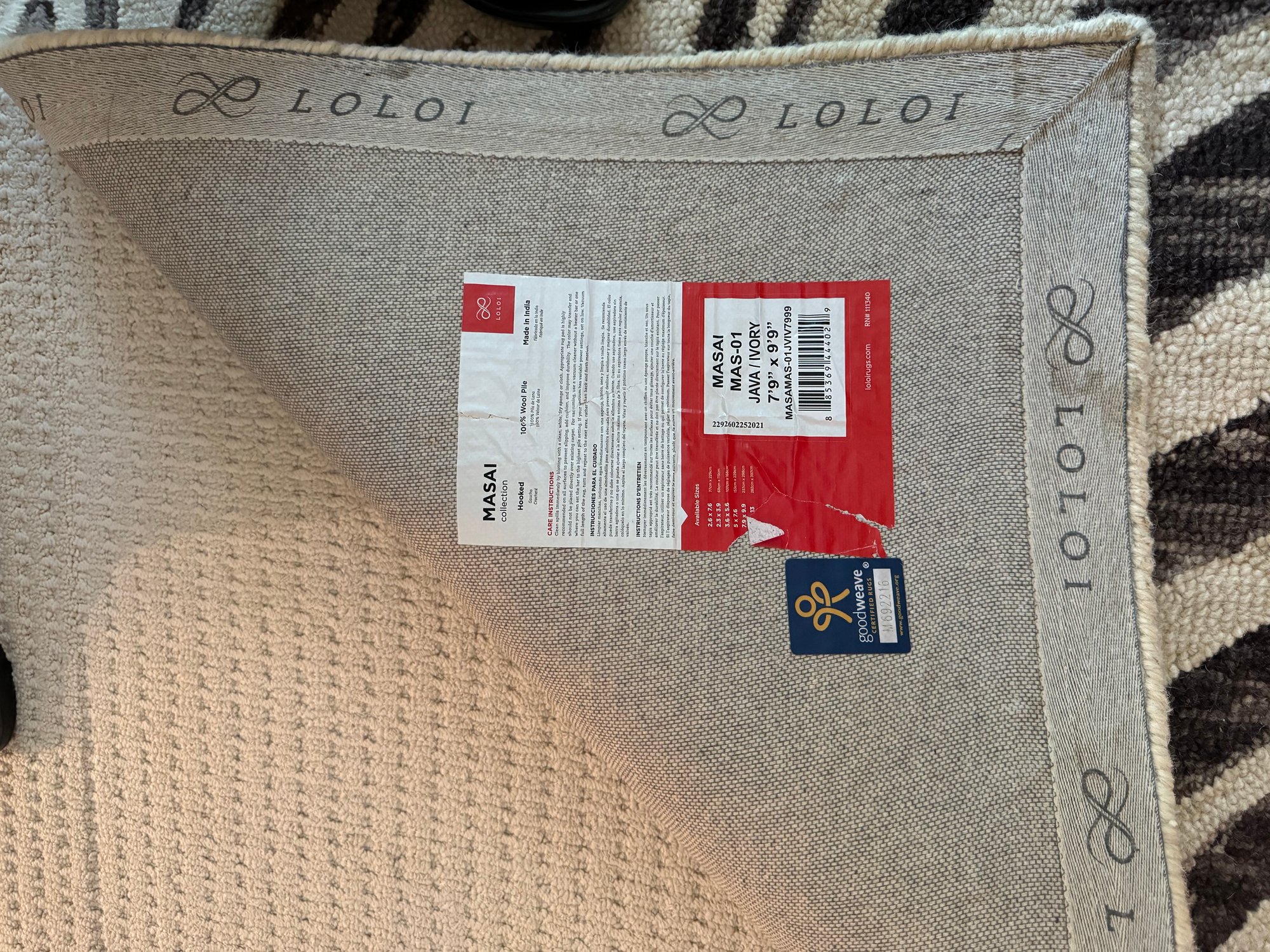 Stylish zebra patterned Loloi flat weave wool contemporary carpet in java + ivory tones. Perfect for adding a bit of fab flair to your room :). Condition is good with lite use well maintained. Size 7’9” x 9’9”