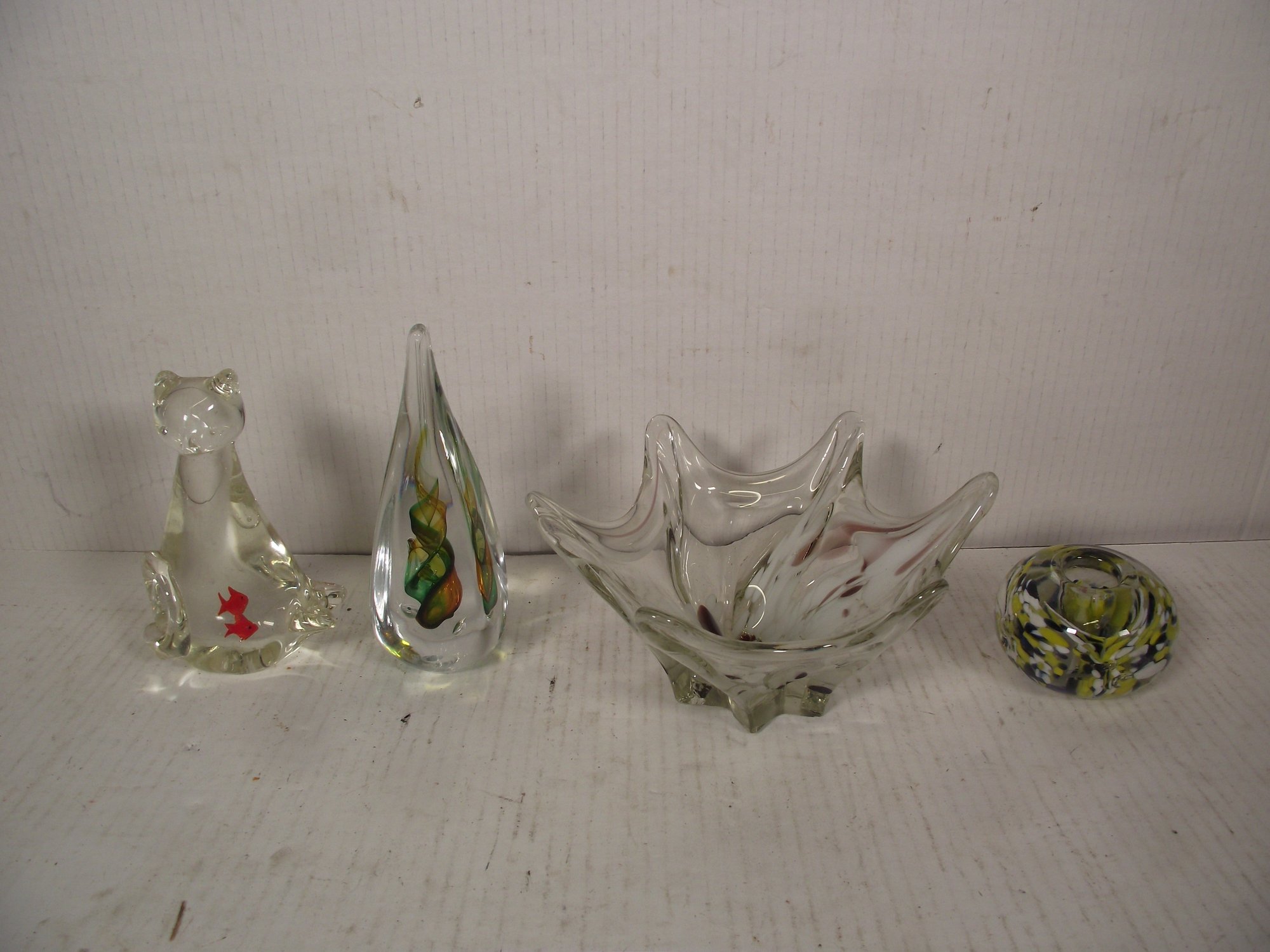 LOT OF 4 PIECES OF ART GLASS. SEE PHOTOS FOR CONDITION AND VARIETY.