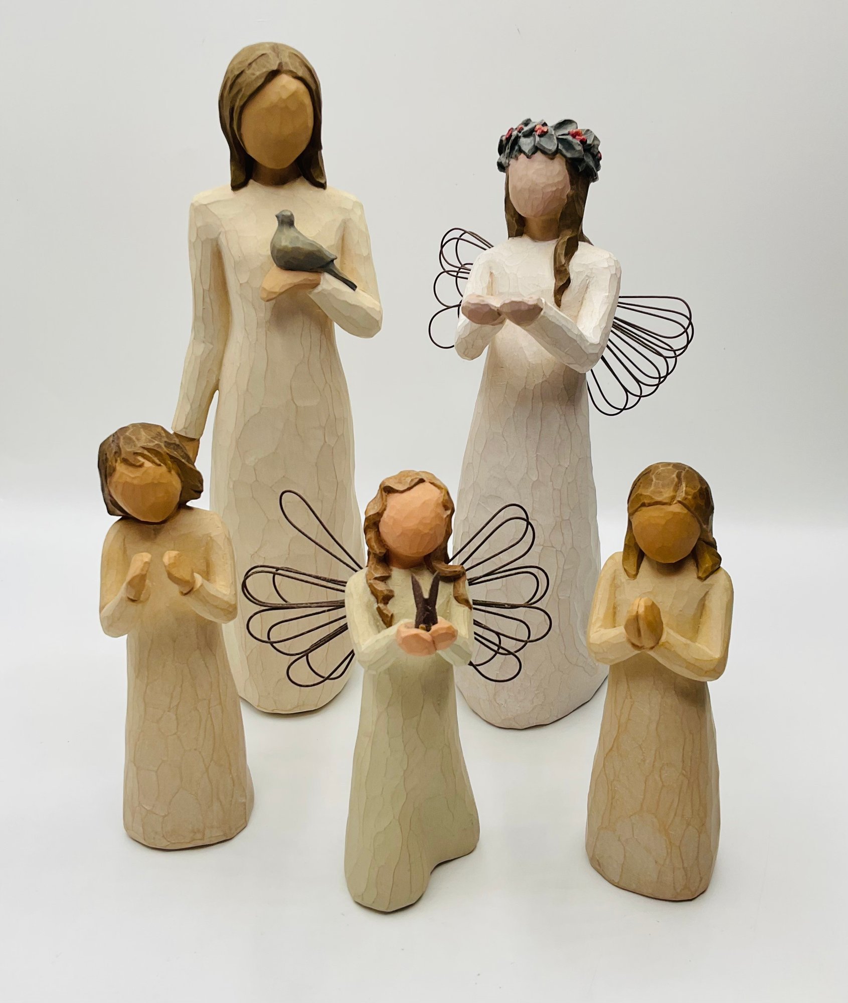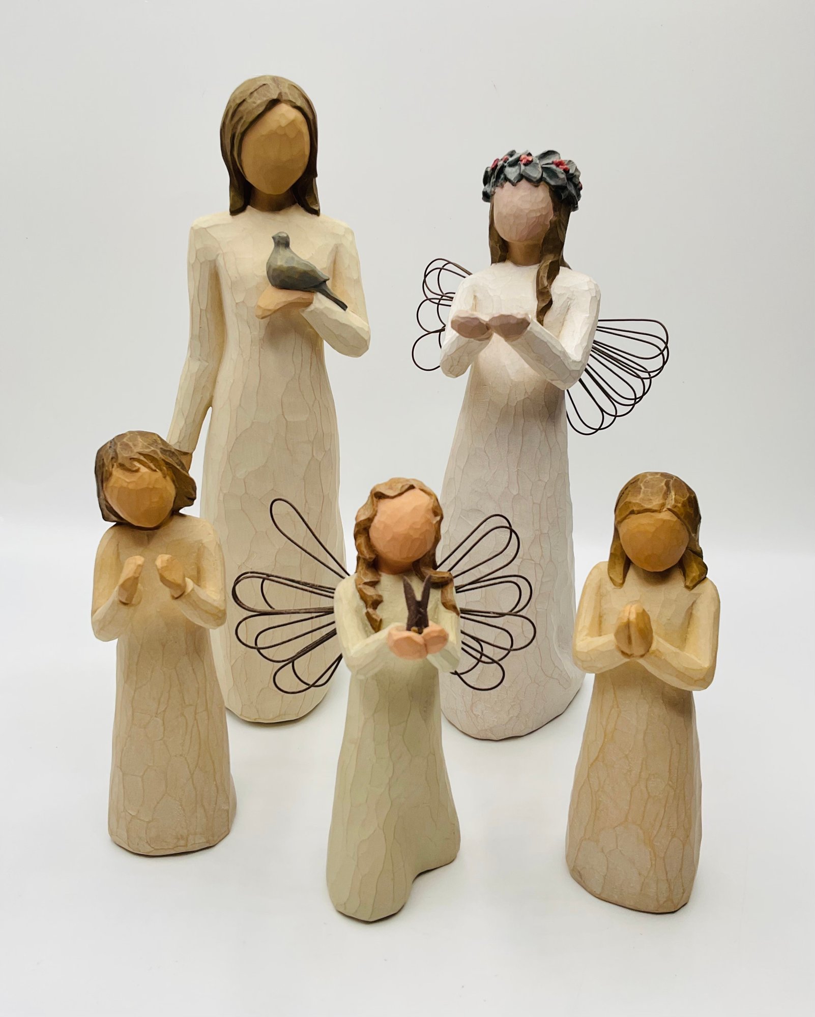 Angels/Figures of Prayer & Remembrance: Three smaller figurines in various poses of reflection, including one with wire wings holding a small bird/butterfly.