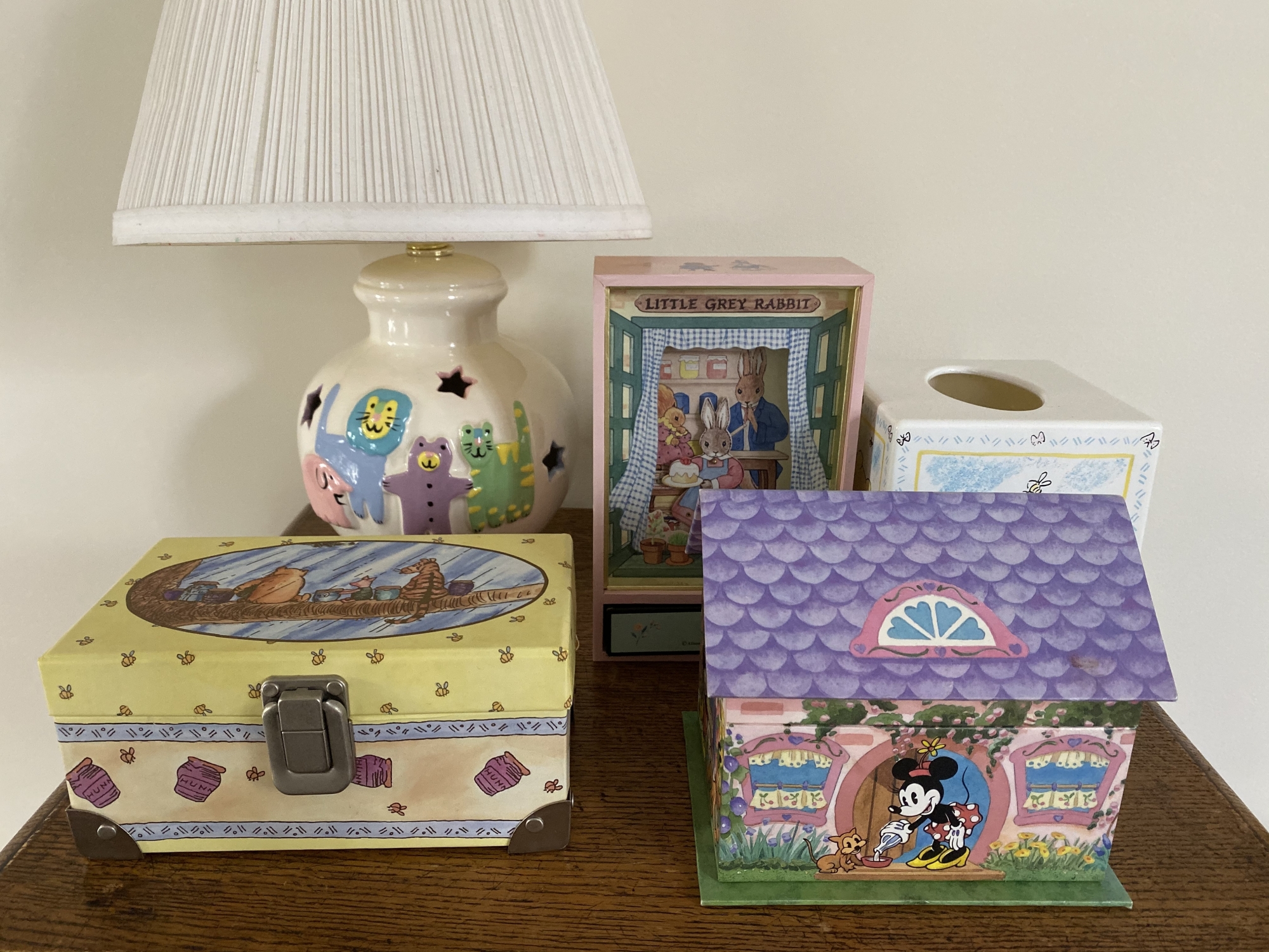 White table lamp with brightly colored animals; 3 various jewelry/music boxes; Winnie the Pooh tissue box holder. See photos for individual details.