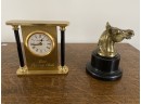Small table clock engraved with "Law Legacy Club" and small bronze horse statue with stand.