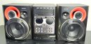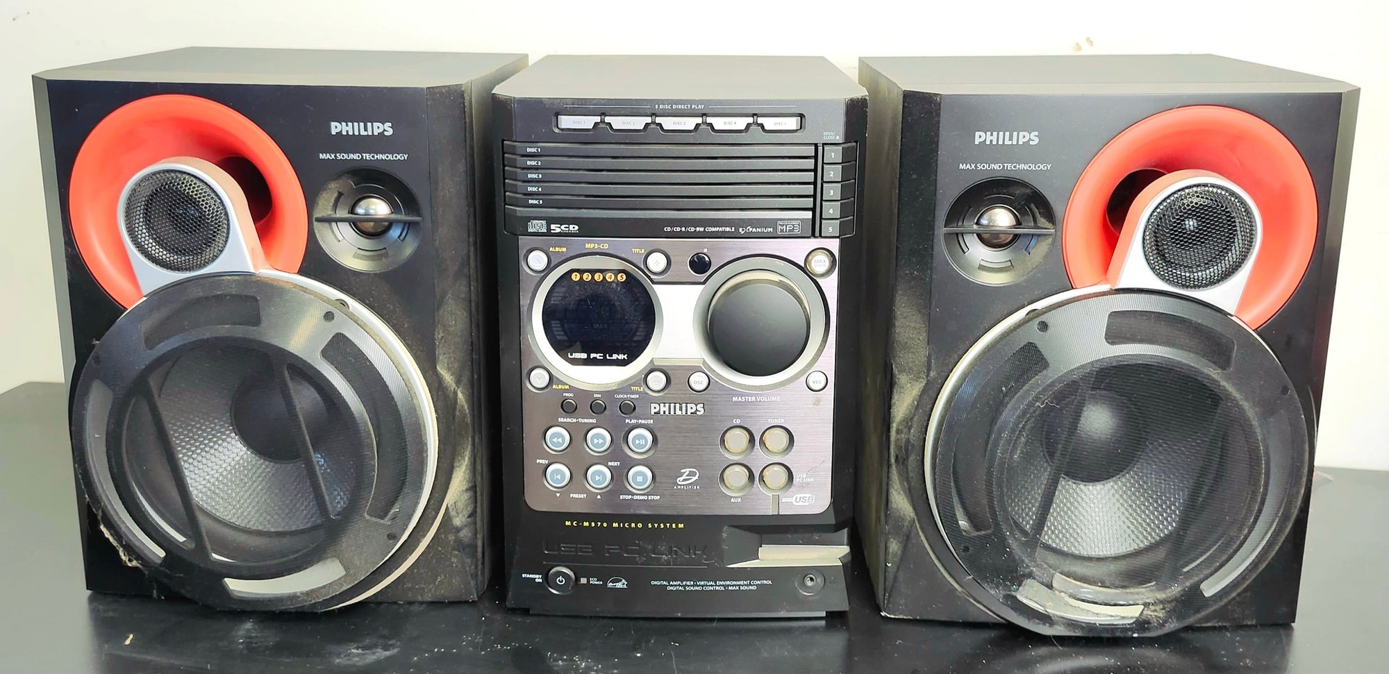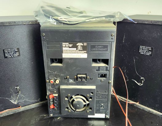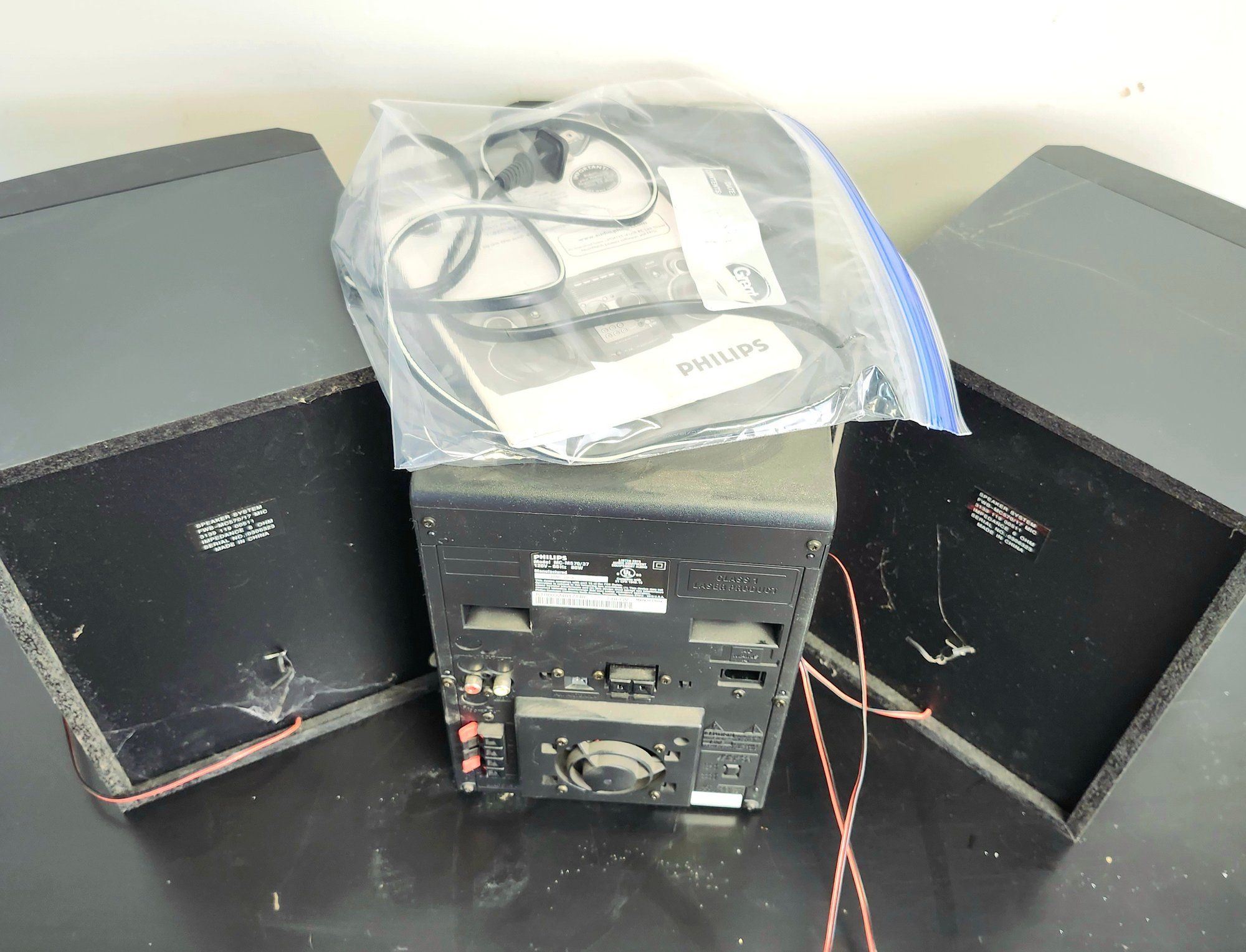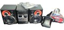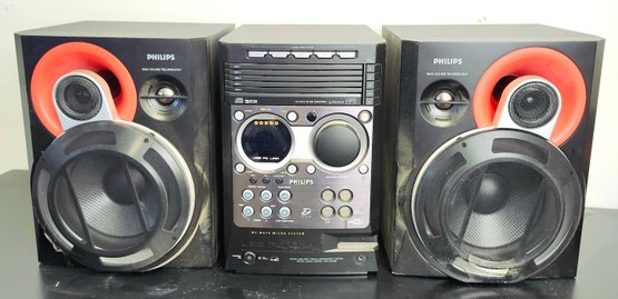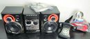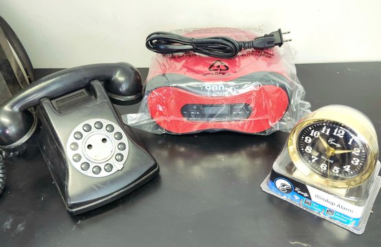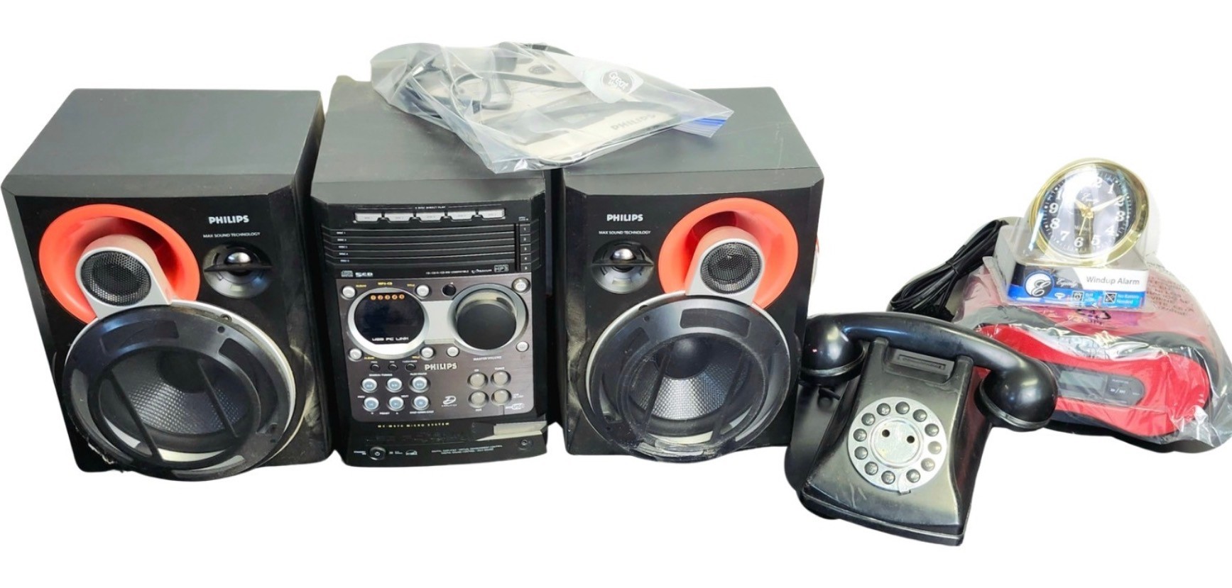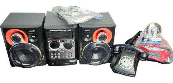 Philips stereo with speakers, onn radio cd player alarm clock, retro alarm clock, and push button phone made to look like a rotary phone.