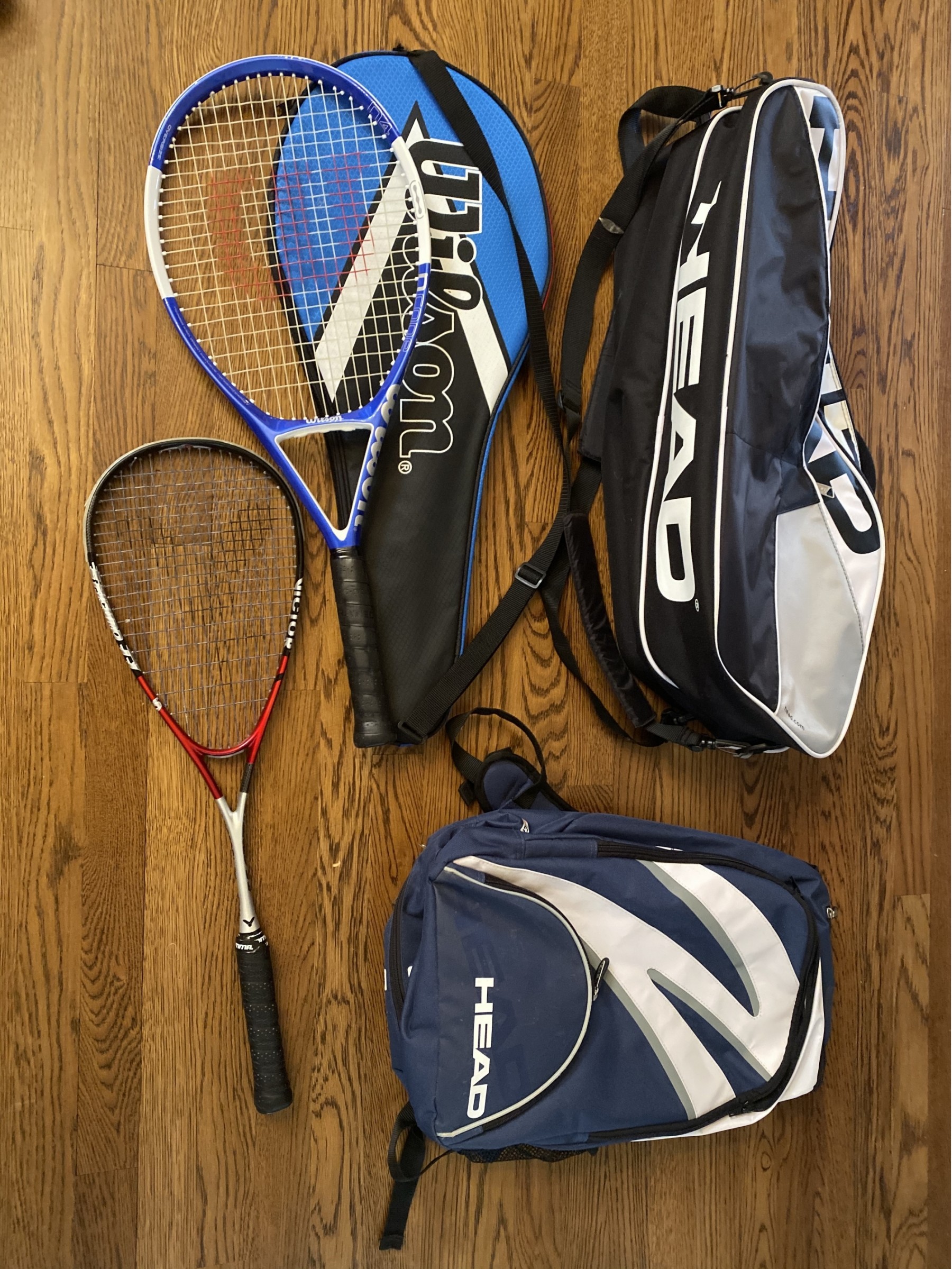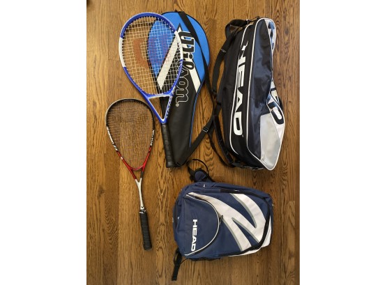 Includes Head tennis bags - backpack and duffle styles, Wilson tennis racket and cover, and Victor squash racket.