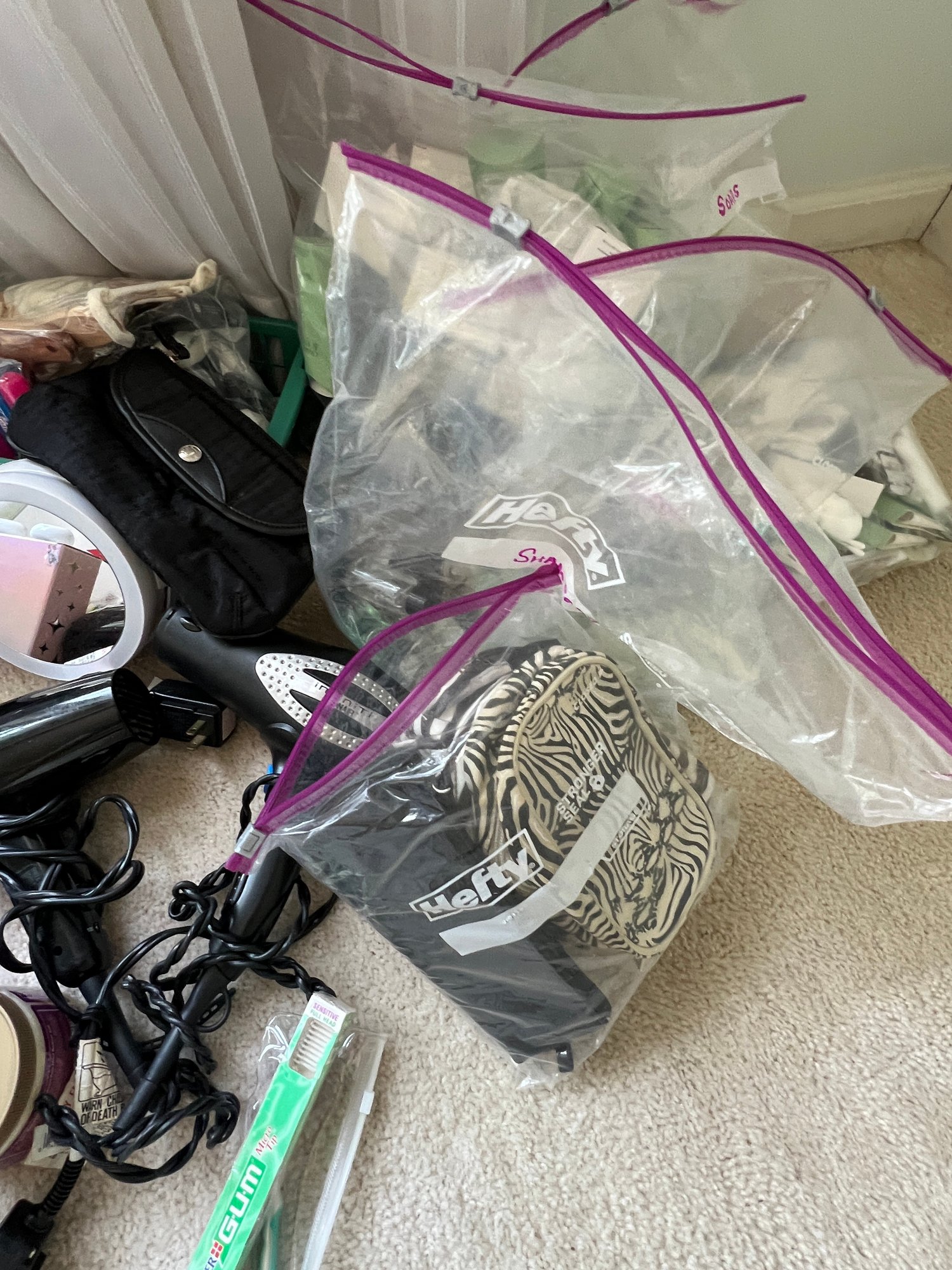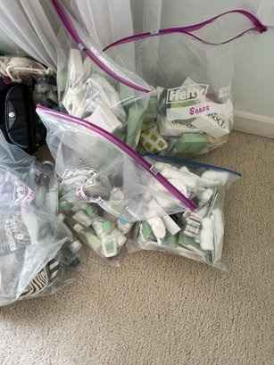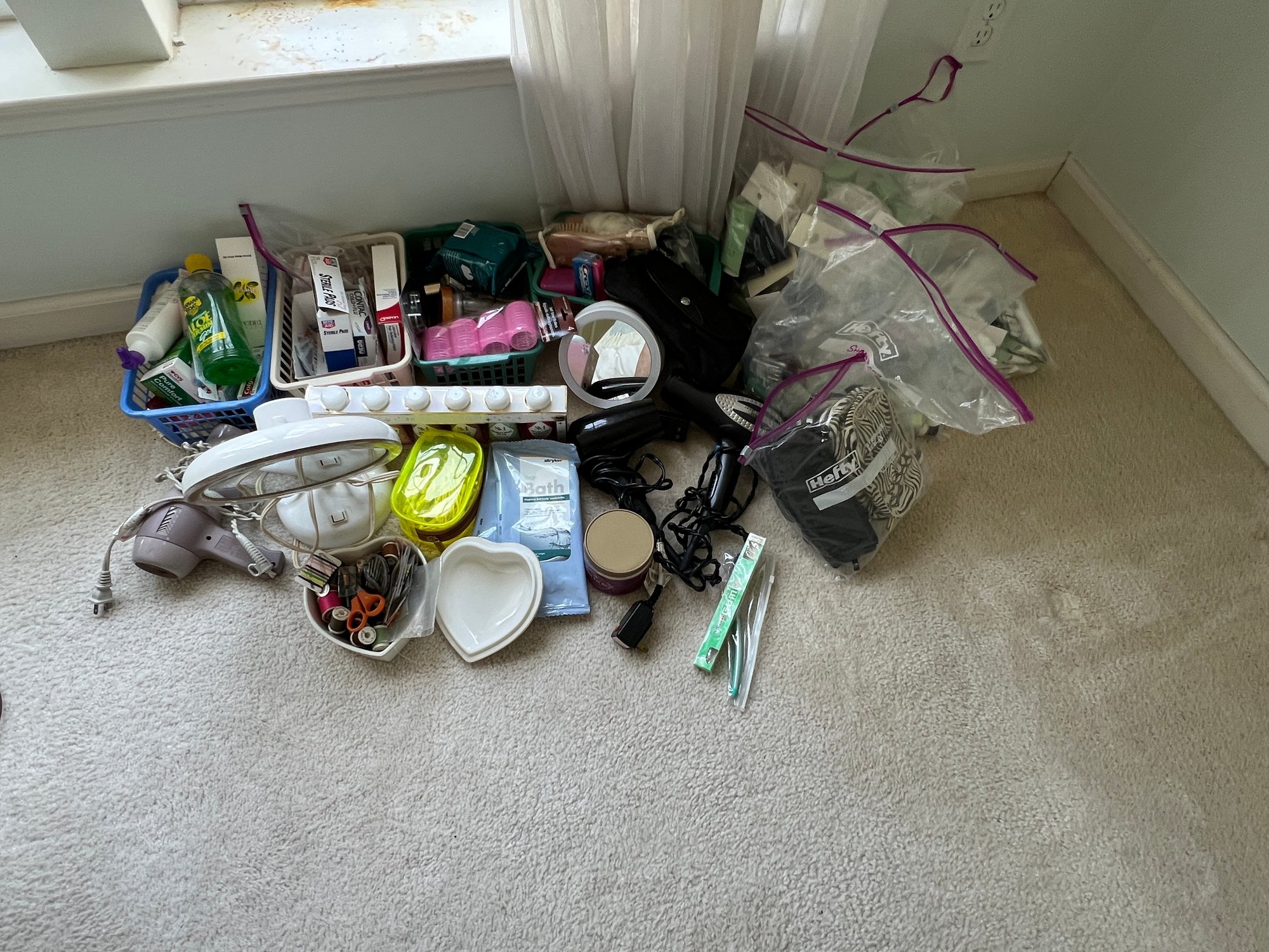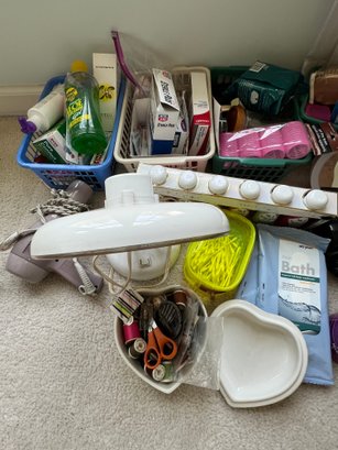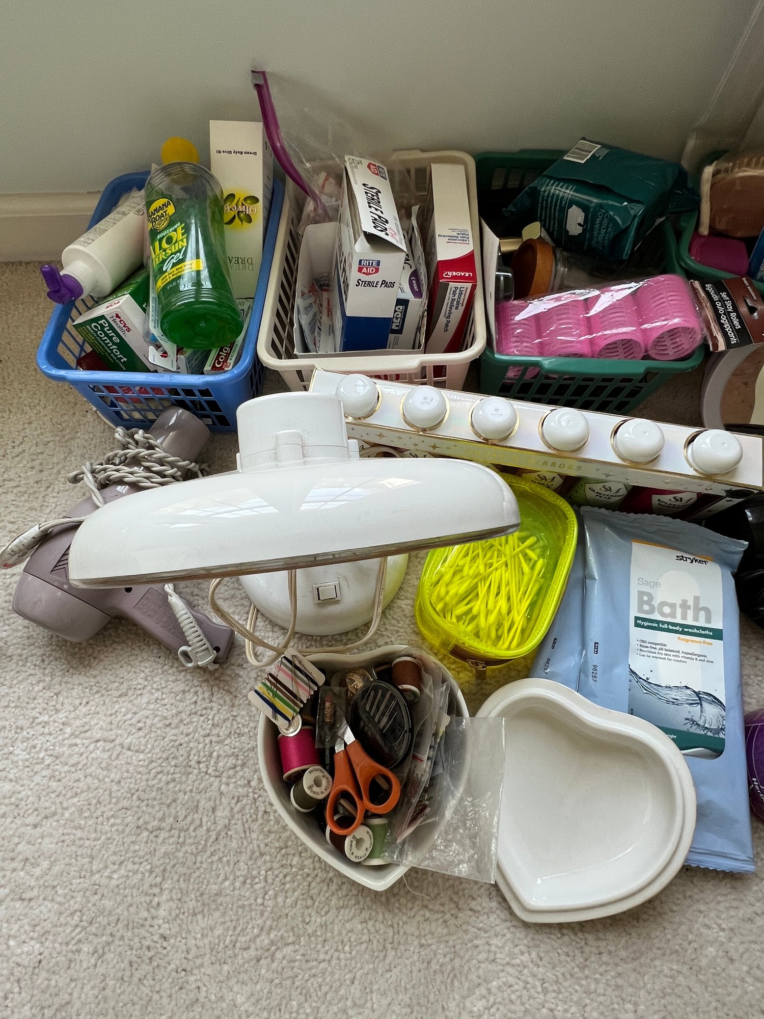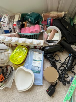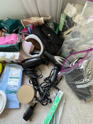 lotions, potions, samples, dryers, make-up mirror, all things for self care