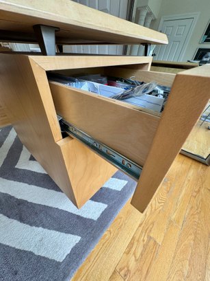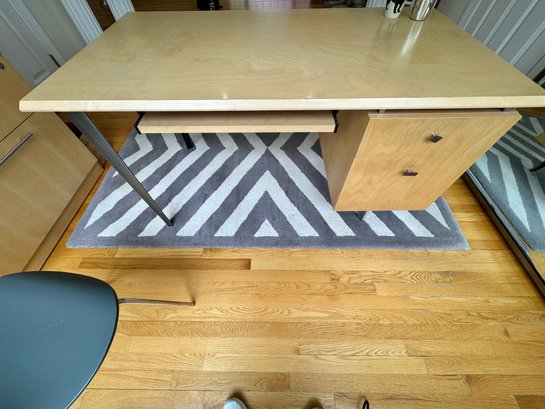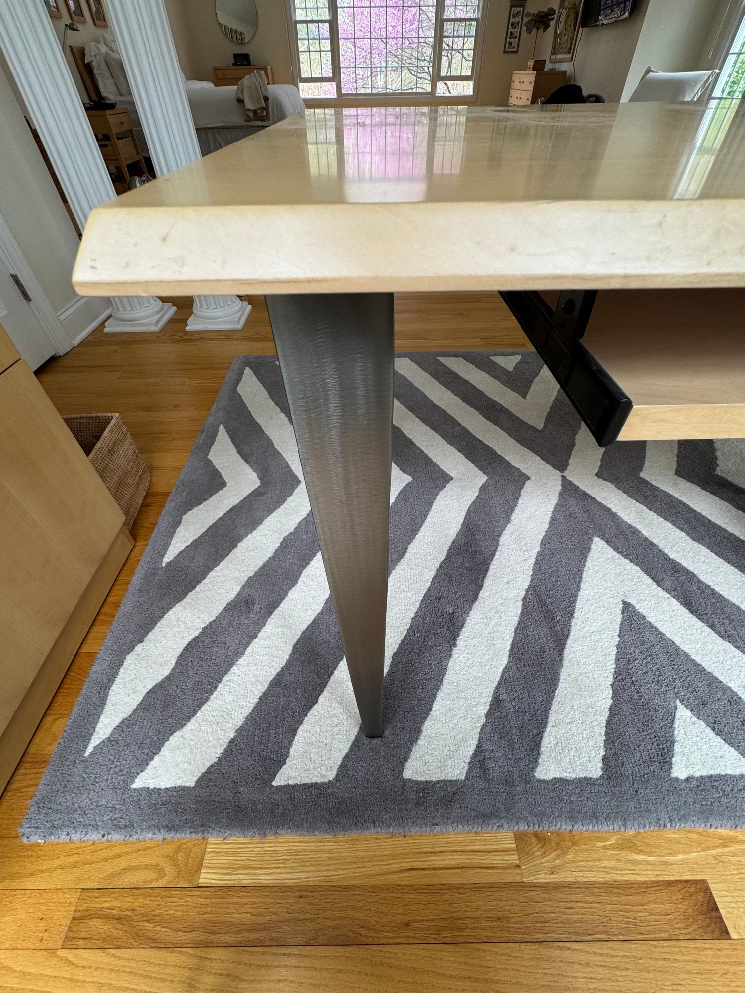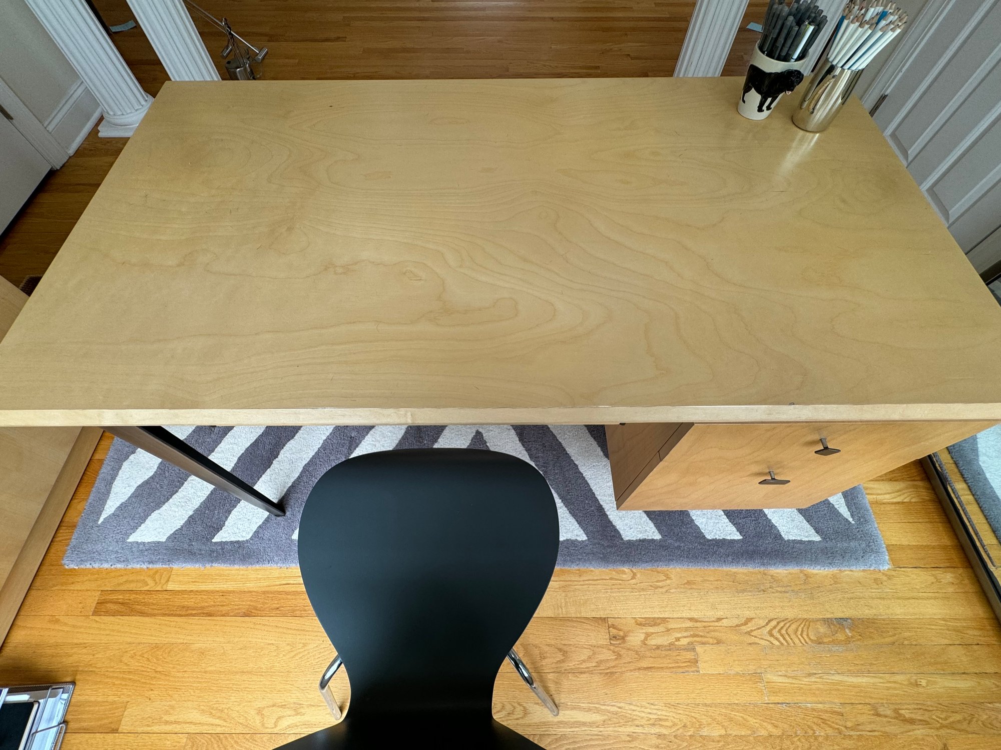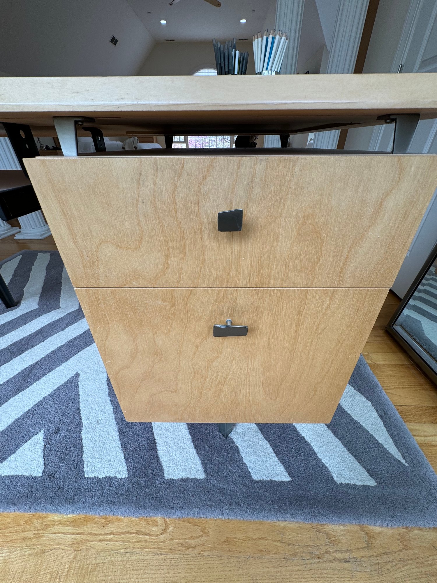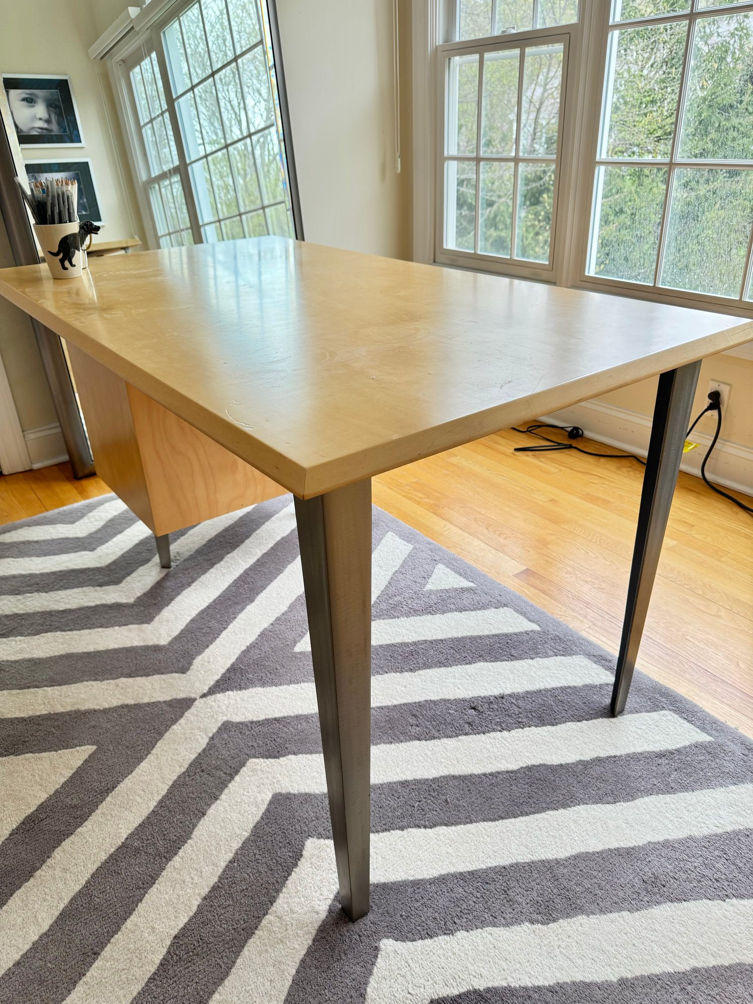 This is a petite and modern desk perfect for a home office as currently shown. It has two side drawers with organically shaped pulls in brushed nickel. It’s top beveled edge and tapered metal legs give the desk a light and airy floating feel. Condition overall very good with minor finish wear.