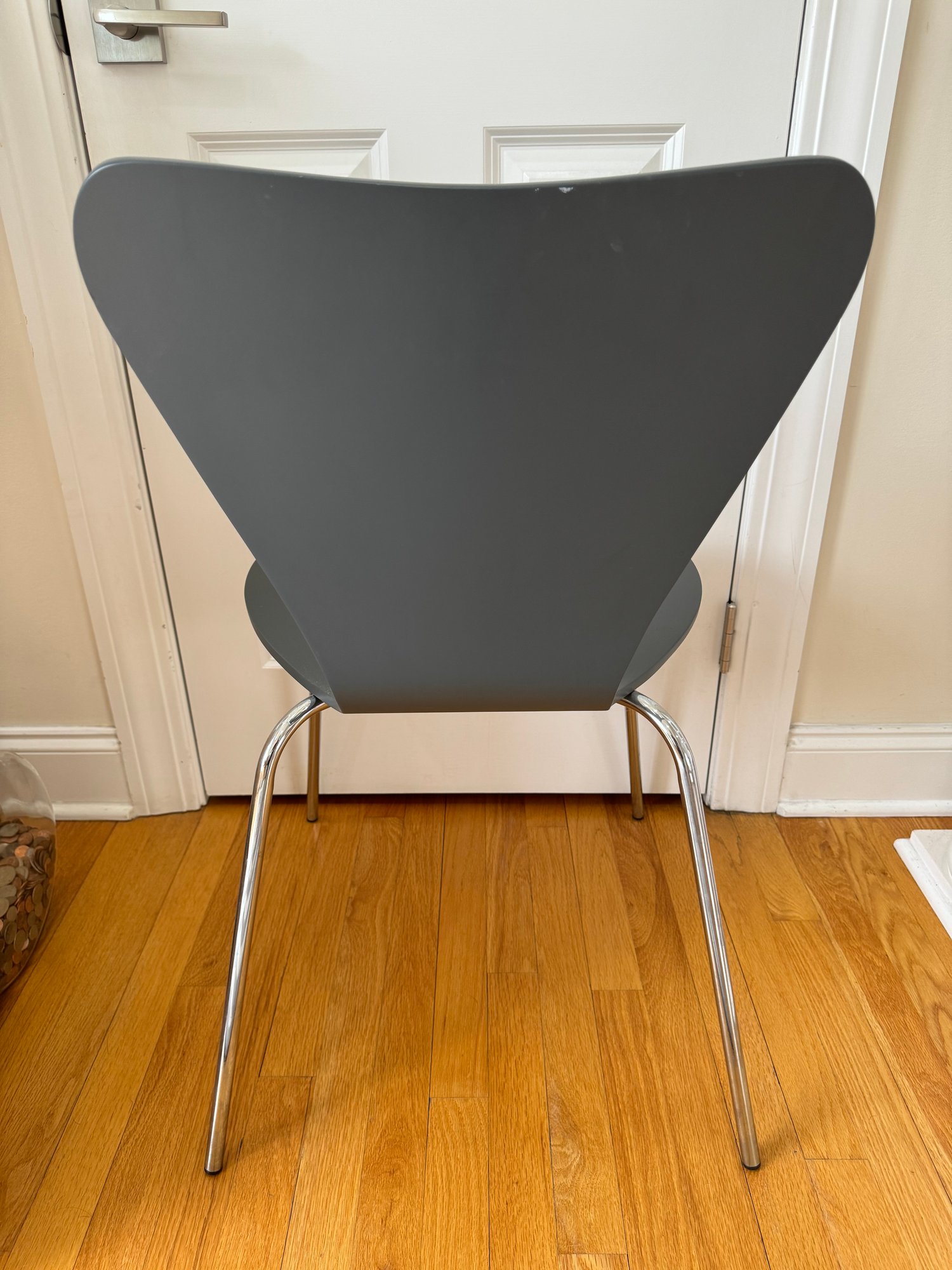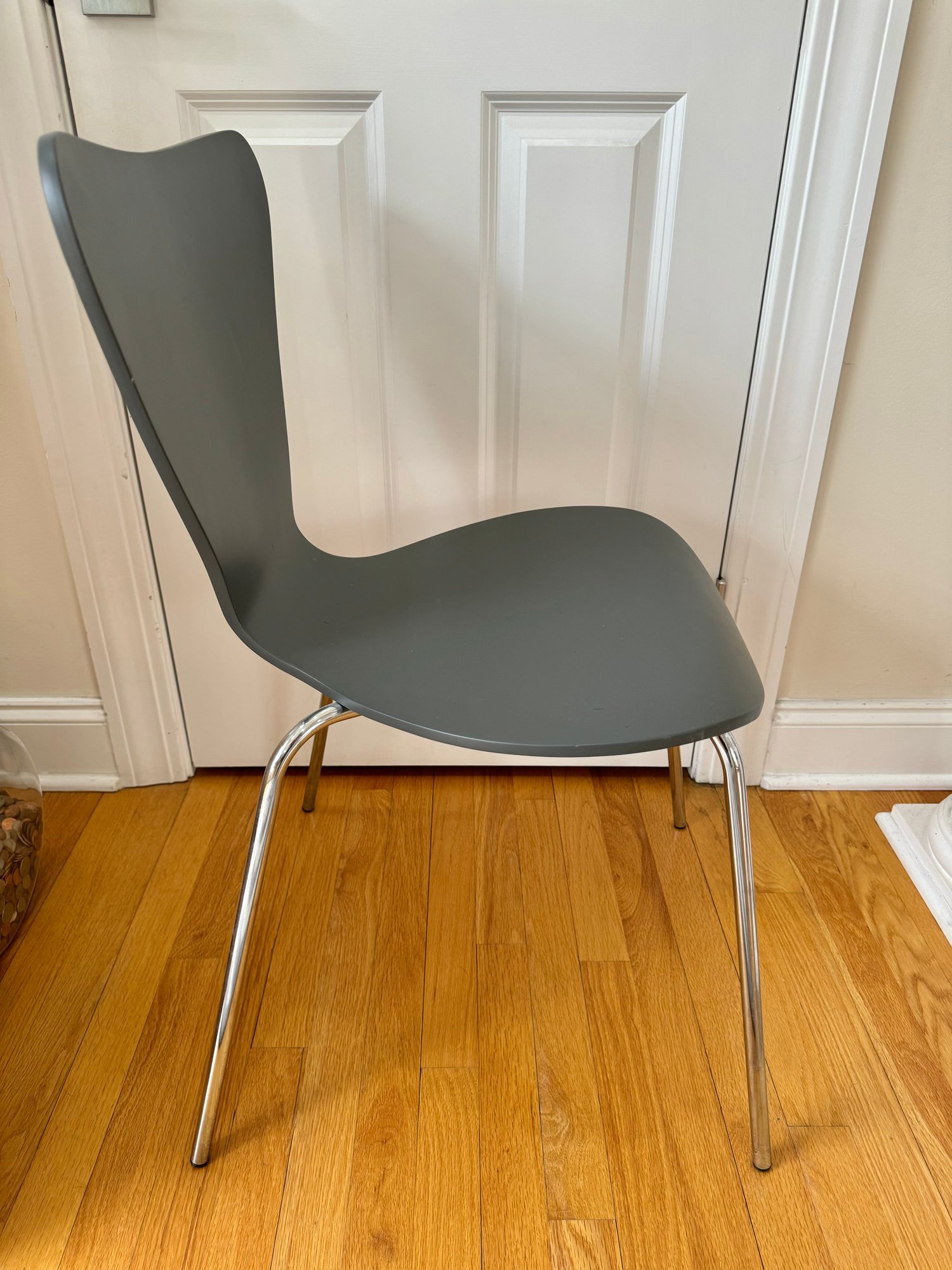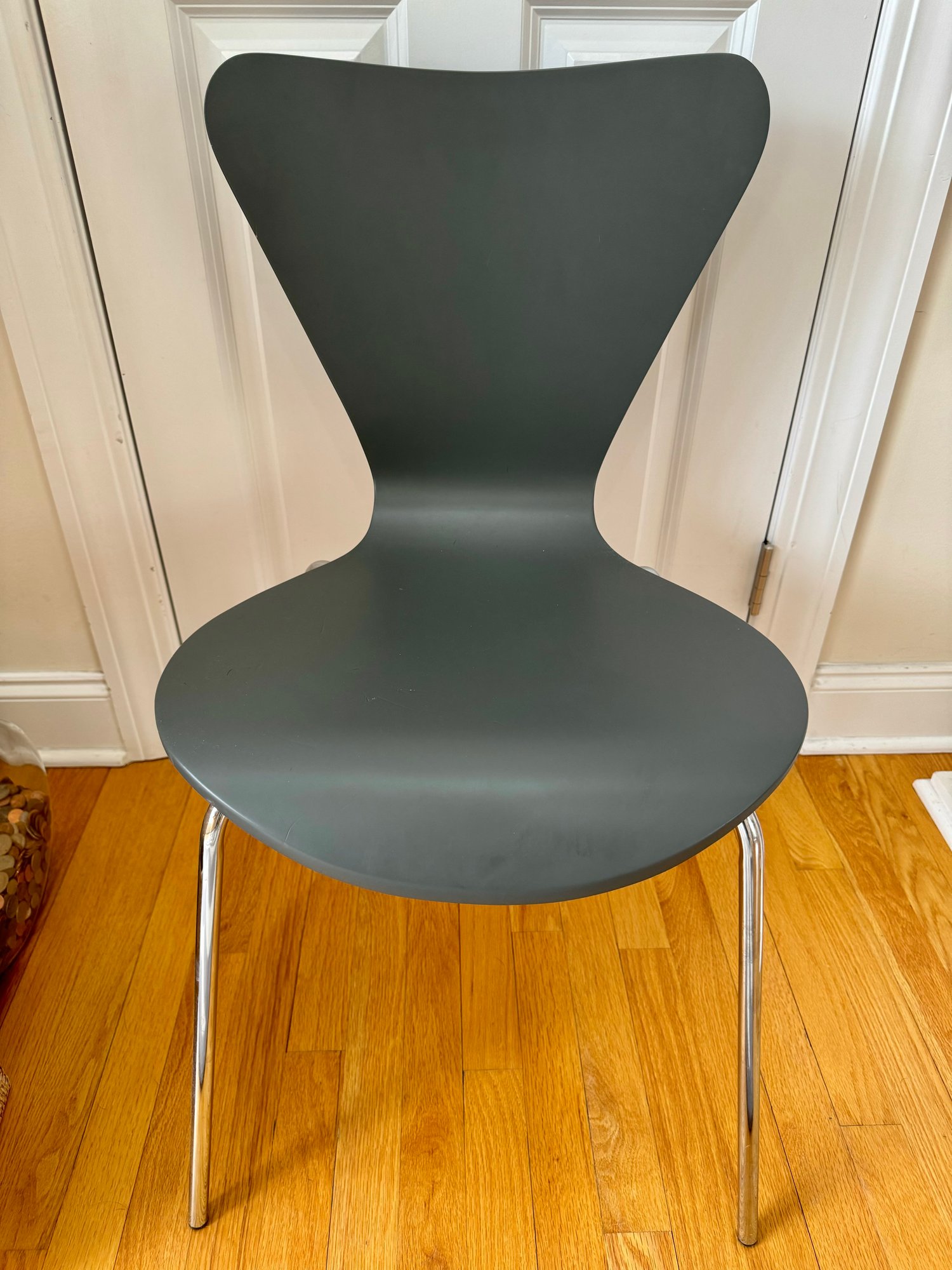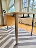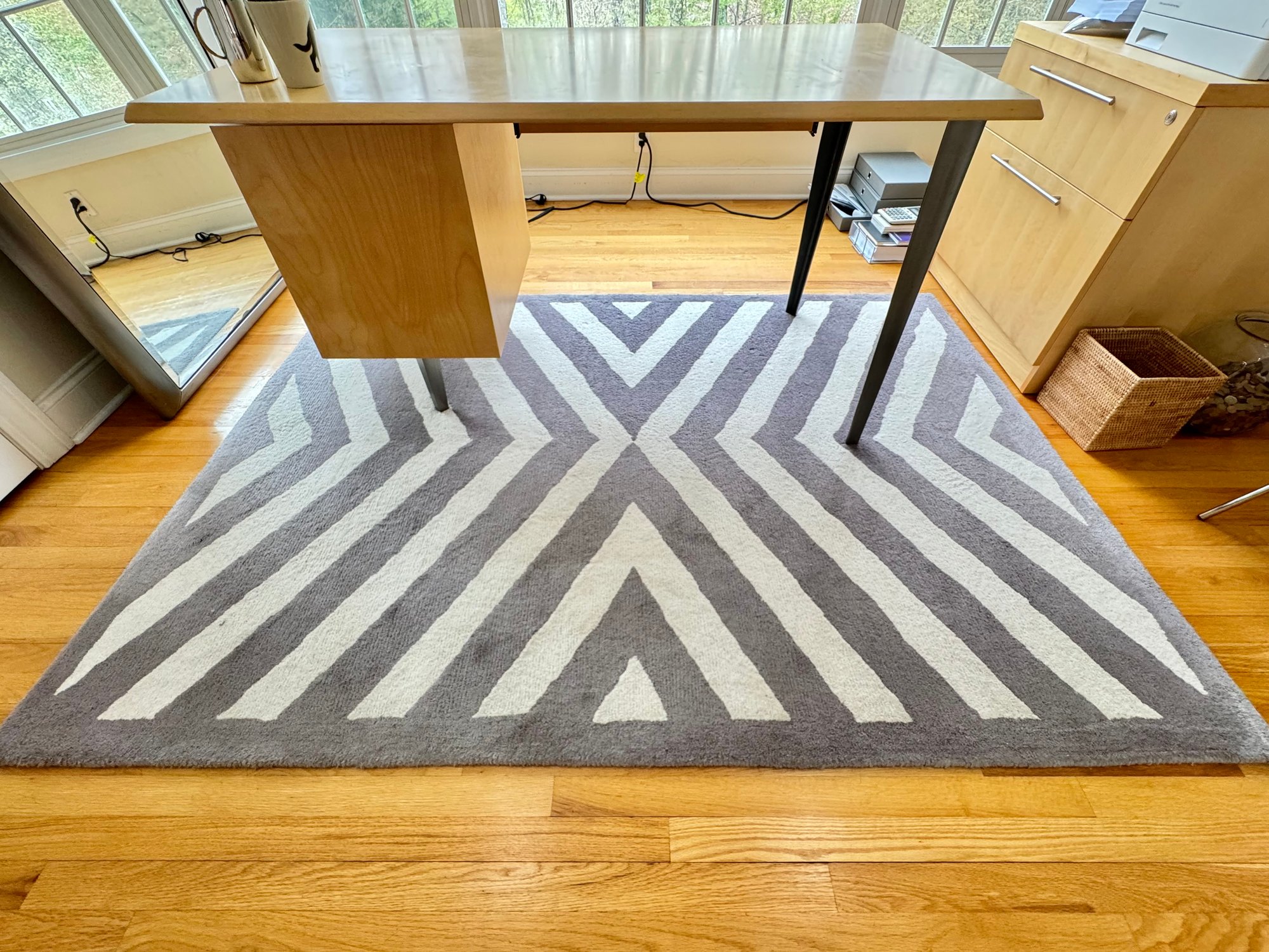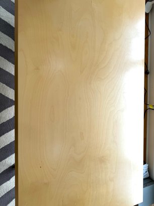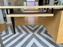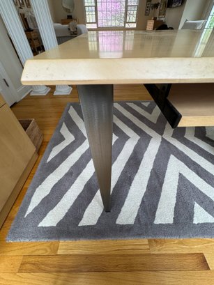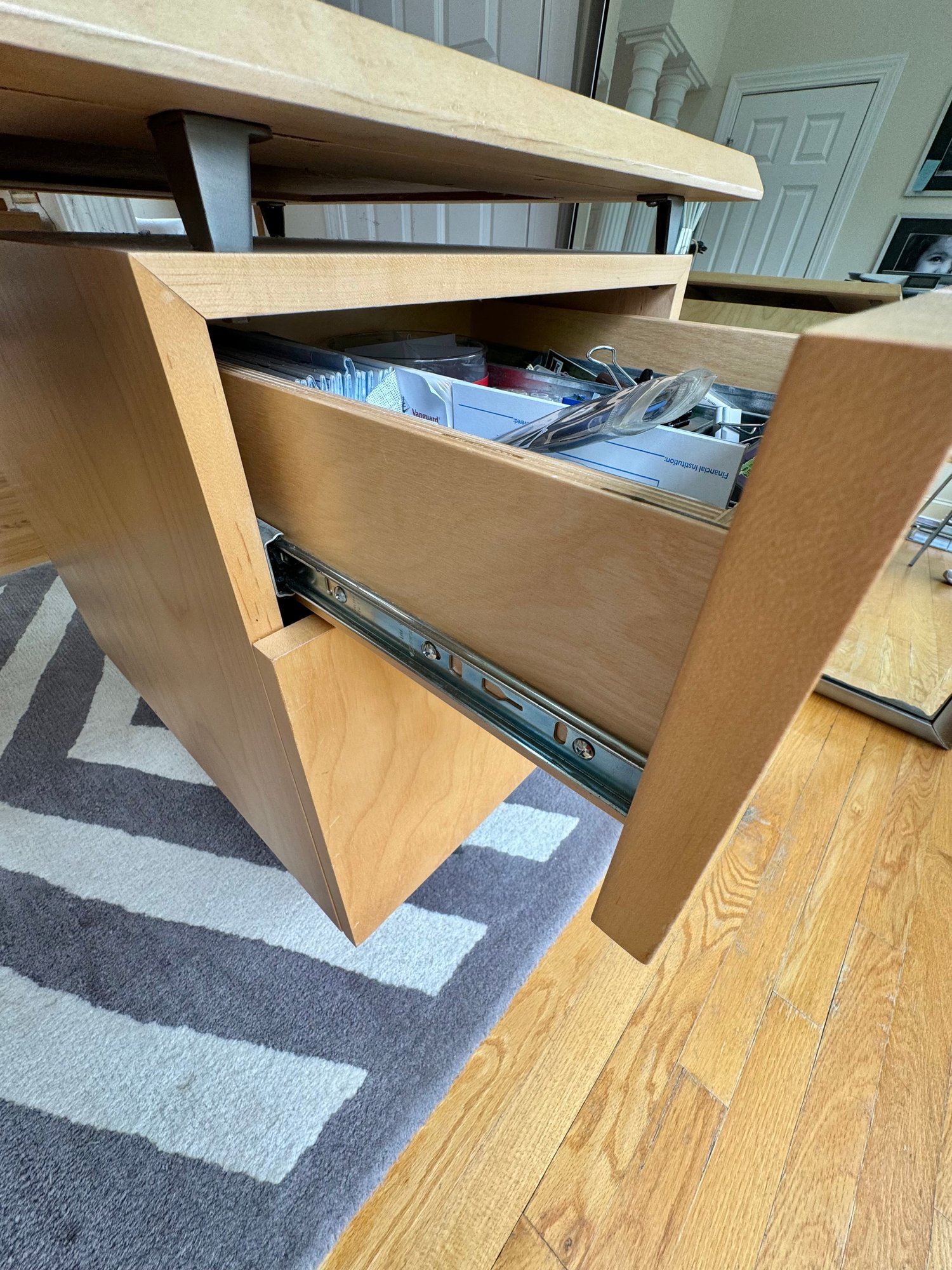 This is a petite and modern desk perfect for a home office as currently shown. It has two side drawers with organically shaped pulls in brushed nickel. It’s top beveled edge and tapered metal legs give the desk a light and airy floating feel. Condition overall very good with minor finish wear.