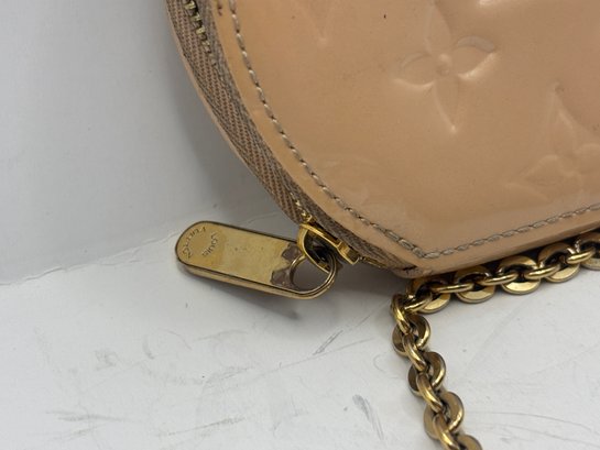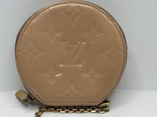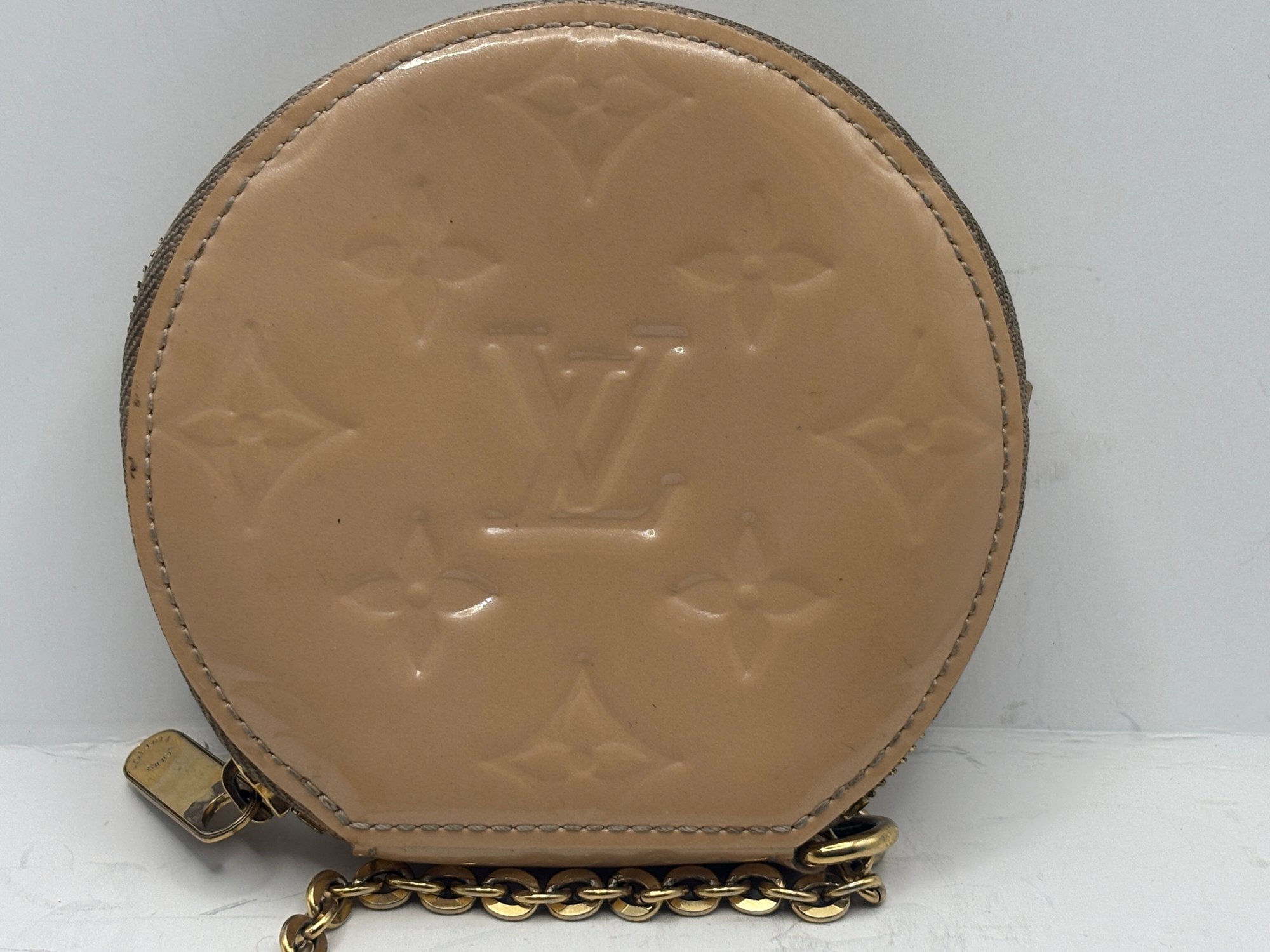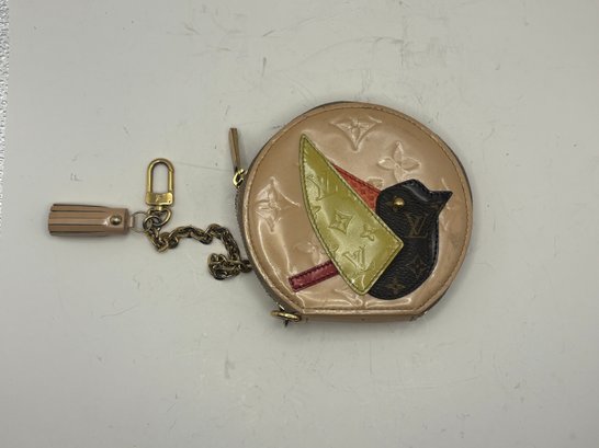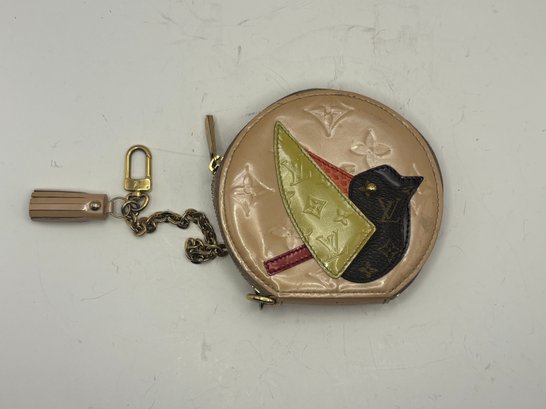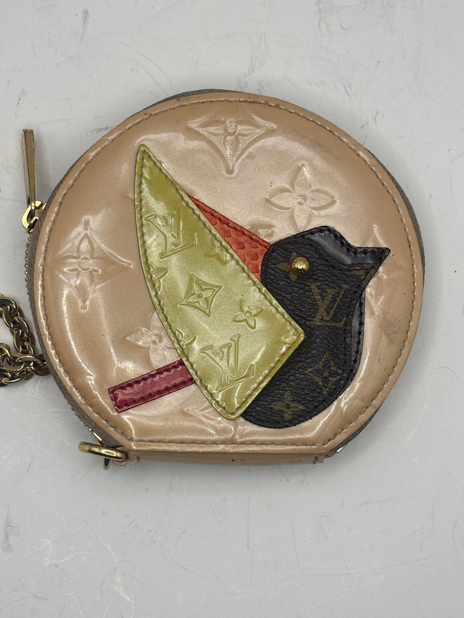 Charming Louis Vuitton round coin purse crafted in beige Vernis monogram leather and accented with a playful bird motif in mixed leather and coated canvas. The dimensional applique design gives this piece a whimsical, collectible feel, while the polished gold-tone chain and lobster clasp allow it to clip easily to a handbag, belt loop, or key ring.