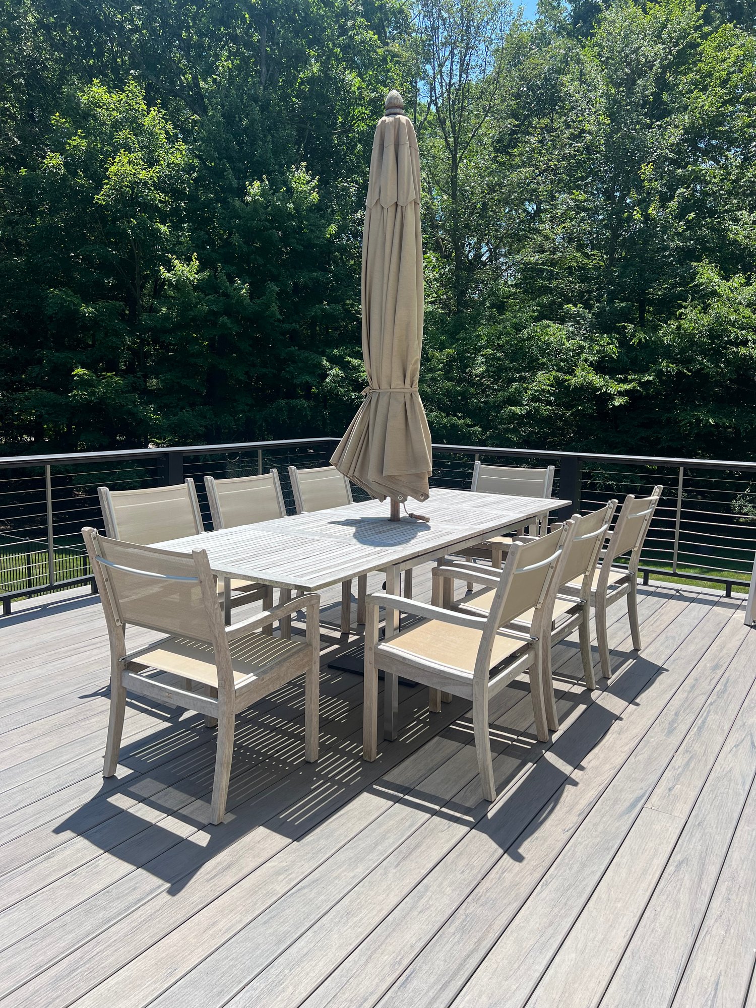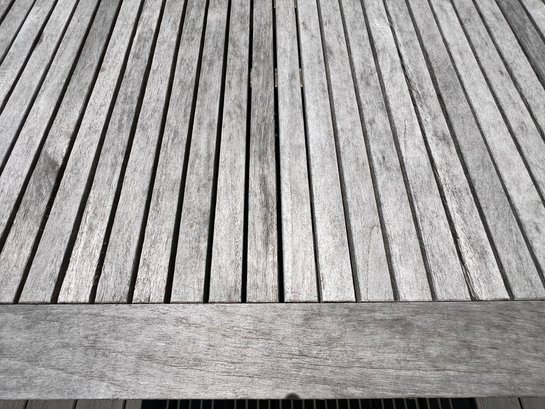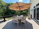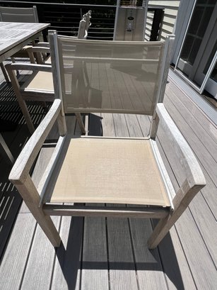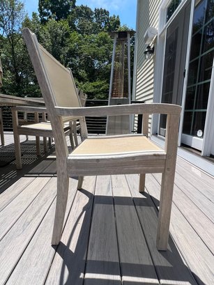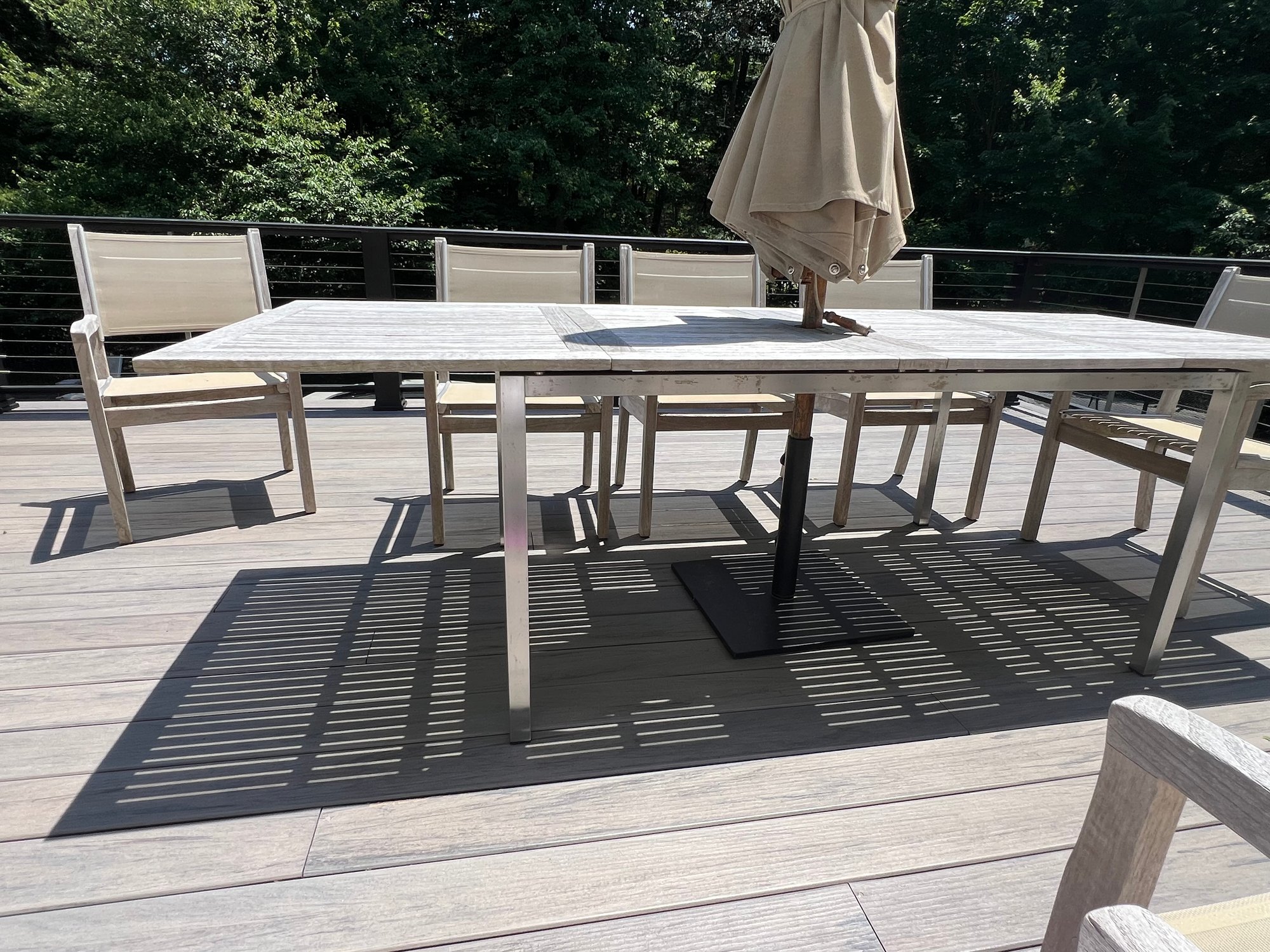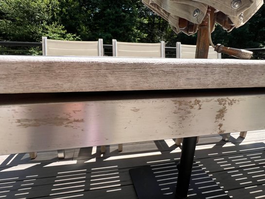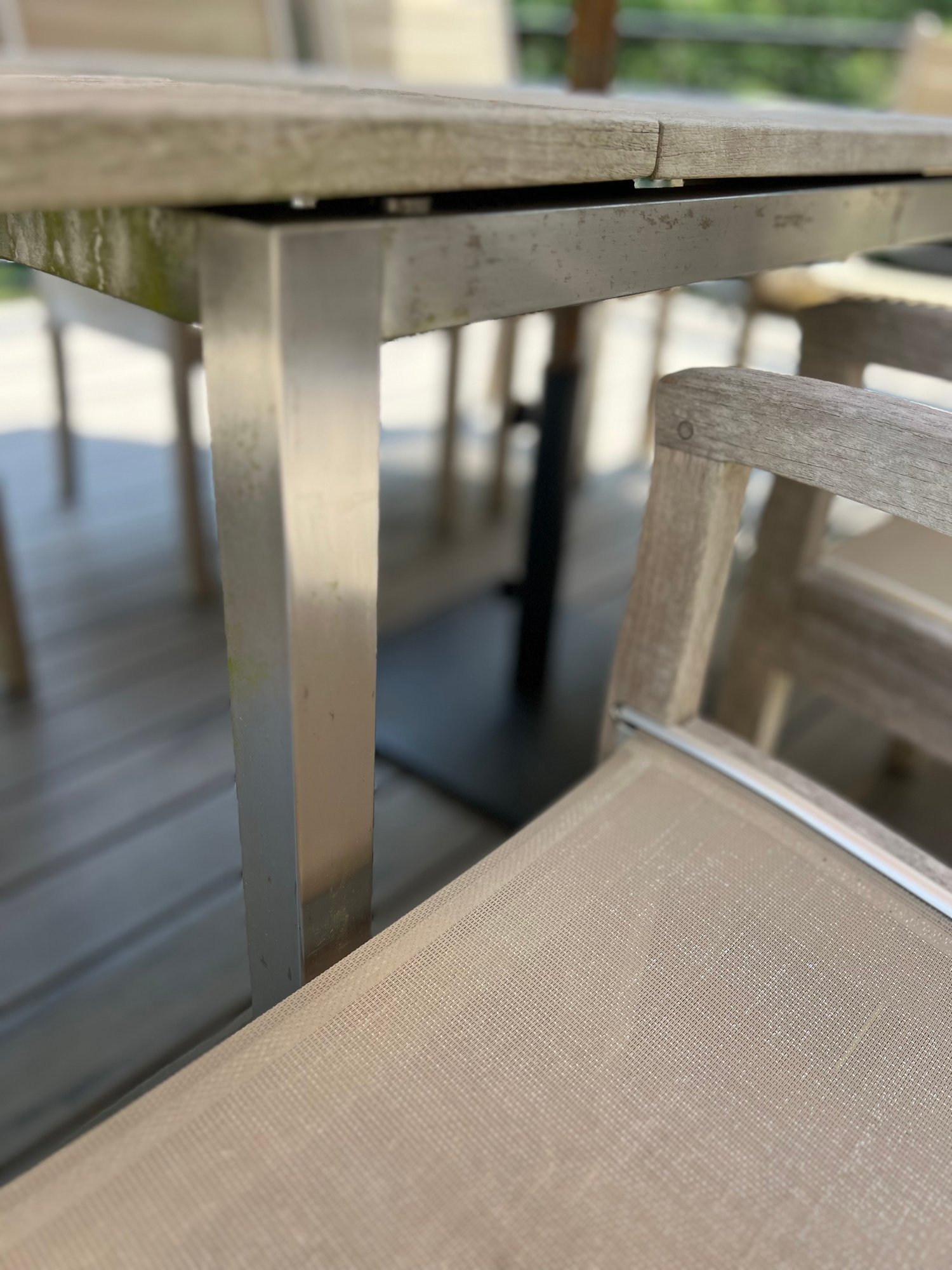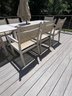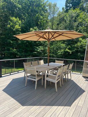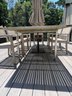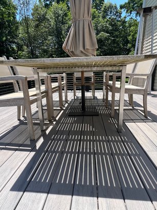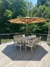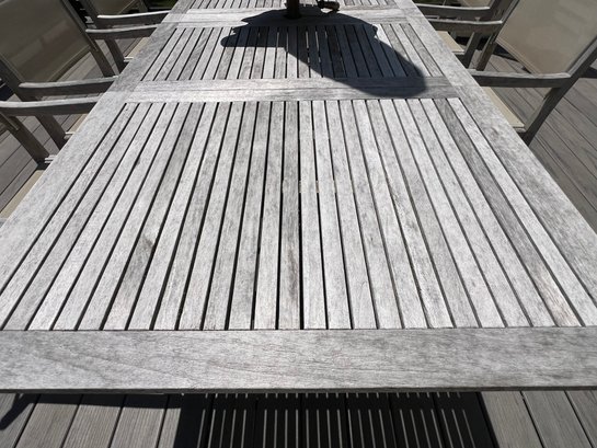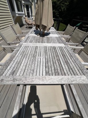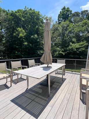 Quality Gloster Teak slat top dining table with aluminum base frame & adjustable leaves. Chairs are mesh with an contemporary aluminum design detail. Umbrella is a quality tan canvas with wood frame on heavy black metal square base.