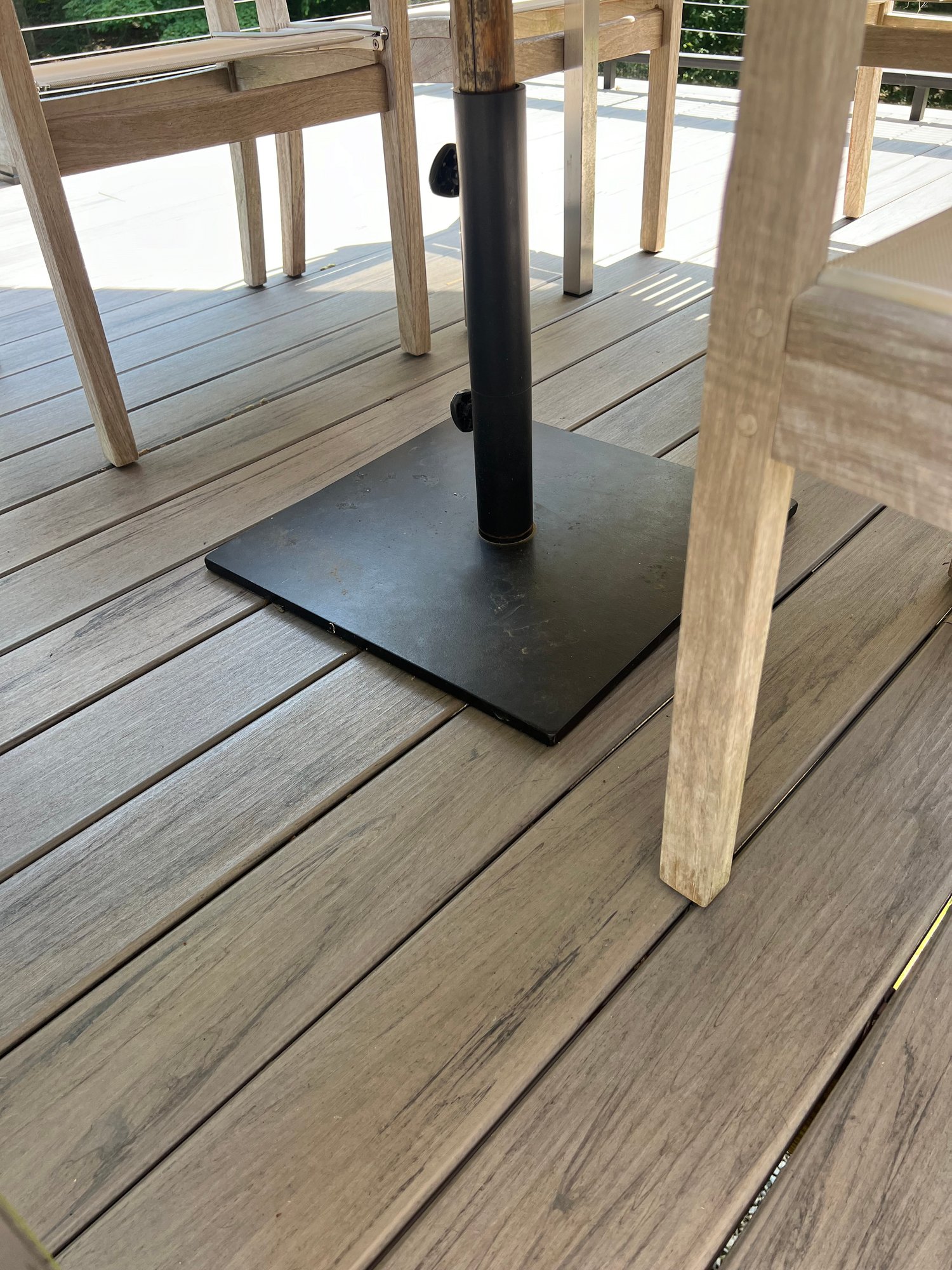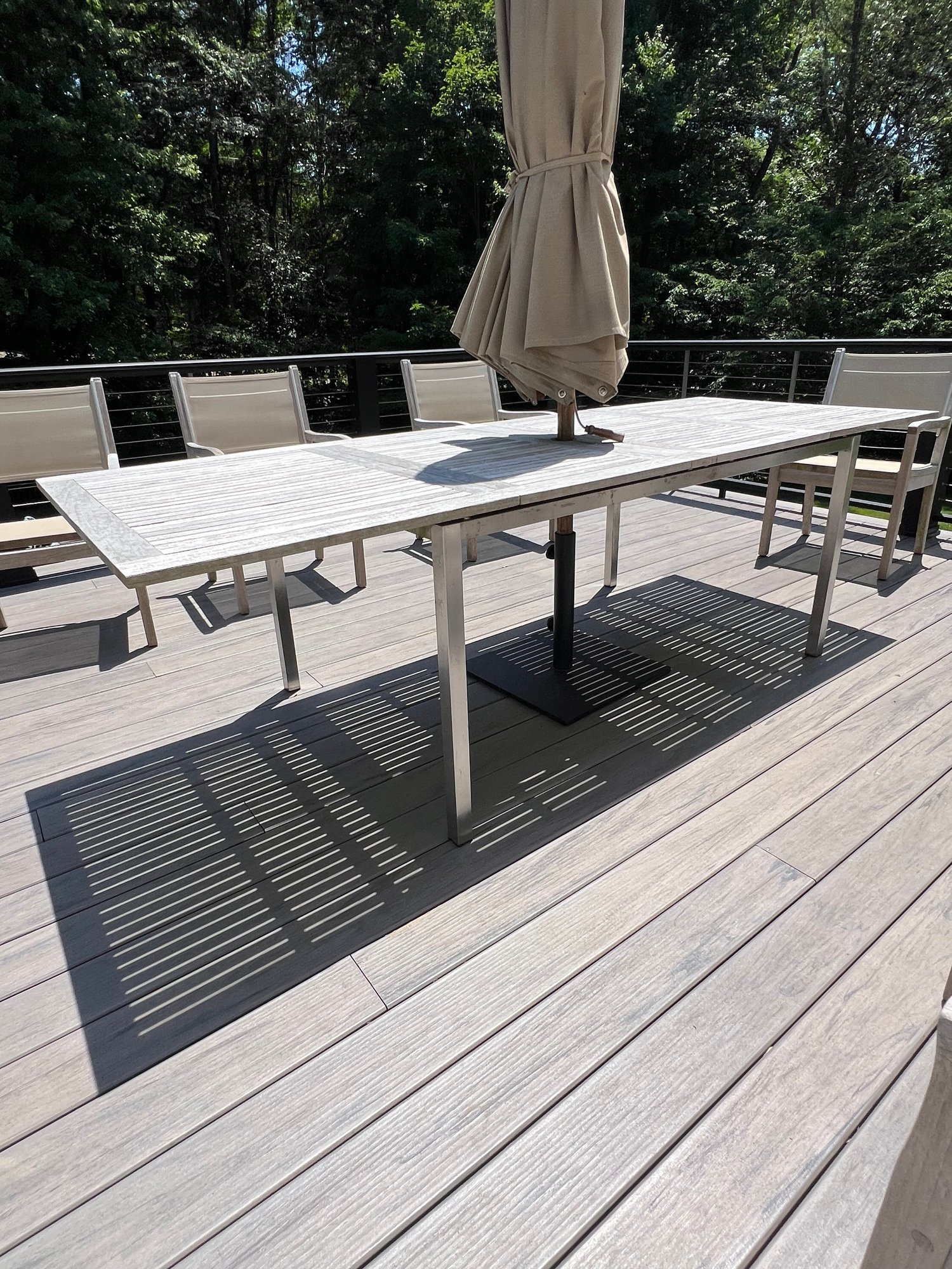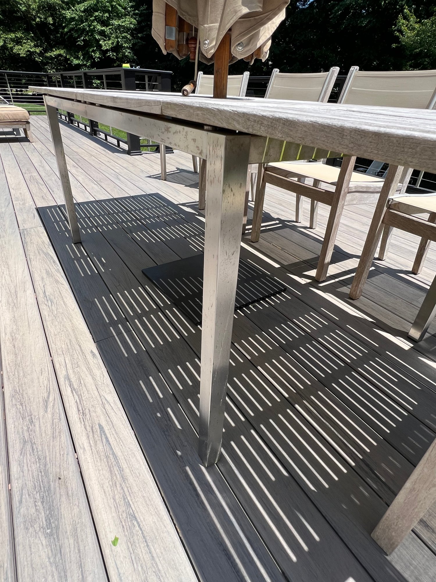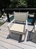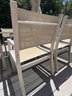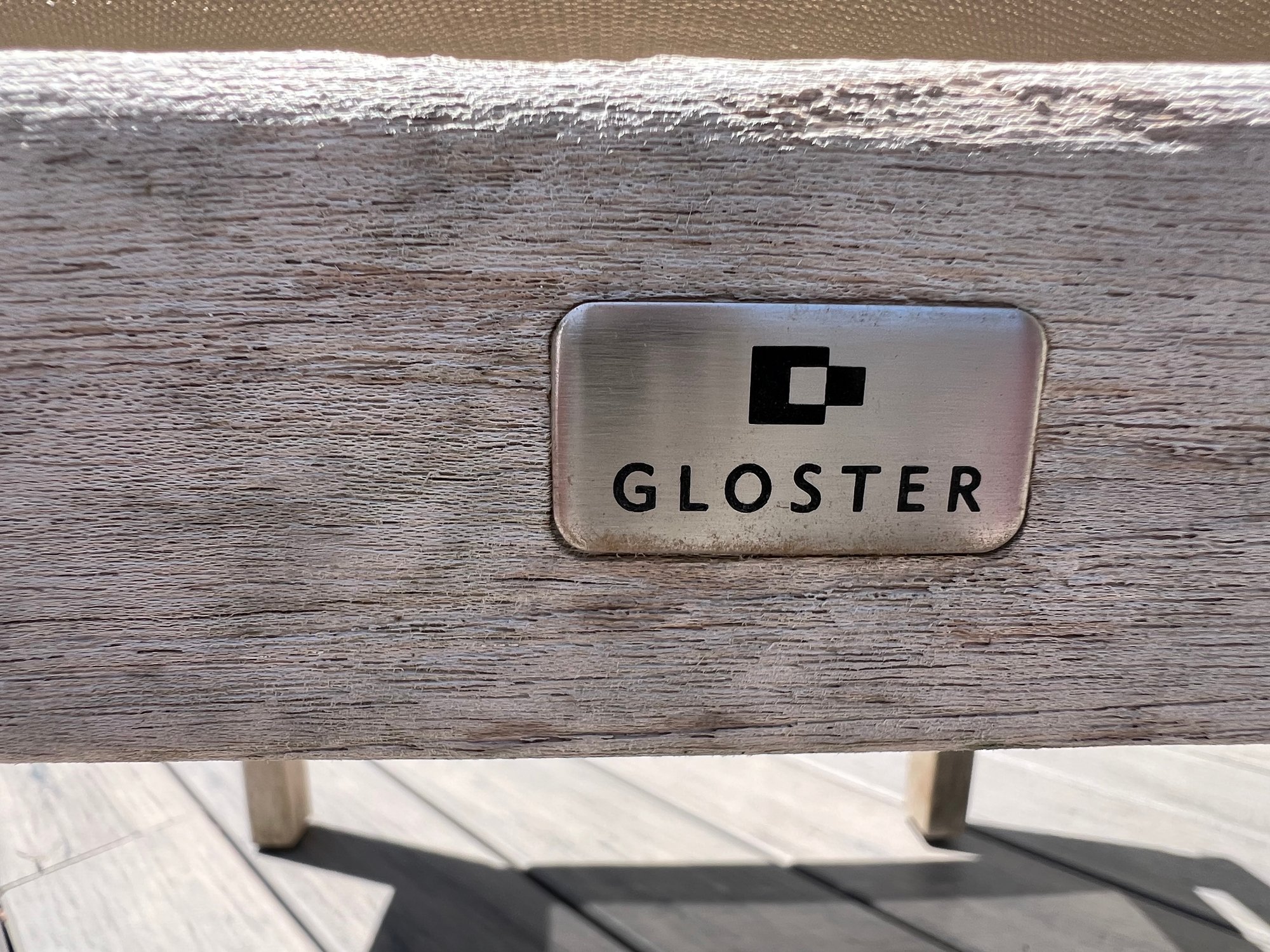 Quality Gloster Teak slat top dining table with aluminum base frame & adjustable leaves. Chairs are mesh with an contemporary aluminum design detail. Umbrella is a quality tan canvas with wood frame on heavy black metal square base.