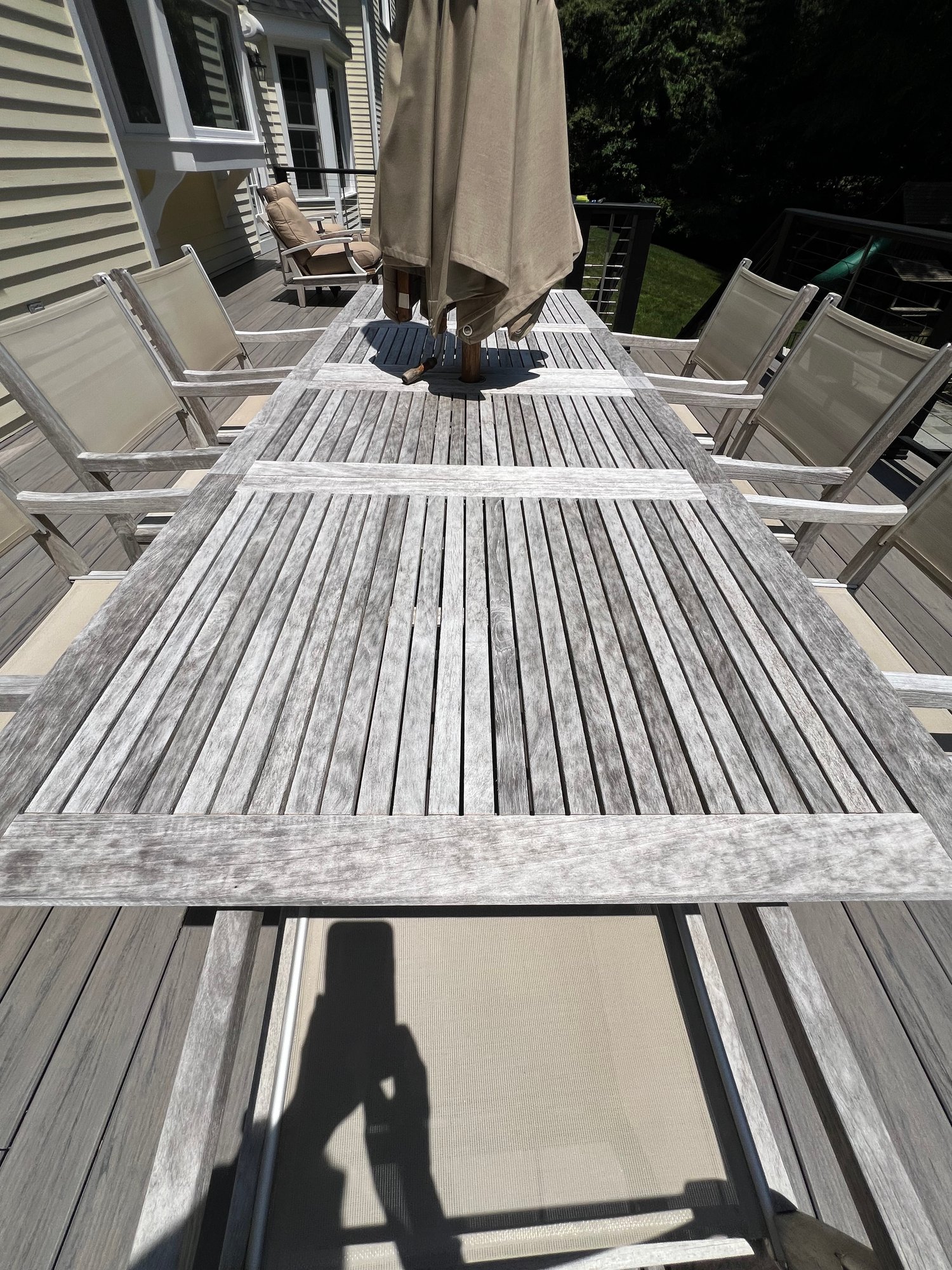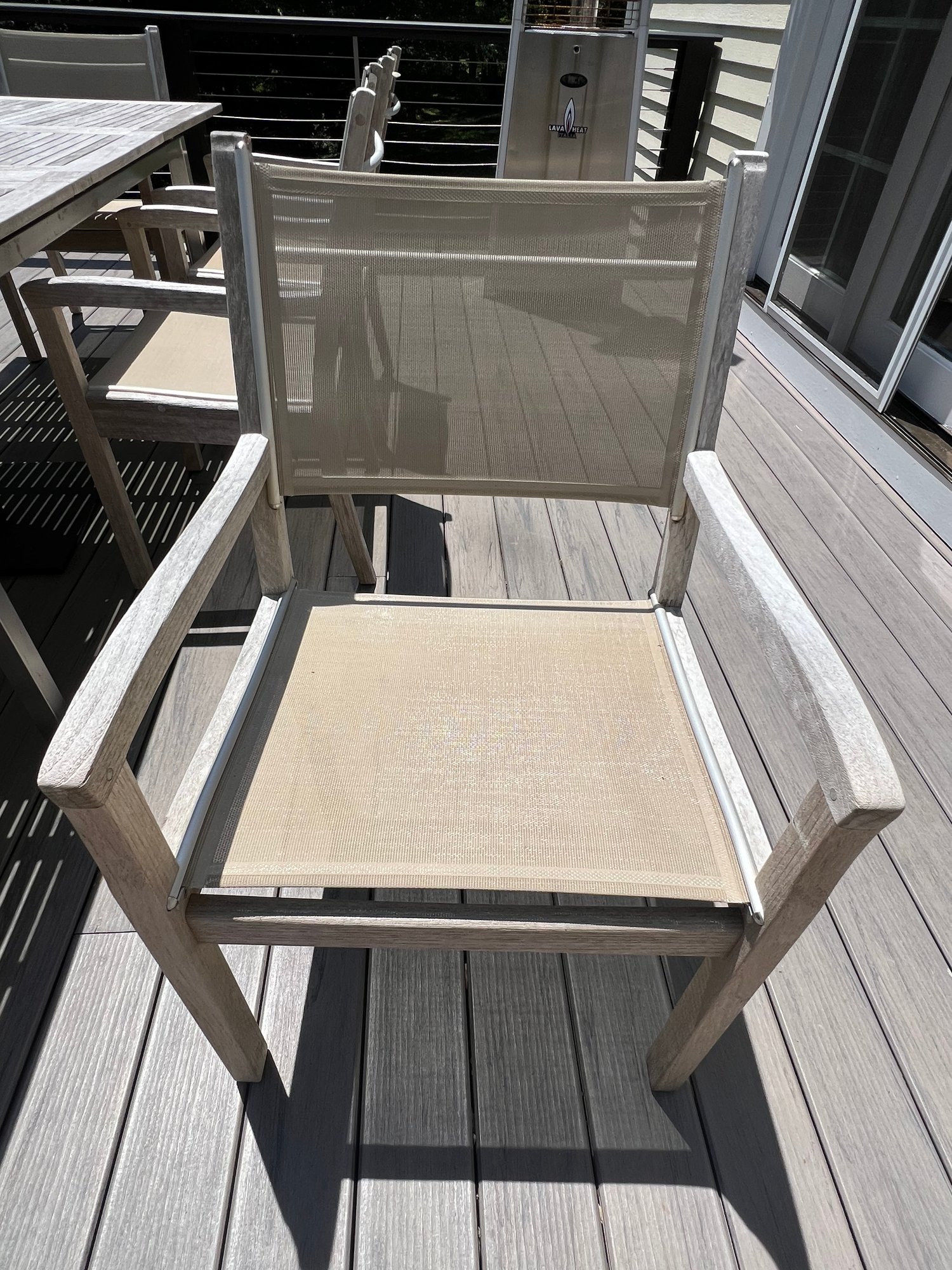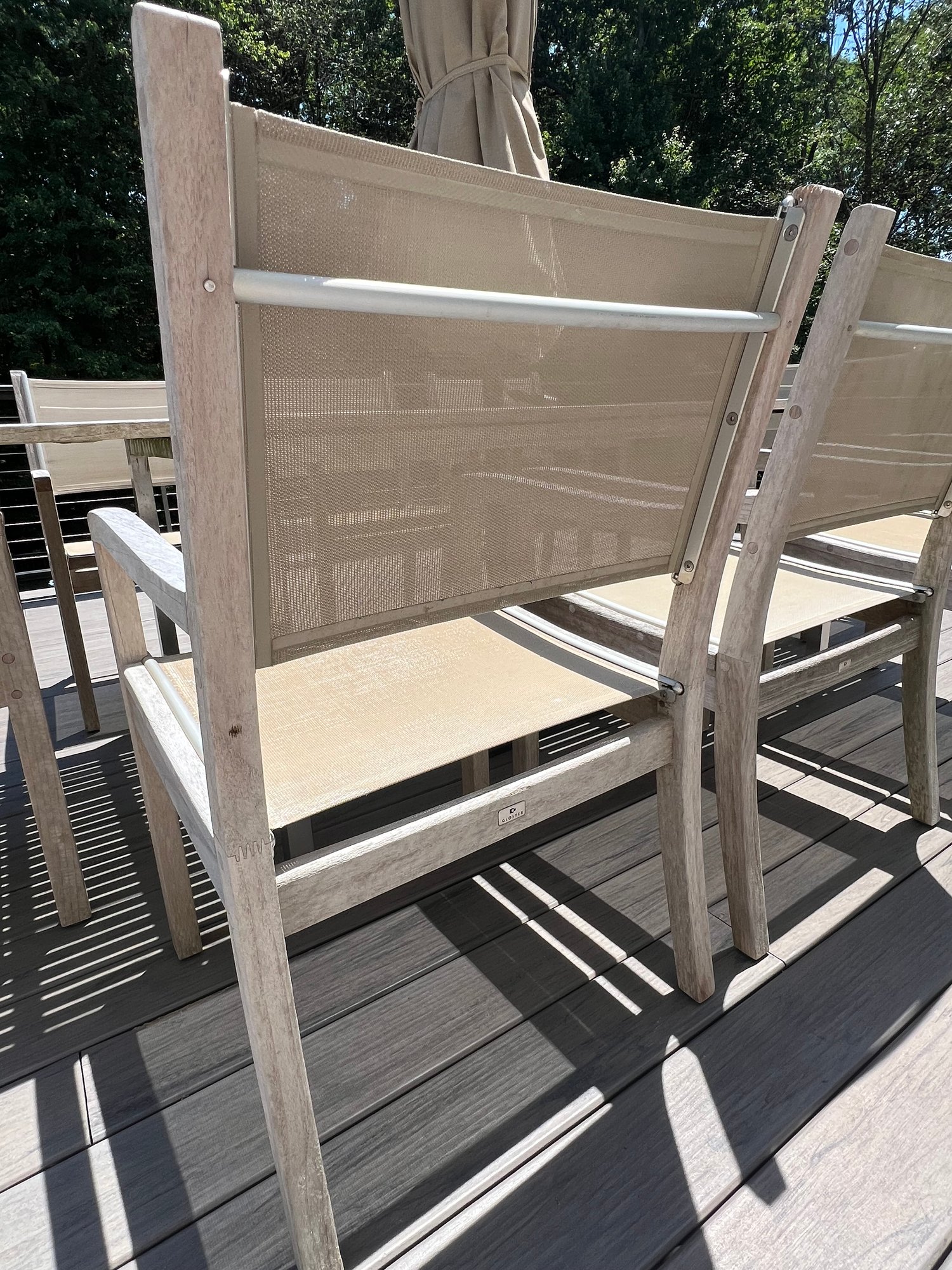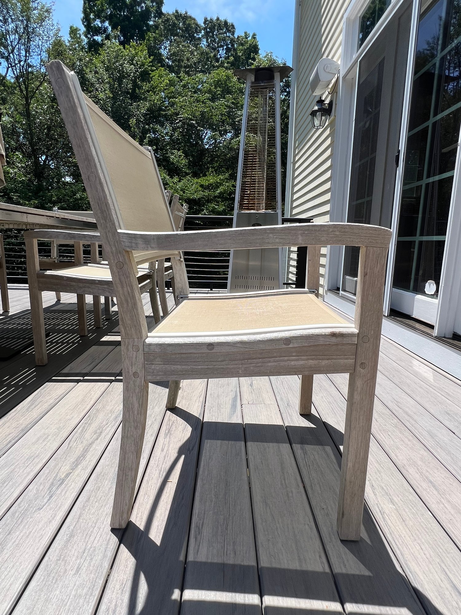 Condition overall good and a very good looking set - table has crack near umbrella hole from storm uplifting umbrella The crack is small & not structural. One chair has corner mesh tear on top edge. Teak finish is little rough to hand feel & consistent with outdoor use from not utlizing a outdoor table cover. Lovely set and just in time for summertime dinner parties!