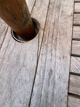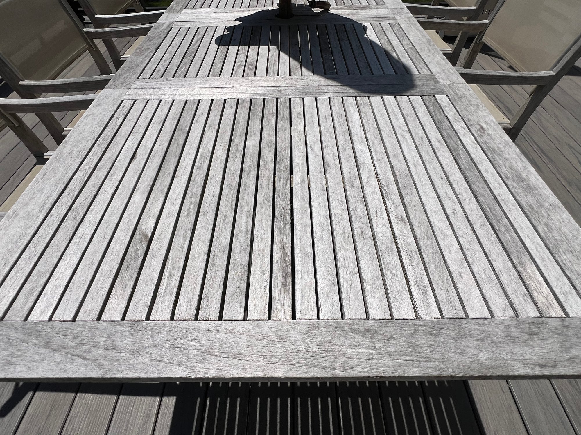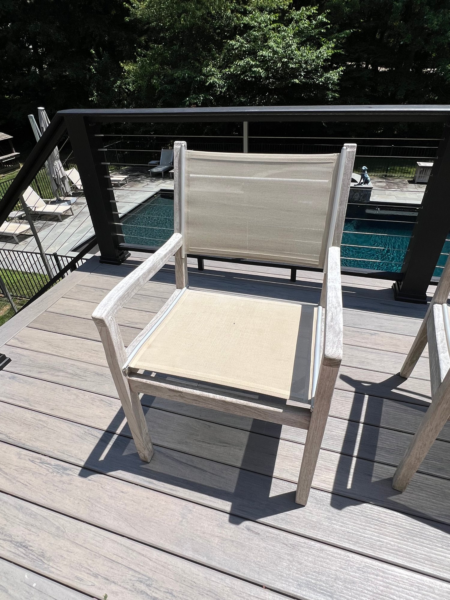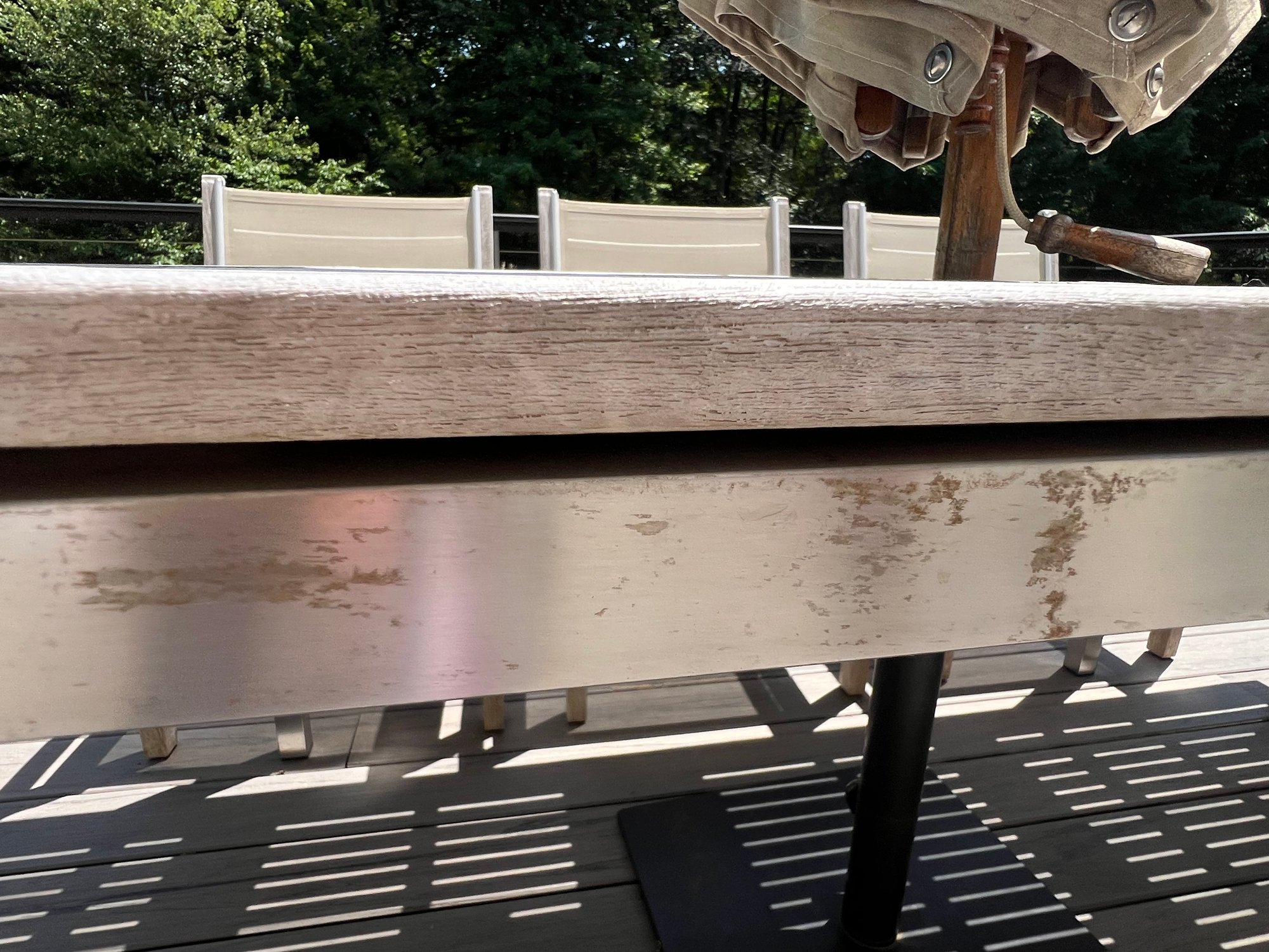 Condition overall good and a very good looking set - table has crack near umbrella hole from storm uplifting umbrella The crack is small & not structural. One chair has corner mesh tear on top edge. Teak finish is little rough to hand feel & consistent with outdoor use from not utlizing a outdoor table cover. Lovely set and just in time for summertime dinner parties!
