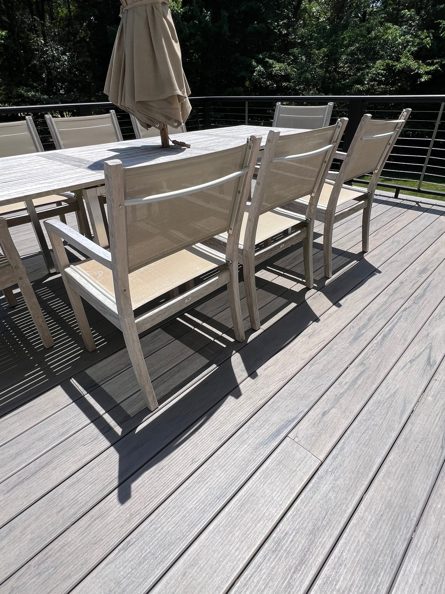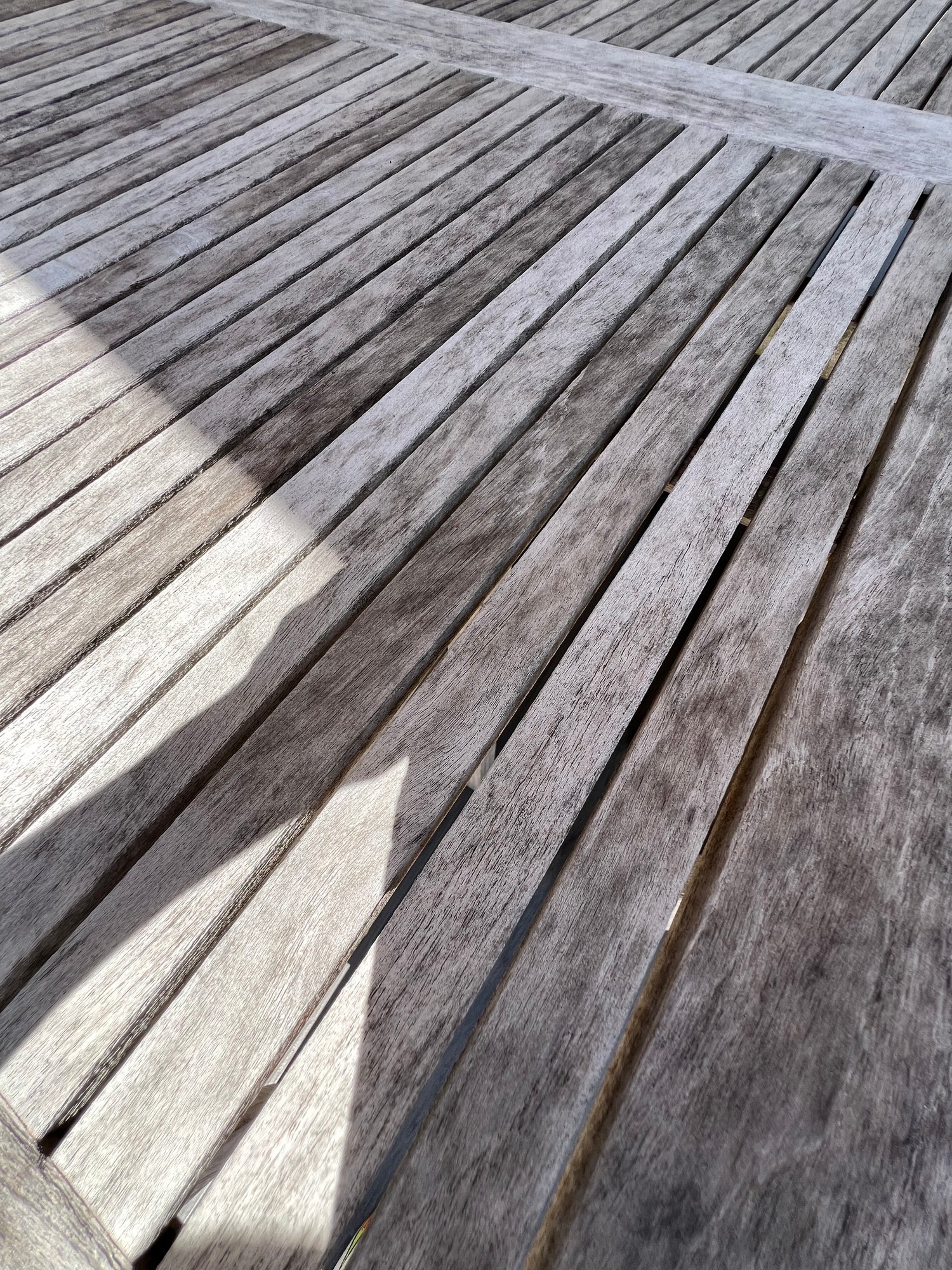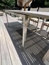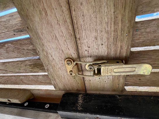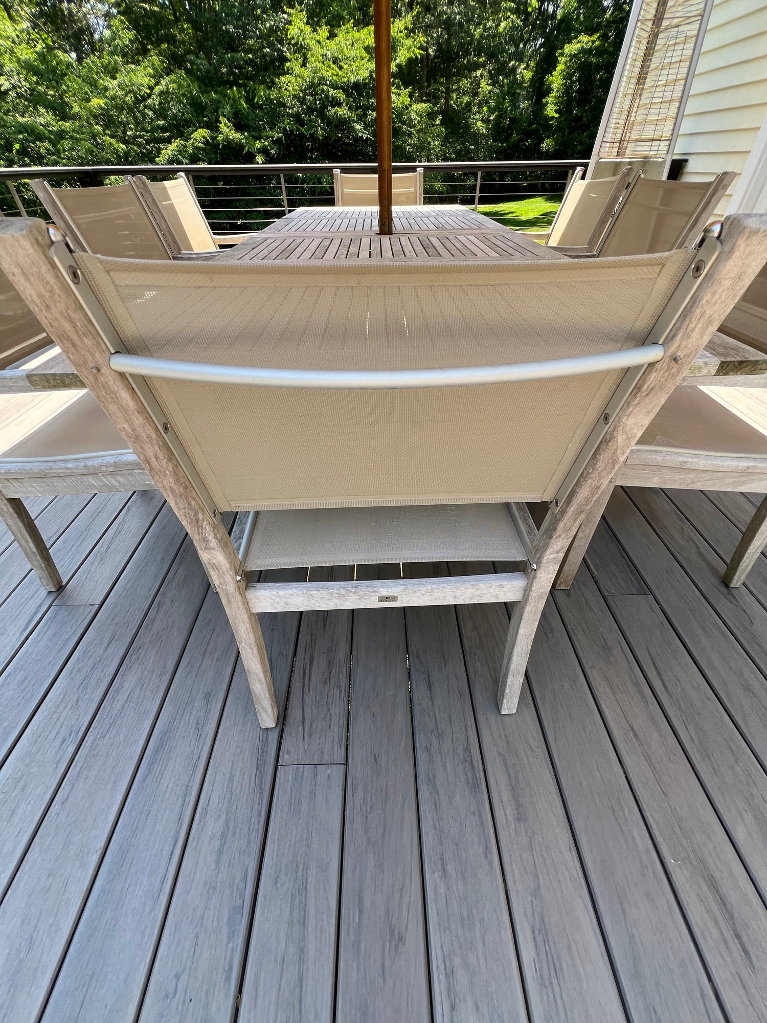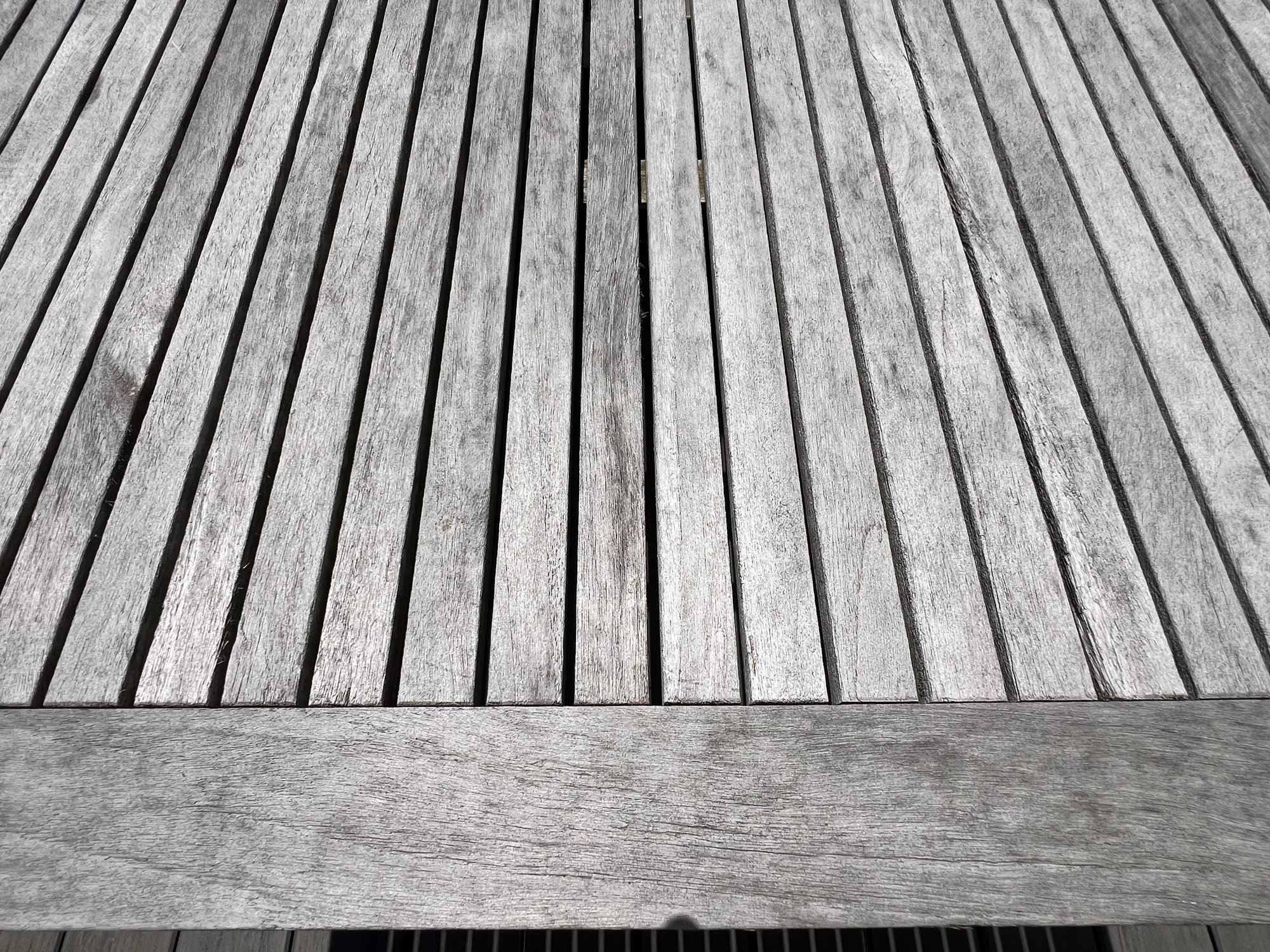 Condition overall good and a very good looking set - table has crack near umbrella hole from storm uplifting umbrella The crack is small & not structural. One chair has corner mesh tear on top edge. Teak finish is little rough to hand feel & consistent with outdoor use from not utlizing a outdoor table cover. Lovely set and just in time for summertime dinner parties!
