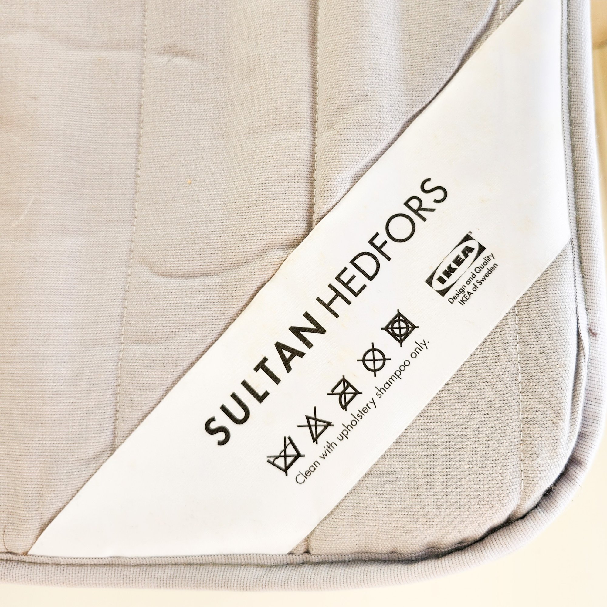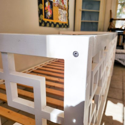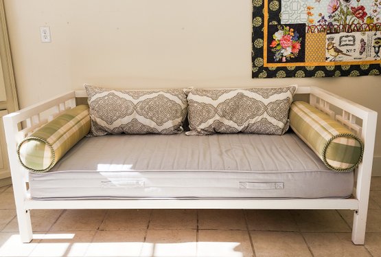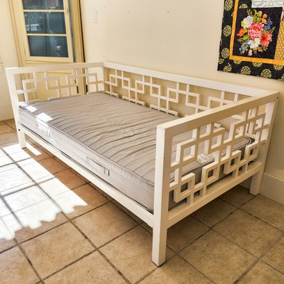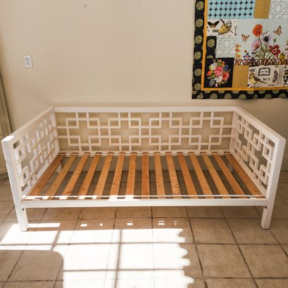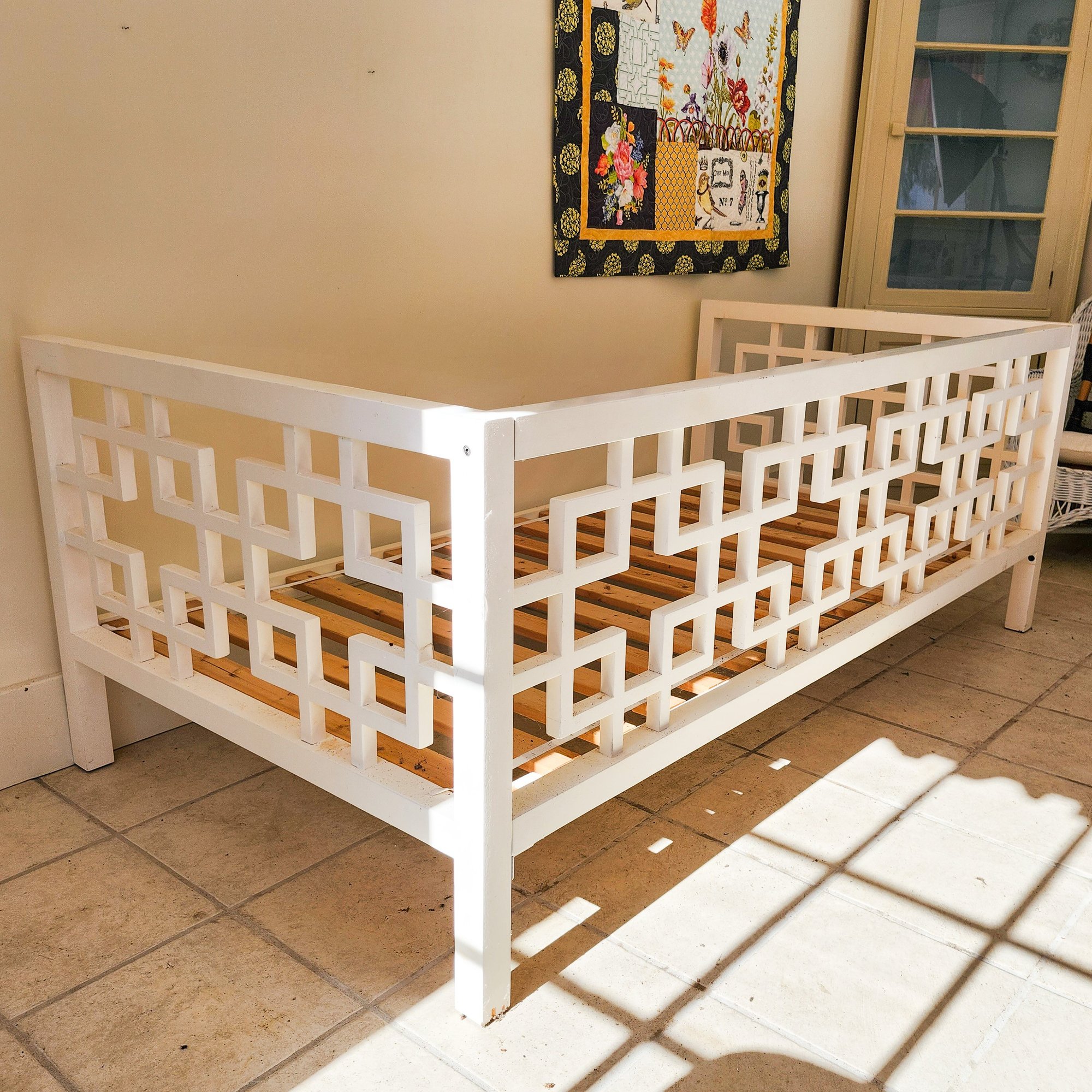 Great daybed painted white with Asian lattice design, Ikea mattress, and pretty cushions.
