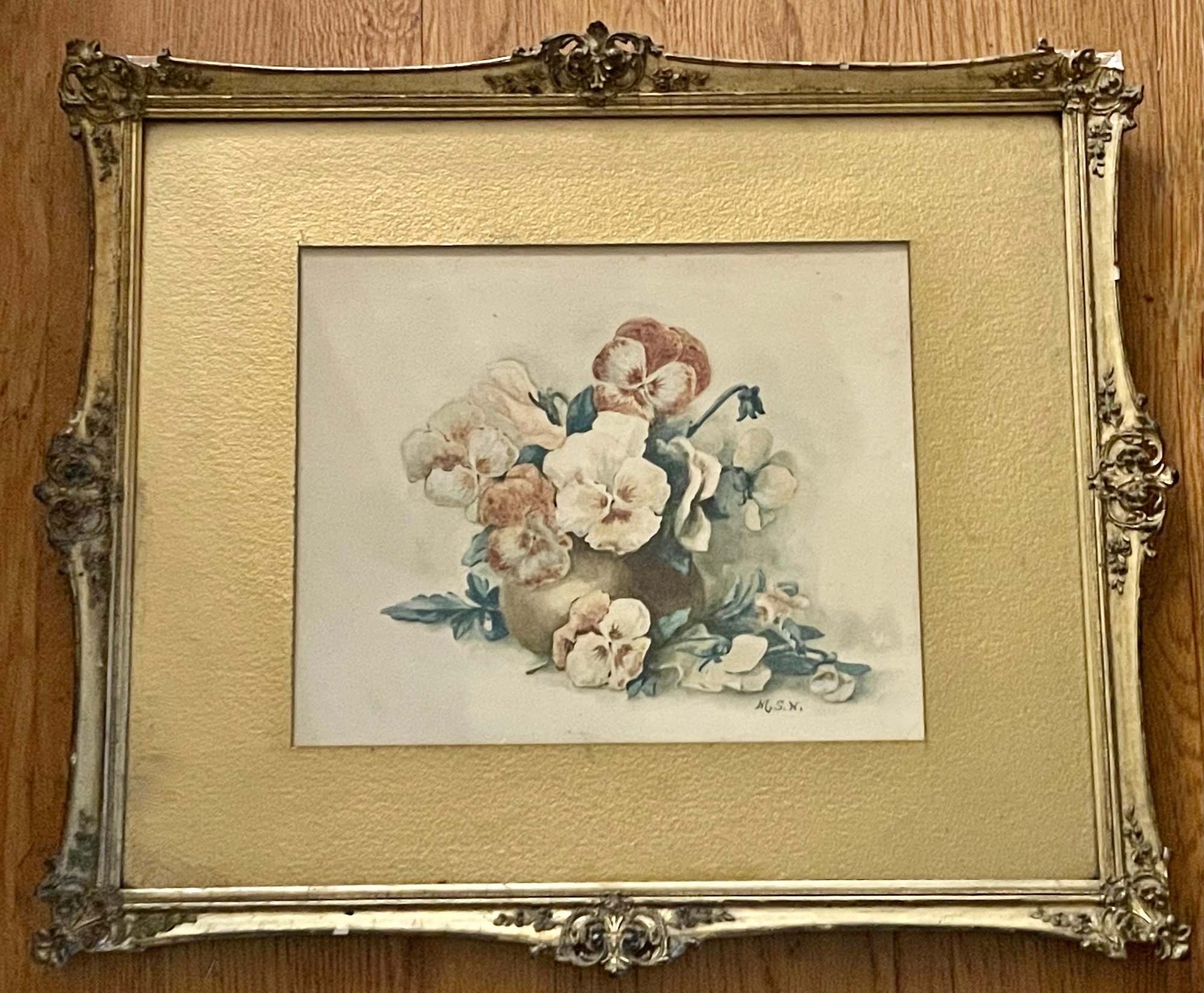 Charming framed early watercolor of pansies from the late 19th century. The frame has a little damage on one corner (see last photo).
