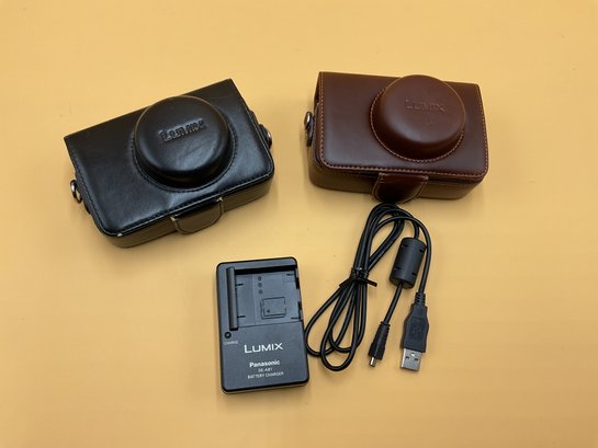 Two Panasonic Lumix cameras in this lot - the DMC-LX5 and the DMC-LX3, both with custom cases. Also included is a battery charger and media transfer cord. Batteries were not present so cameras are untested. Batteries found later and will be included. Also later found box and paperwork for Lumix LX3 camera. Both cameras look nice and clean and are expected to work perfectly. No SD cards.