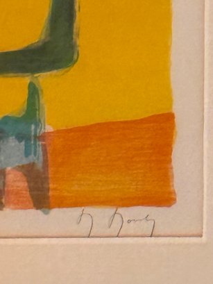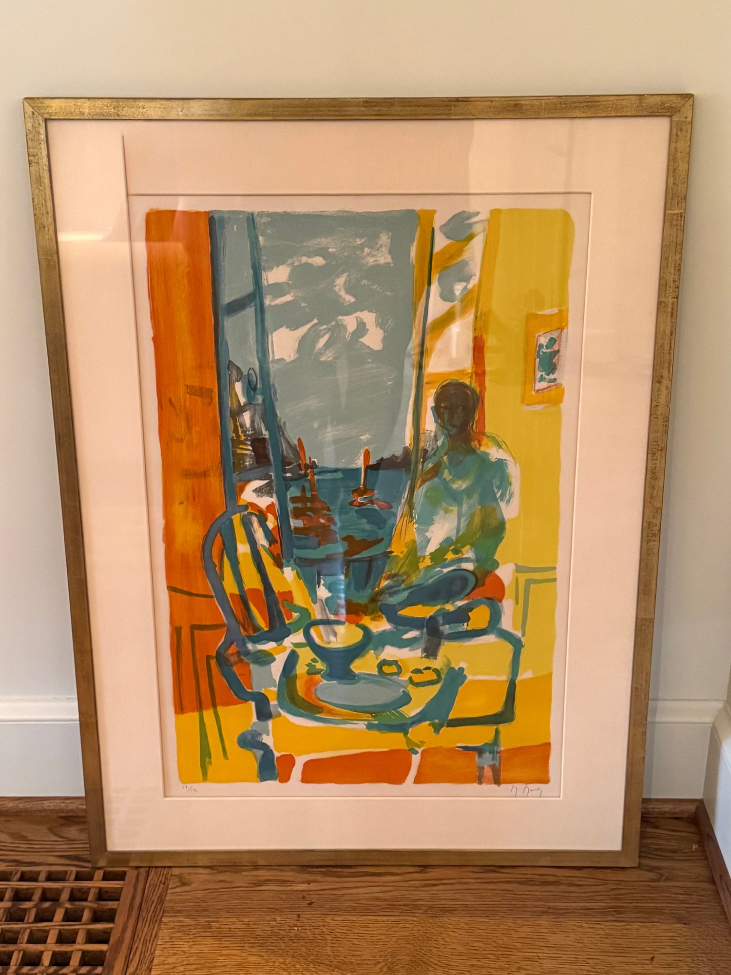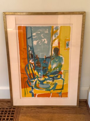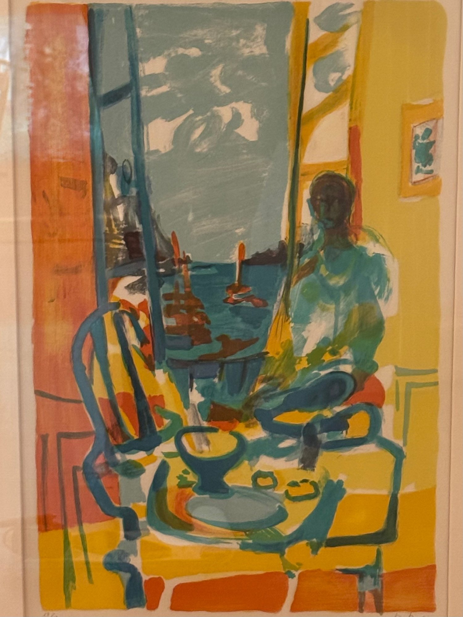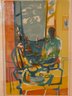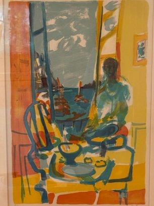 This is a lithograph by the French artist Marcel Mouly (1918–2008) who was influenced by Cubism and Fauvism. The work features a richly colored abstracted interior with a view of boats on the water. Marcel Mouly was known for his vibrant, energetic and colorful style. He mastered the technique of lithography, producing prints that are considered as significant as his paintings. Mouly's art is often described as being about "beauty and life" and is rooted in the School of Paris. This particular print is even more vivid in person.