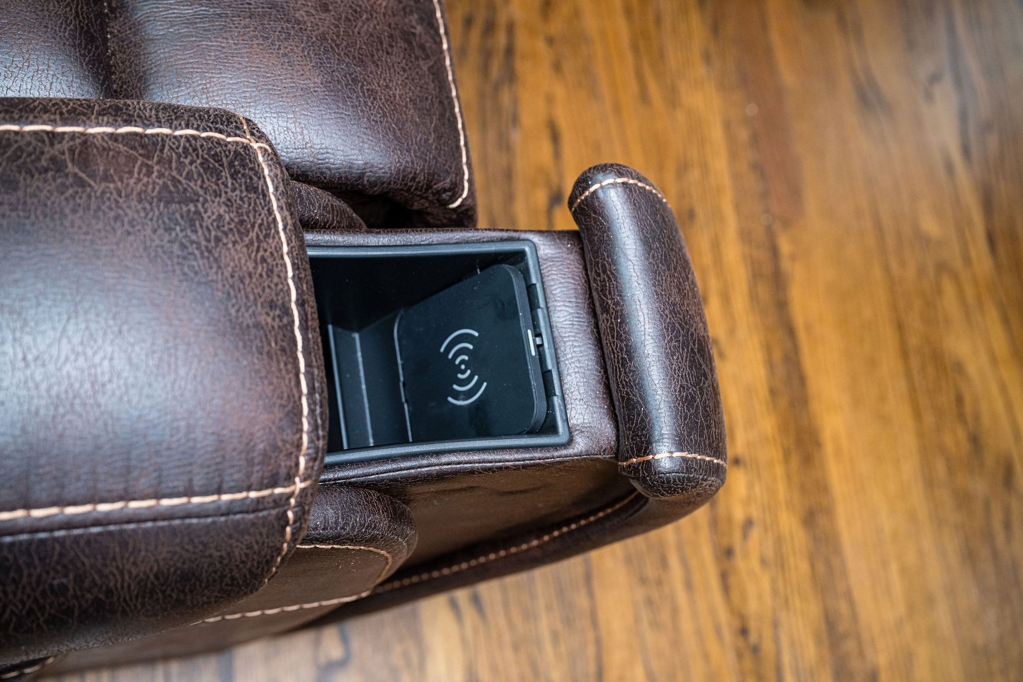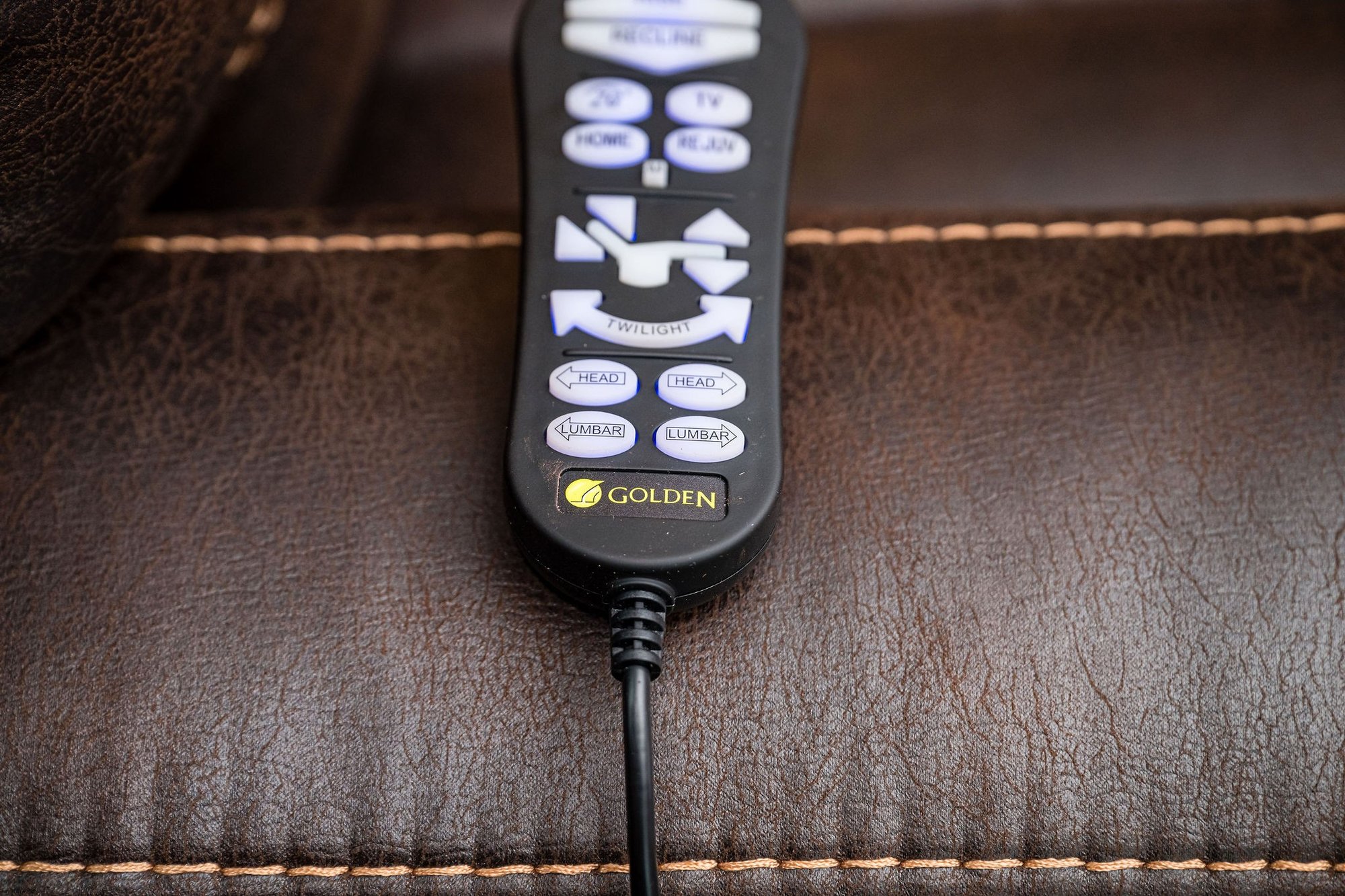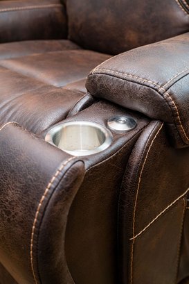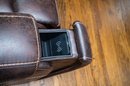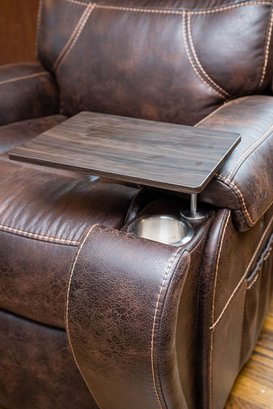 Tags still on! This is not the usual easy chair you're used to - DeLuna is a supple leather lift chair with controls, cup holder and even a tray surface that stows away when not in use.