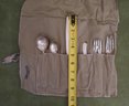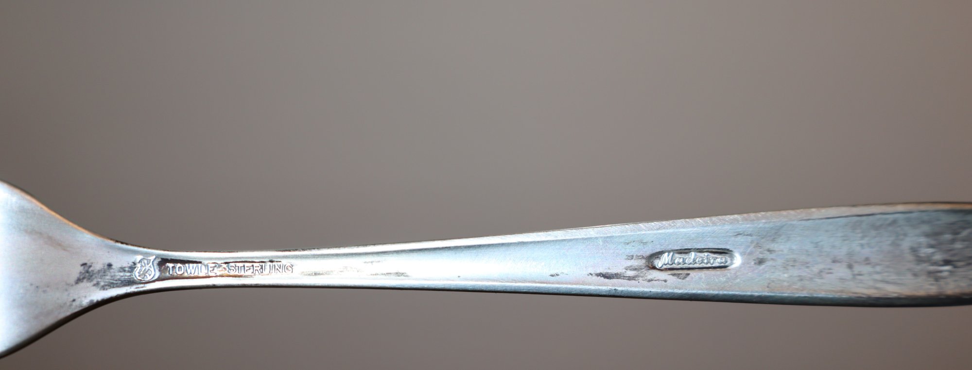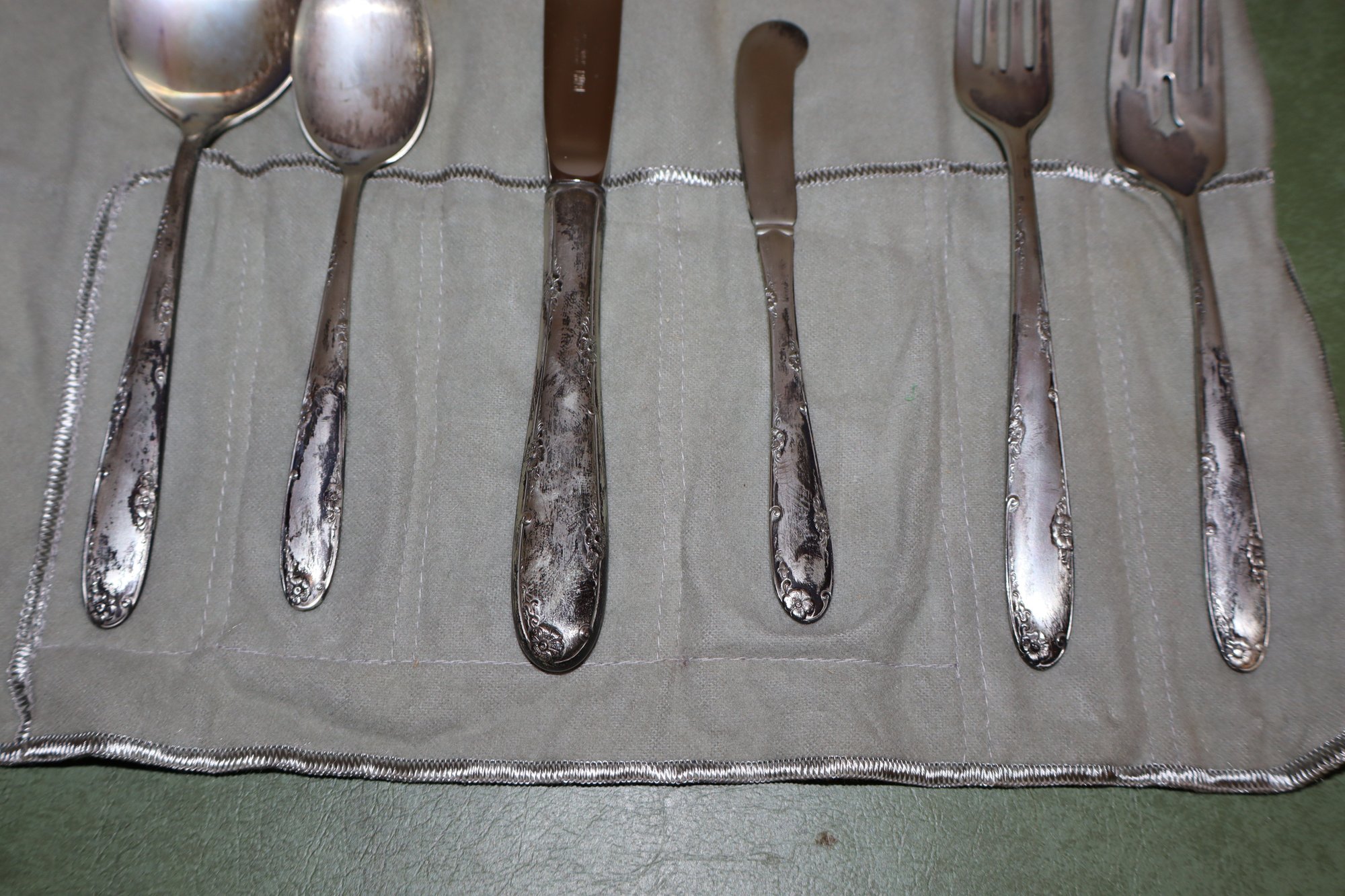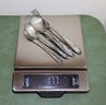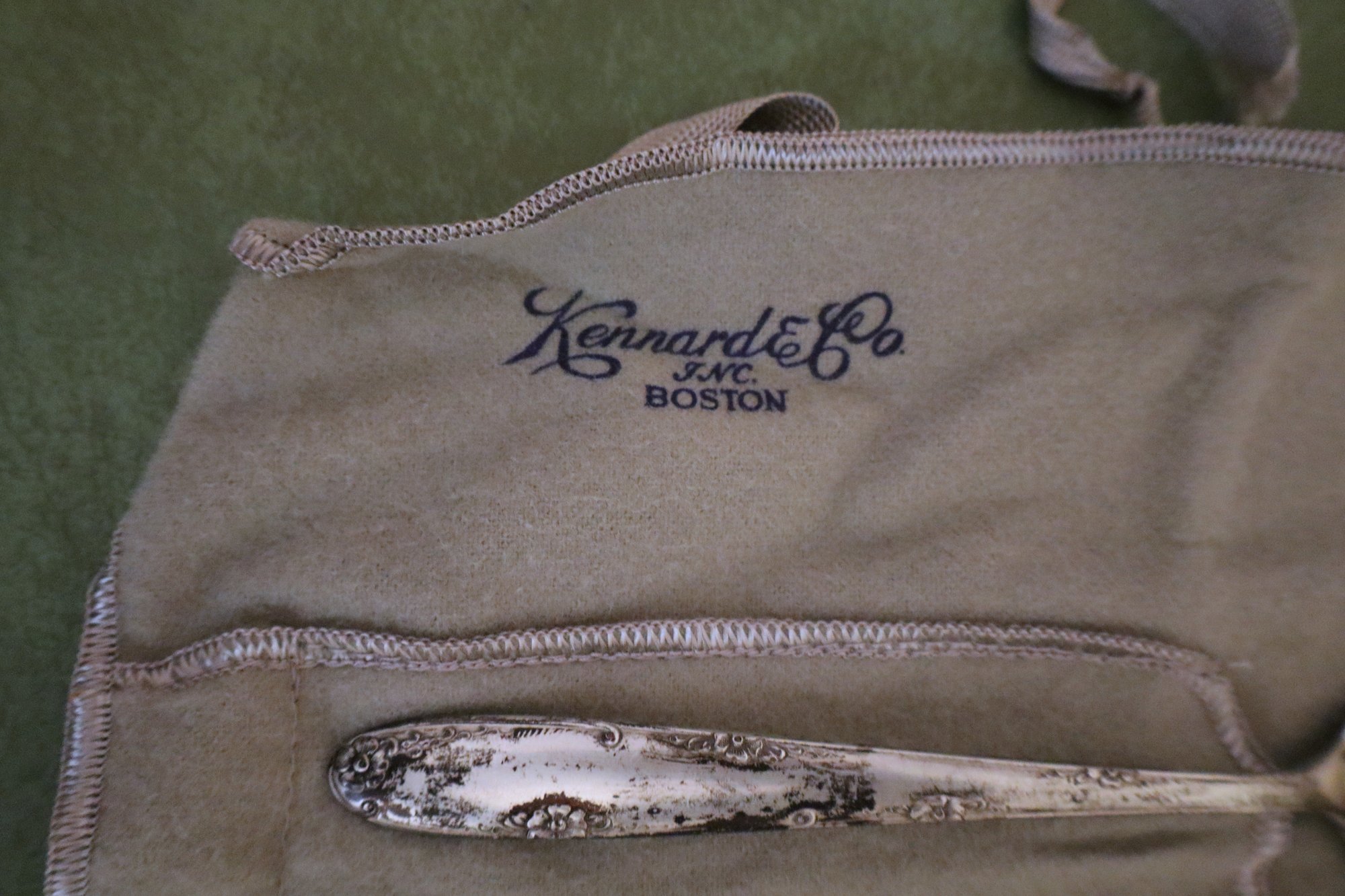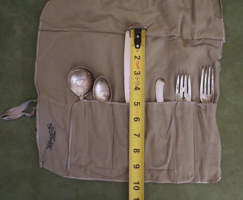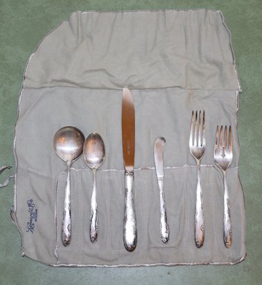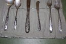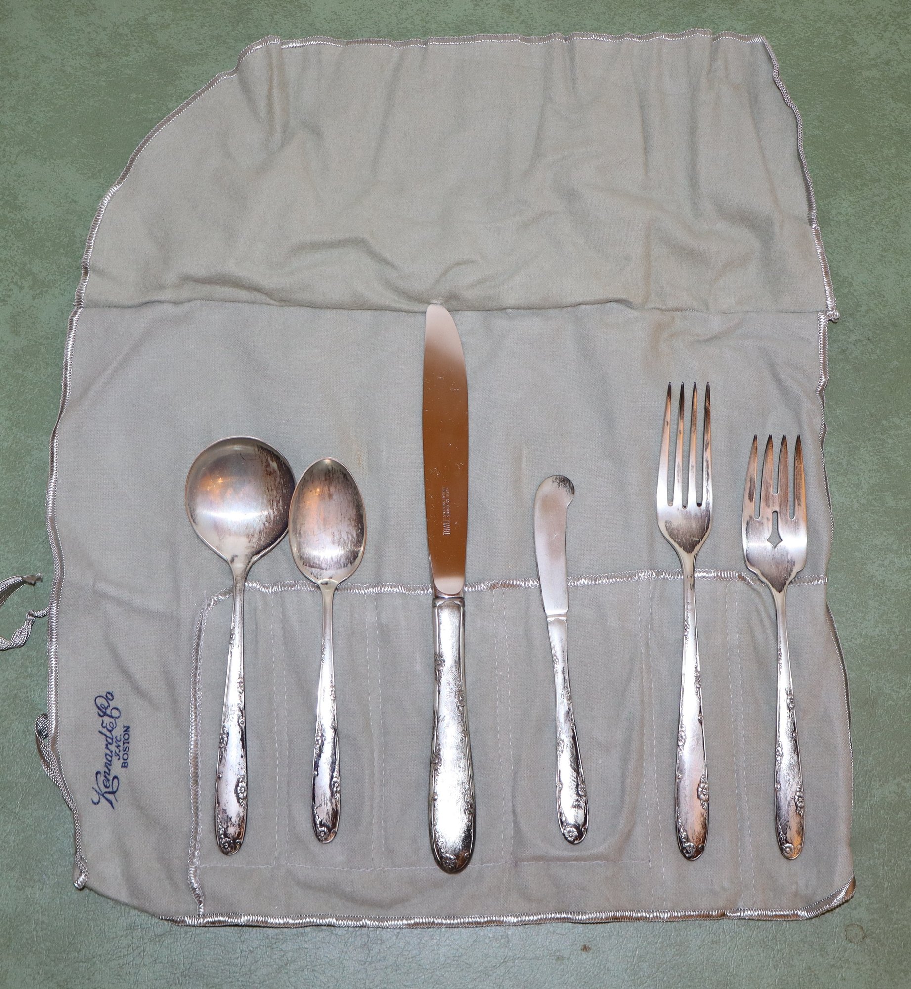 Includes 1 spoon, 1 serving spoon, 1 dinner knife, 1 butter spreader, 1 salad fork & 1 dinner fork in tarnish proof flannel