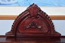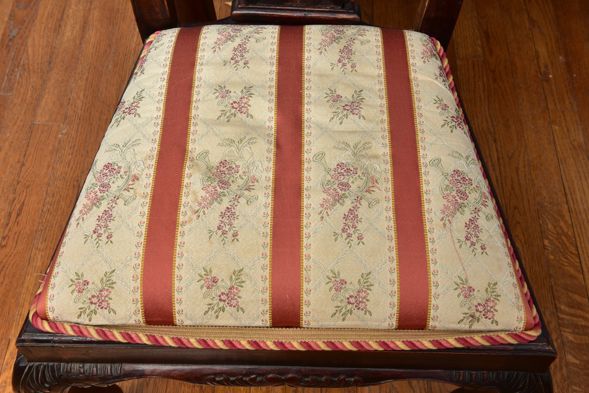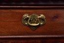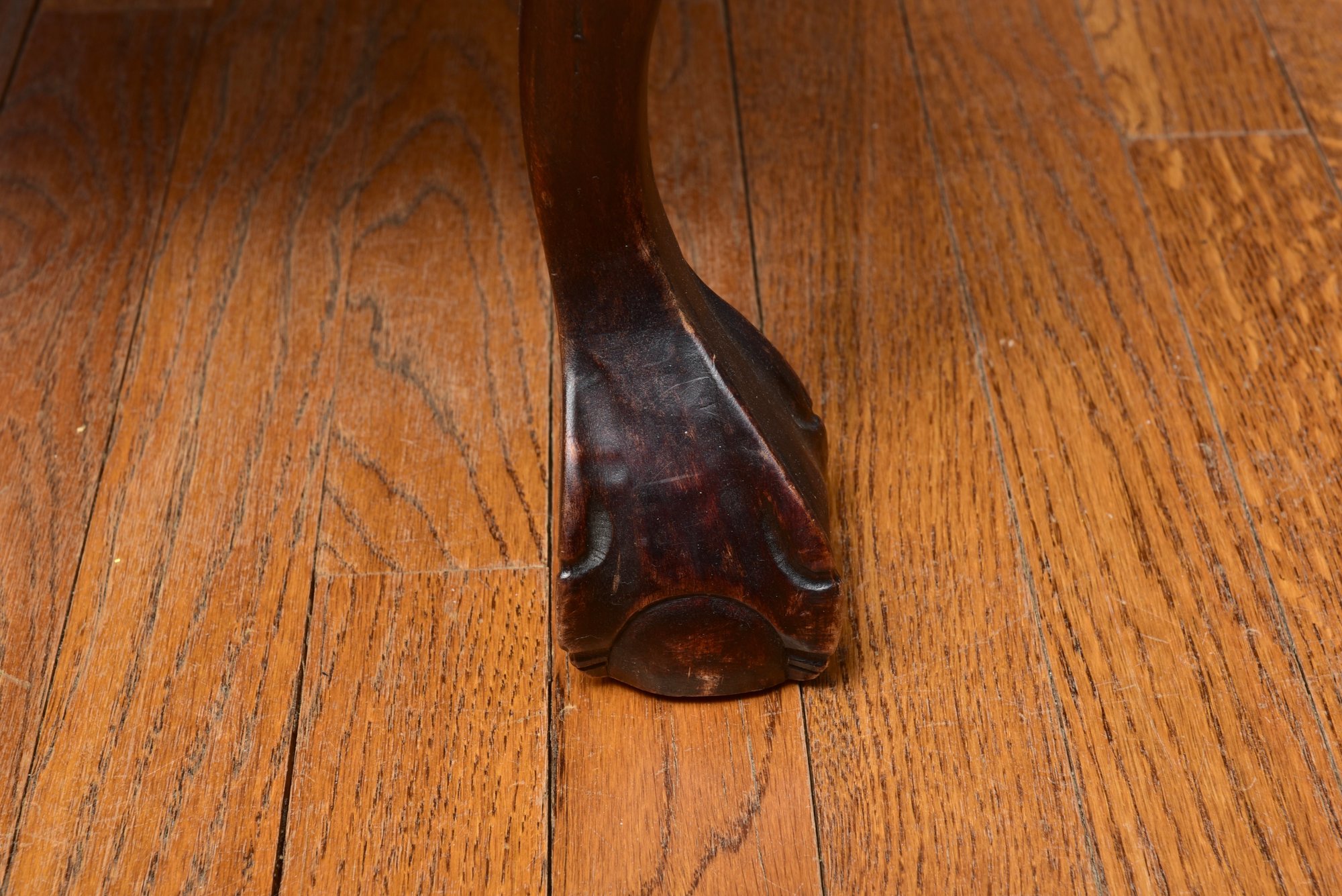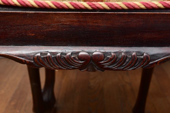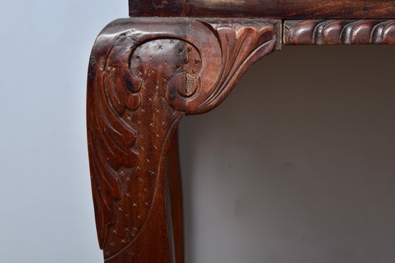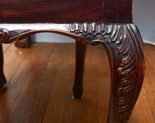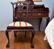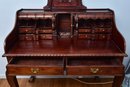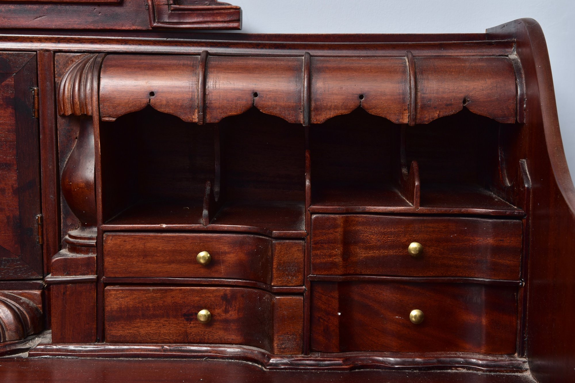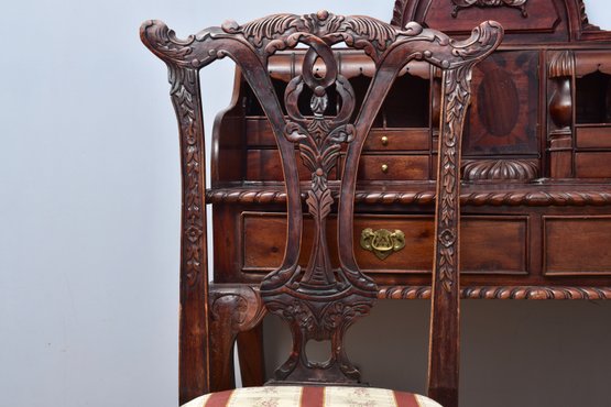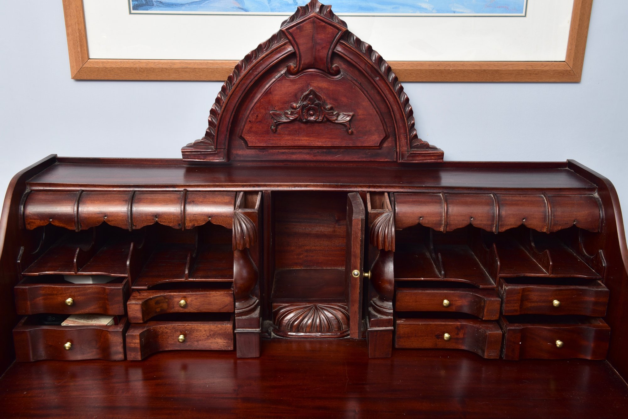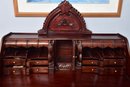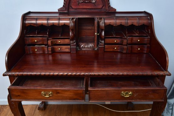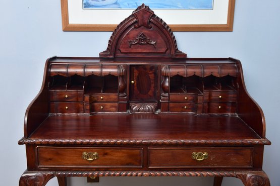 Elegant mahogany secretary desk featuring a decorative gallery with multiple secret cubbies and drawers, a carved central crest, rope-molded edges, and gracefully carved cabriole legs terminating in pad feet. Designed in the Georgian / Chippendale revival tradition, this refined writing desk offers both functional workspace and strong decorative presence.