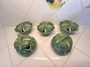 Majolica Cabbage Pattern 1 Set Cream & Sugar, 3 Condiment Covered Jars, Very Good Condition