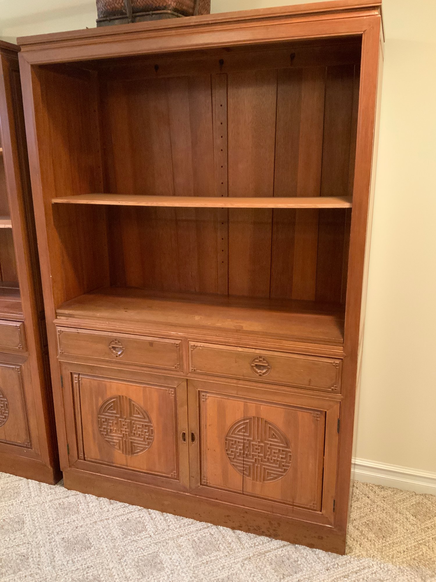 Amazing solid Rosewood storage and display cabinet - the carved side and top panels reflect the Asian origins. Intricately carved recessed drawer and door pulls. Carved front panels on double doors with one shelf behind. Adjustable shelves with holes for support pegs on sides and rear. Shelves have dried out and the glue deteriorated so they will need repair. Includes parts for 2 shelves. Shown with one replacement shelf (also included). Aside from the shelves, these are in great condition! (Does not include contents)