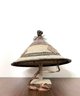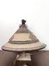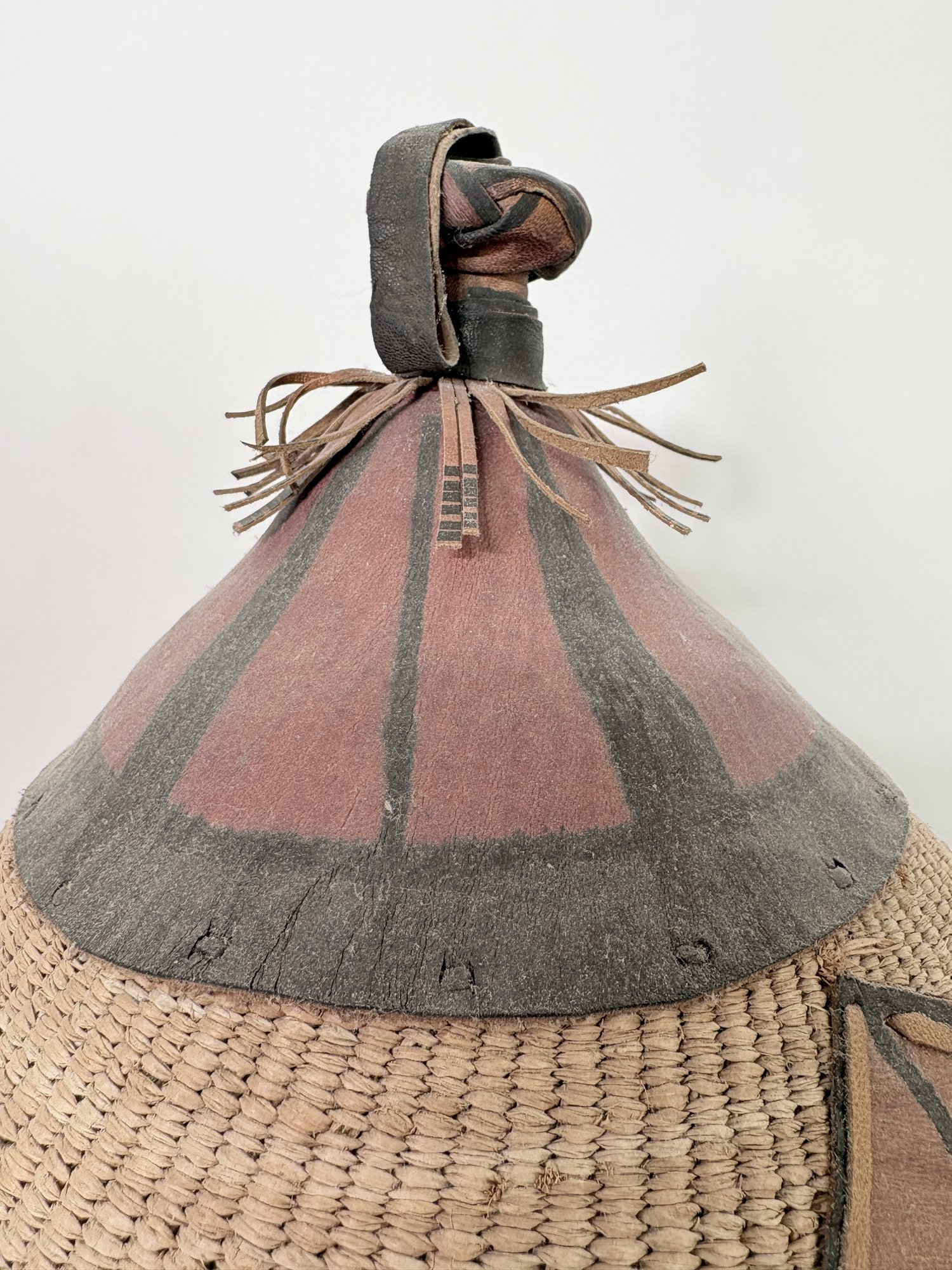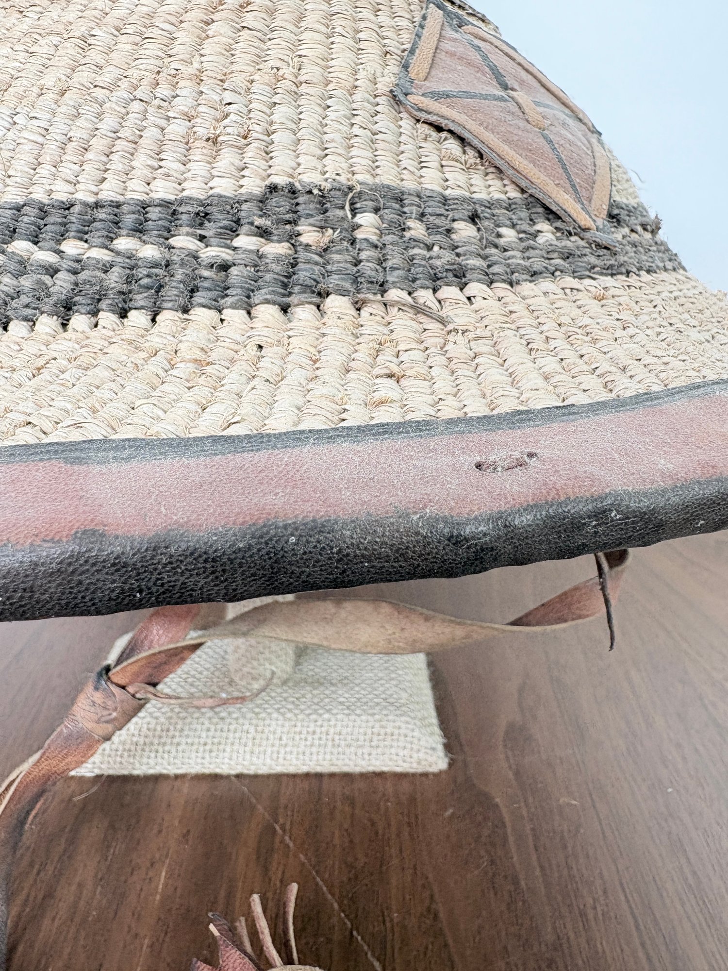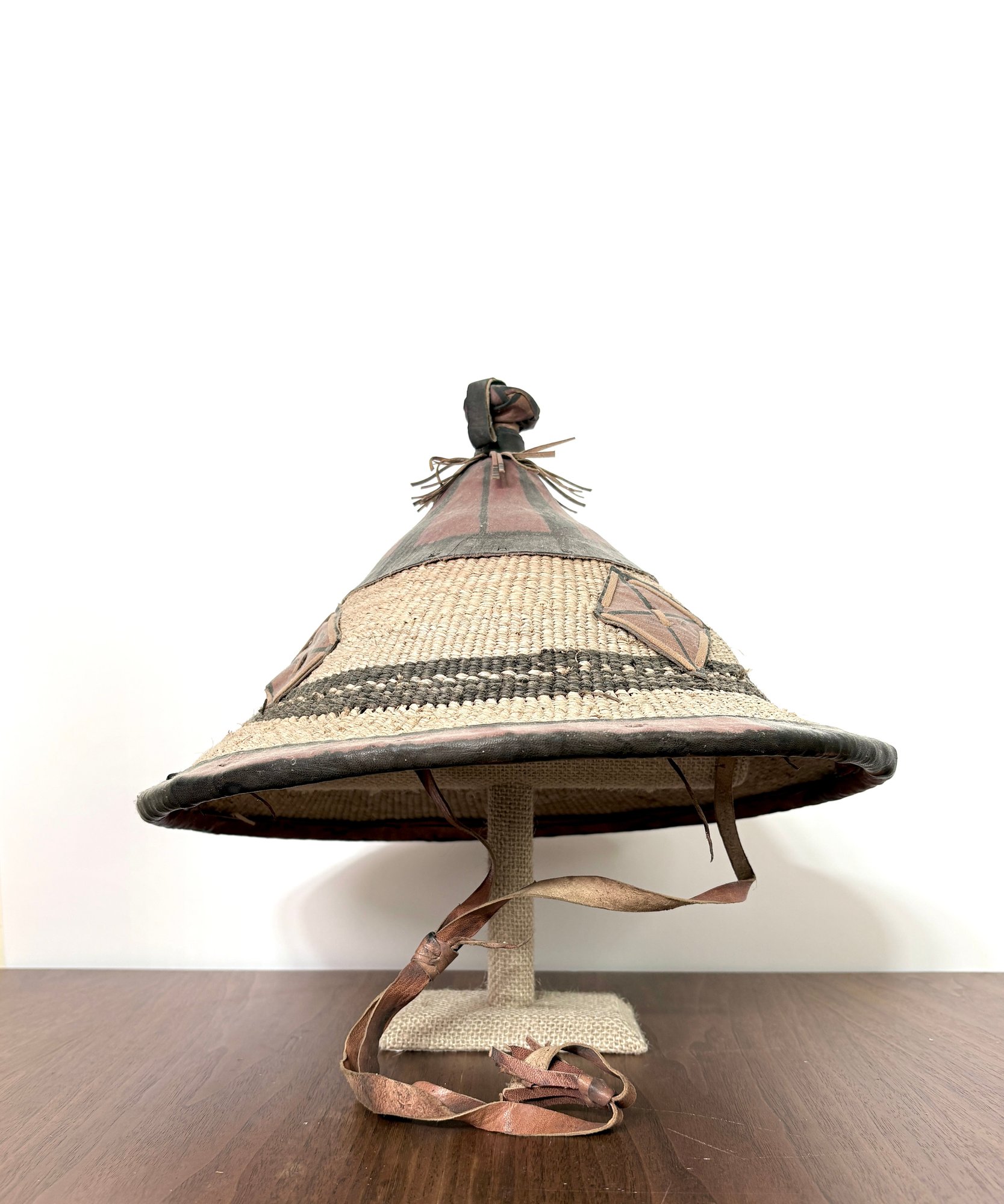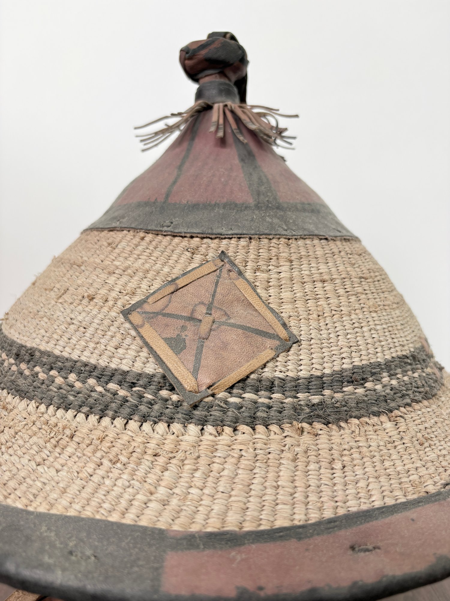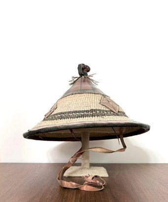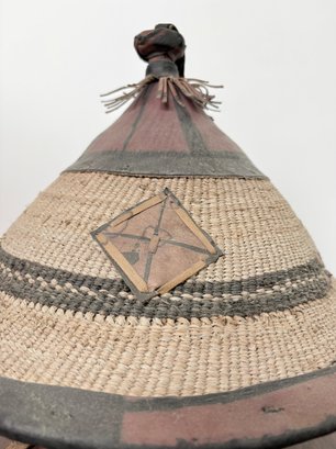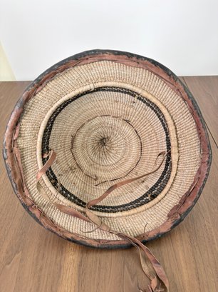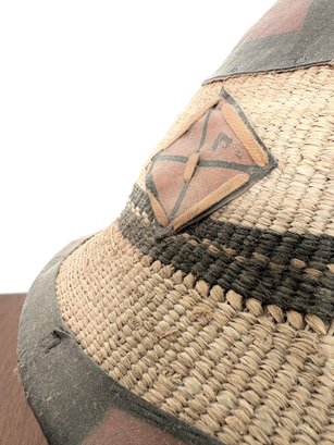 Beautiful large West African hand woven Fulani hat. Made of natural plant fibers with hand painted leather accents.