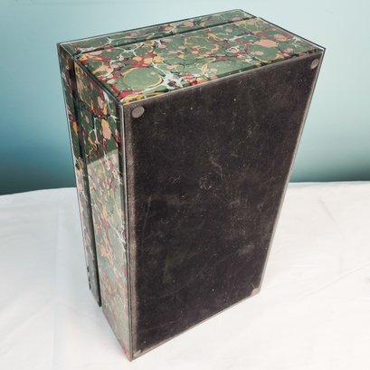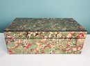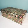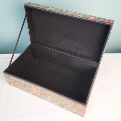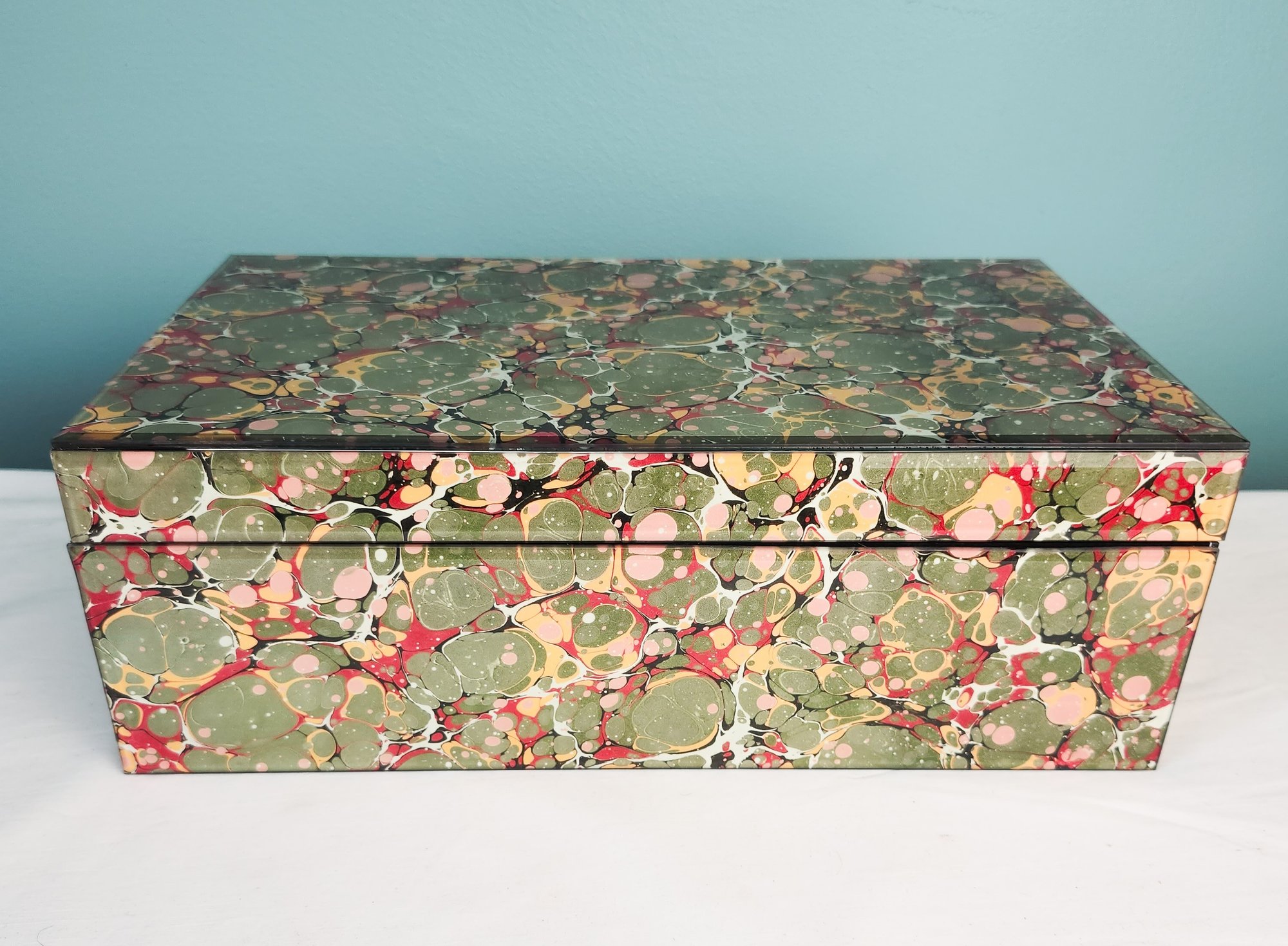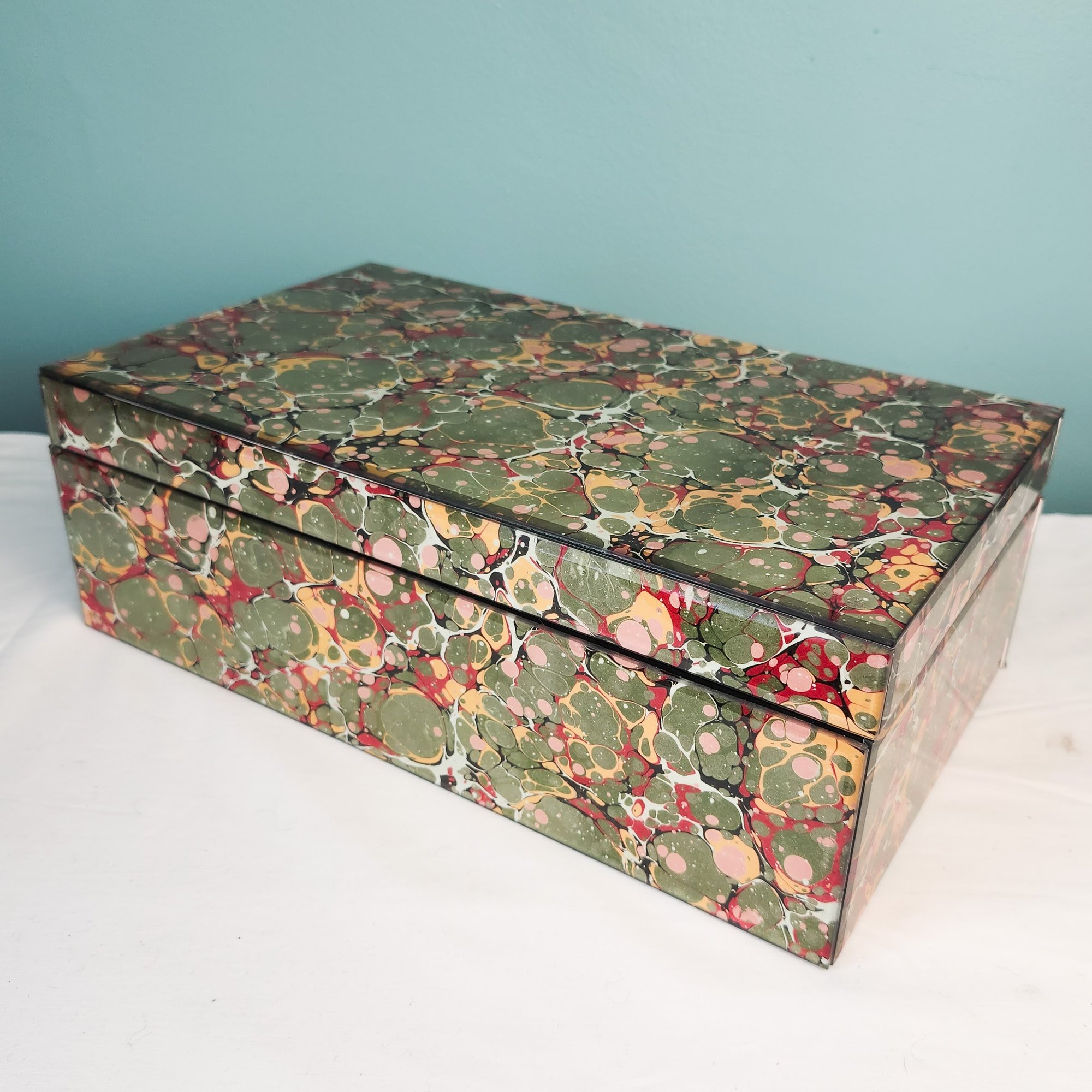 Pretty marbled paper under glass decorated box in primarily green with red and yellow accents.