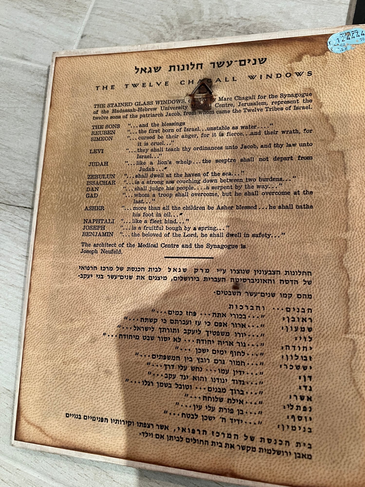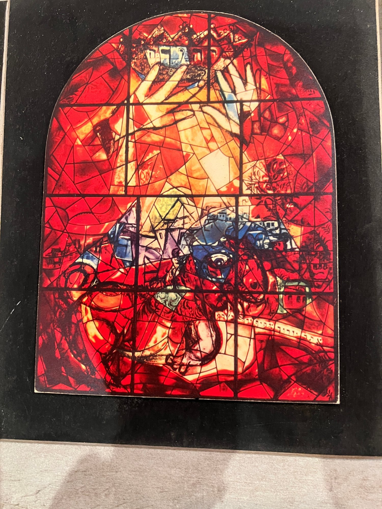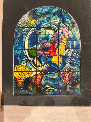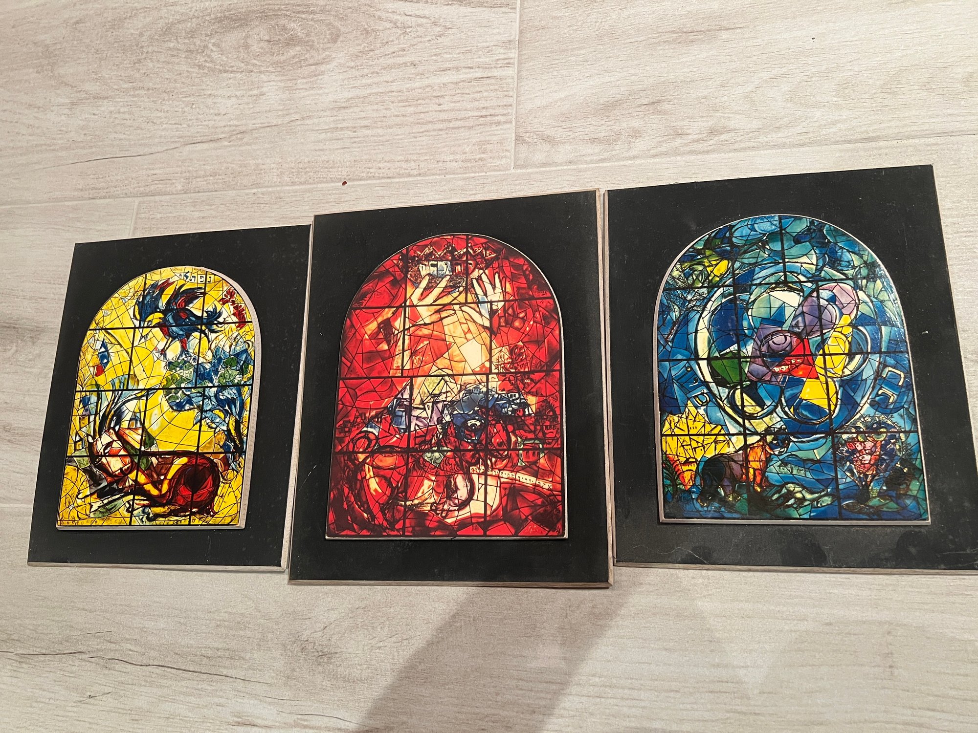 These are prints of the stained-glass windows created by Marc Chagall for the Hadassah-Hebrew University Medical Center Synagogue in Jerusalem. The prints appear to feature the windows representing different Tribes of Israel.