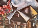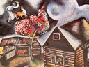 This piece features a lively village scene with rustic cottages, animals, musicians, and floating figures set beneath swirling skies. The composition blends folk imagery with surreal elements, including a blooming tree, farm animals, and airborne characters, all rendered in rich earthy tones of red, brown, and blue.