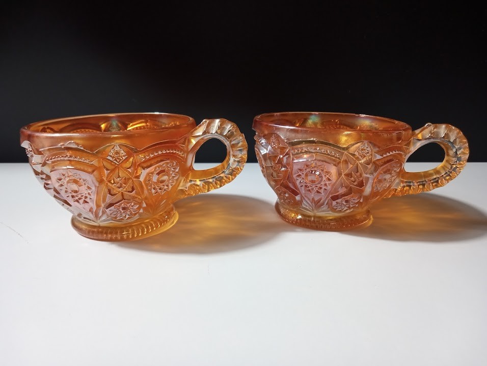 Stunning Marigold Carnival glass cups featuring a Hobstar and Flower intricate design pattern that gives it a distinctive orange-gold glow.