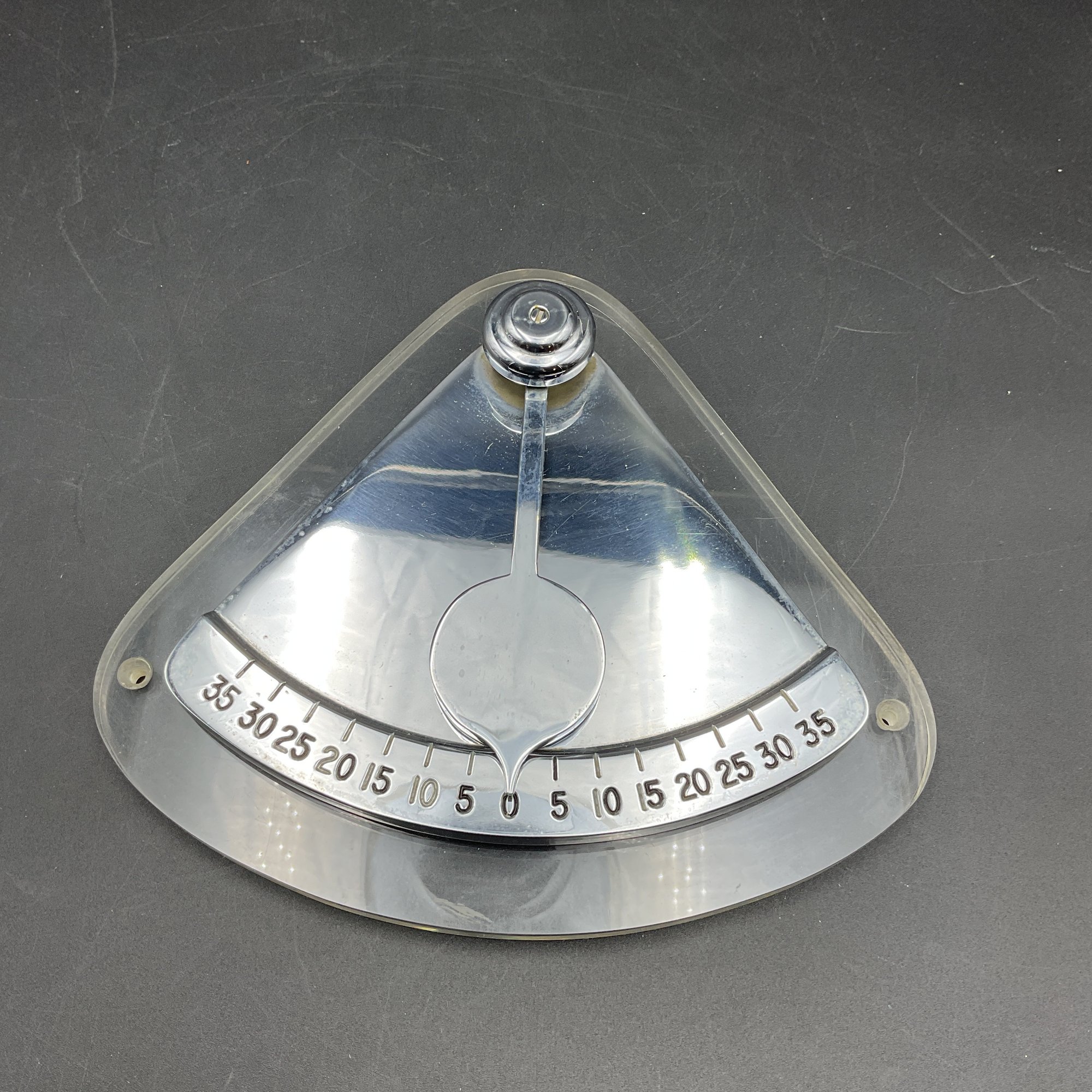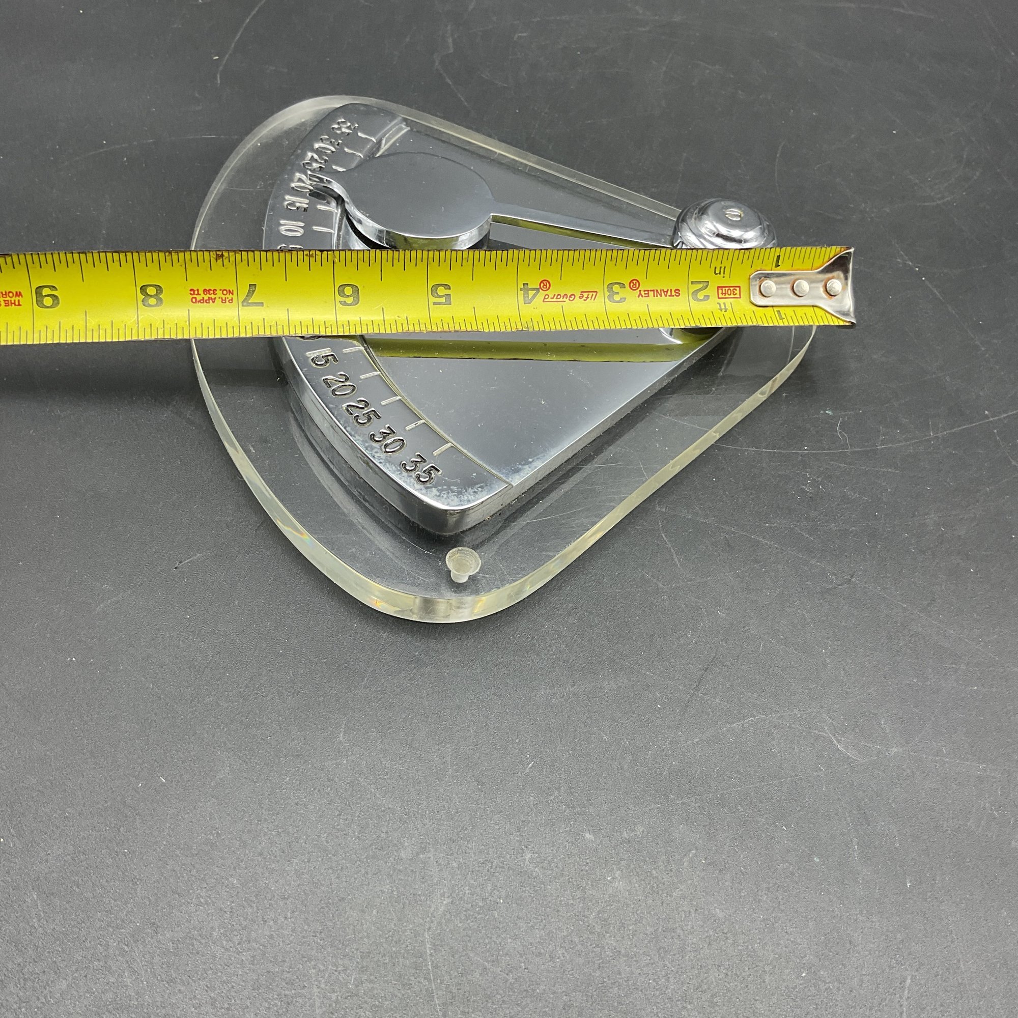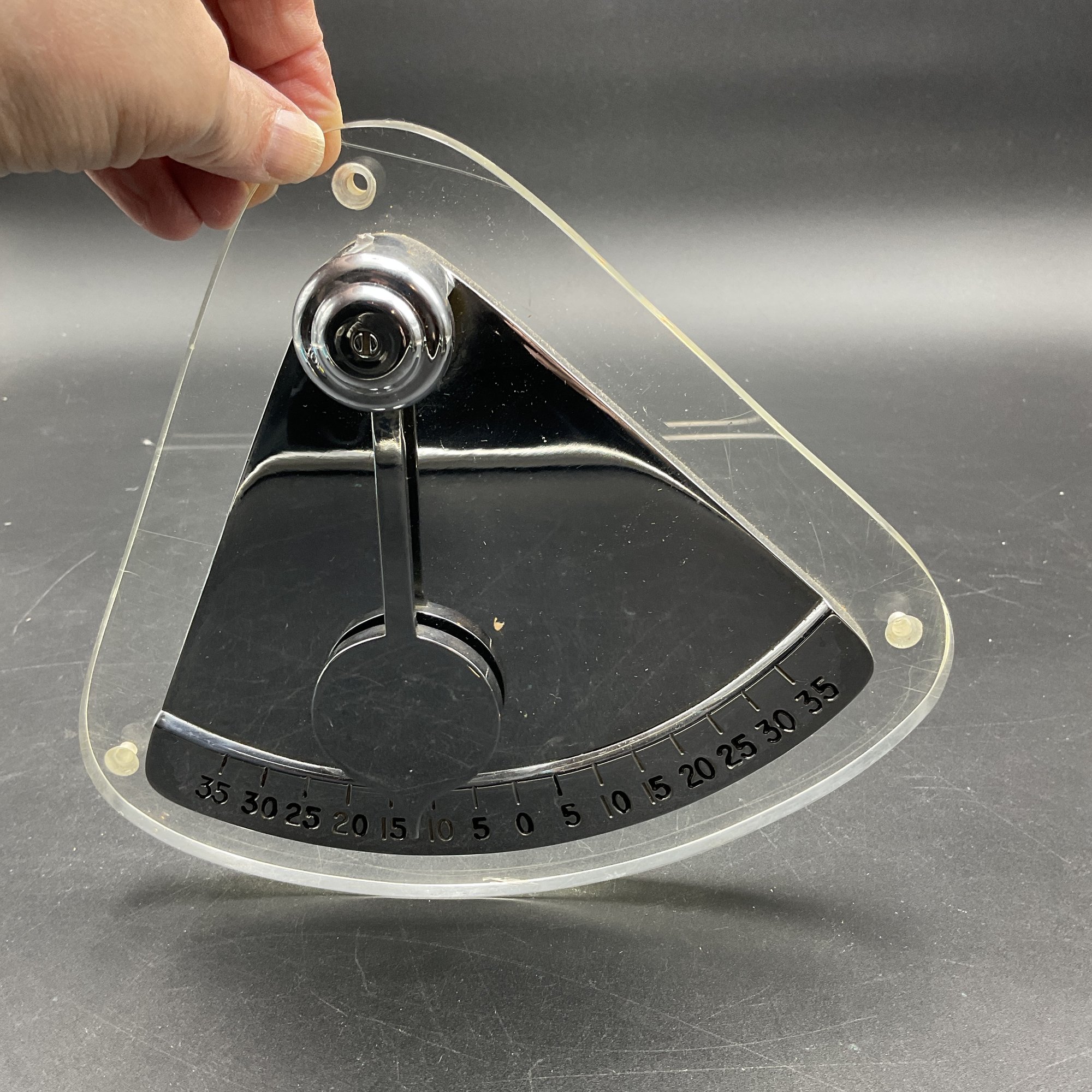 A ship inclinometer, also known as a clinometer, is an instrument used on boats and ships to measure the degree of tilt or heel (side-to-side angle) of the vessel relative to the horizontal. This is a pendulum version intended to be mounted on a boat. Heavy duty plexiglass mounting with stainless steel gauge and pendulum. Great condition, swings freely, no damage noted. Unusual piece of marine ephemera.