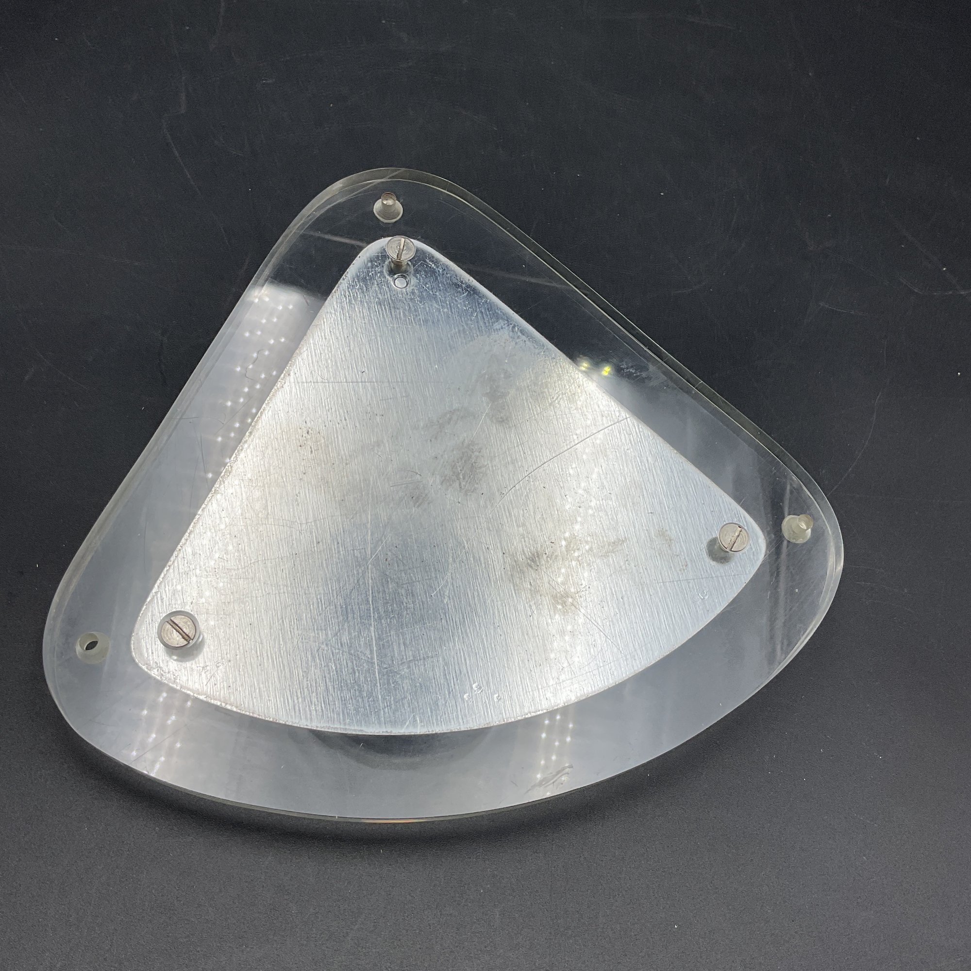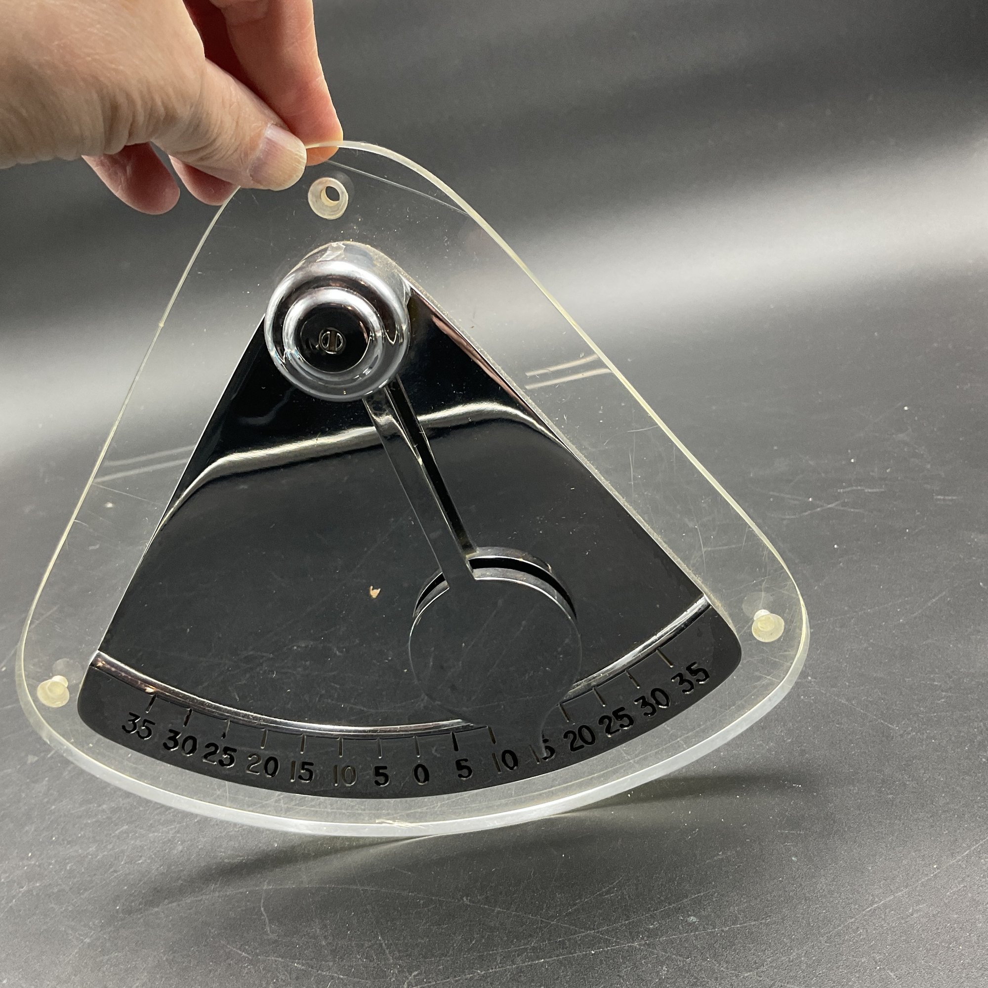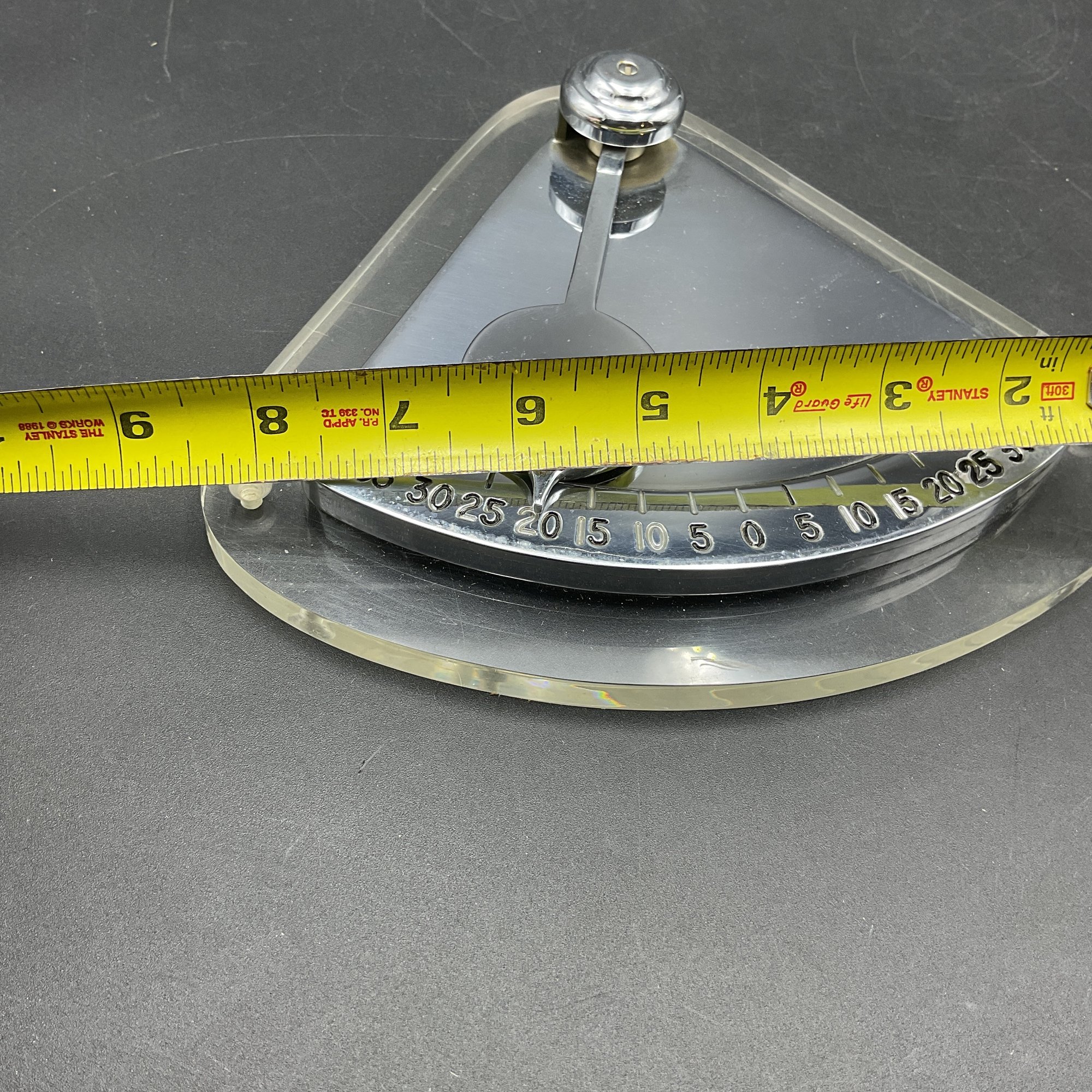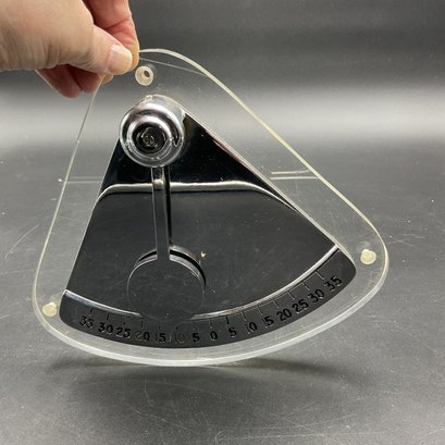 A ship inclinometer, also known as a clinometer, is an instrument used on boats and ships to measure the degree of tilt or heel (side-to-side angle) of the vessel relative to the horizontal. This is a pendulum version intended to be mounted on a boat. Heavy duty plexiglass mounting with stainless steel gauge and pendulum. Great condition, swings freely, no damage noted. Unusual piece of marine ephemera.