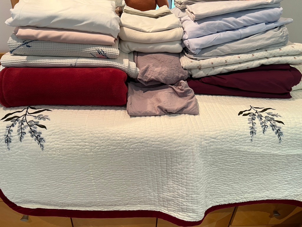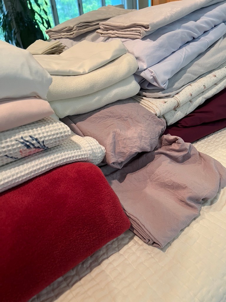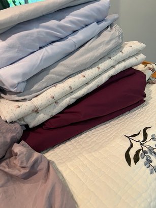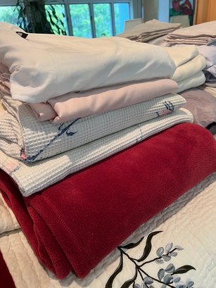 maroon, reds and purple linens, fleece blanket, pillow cases, Queen linen, large bedspread has minor stains, it has been dry cleaned