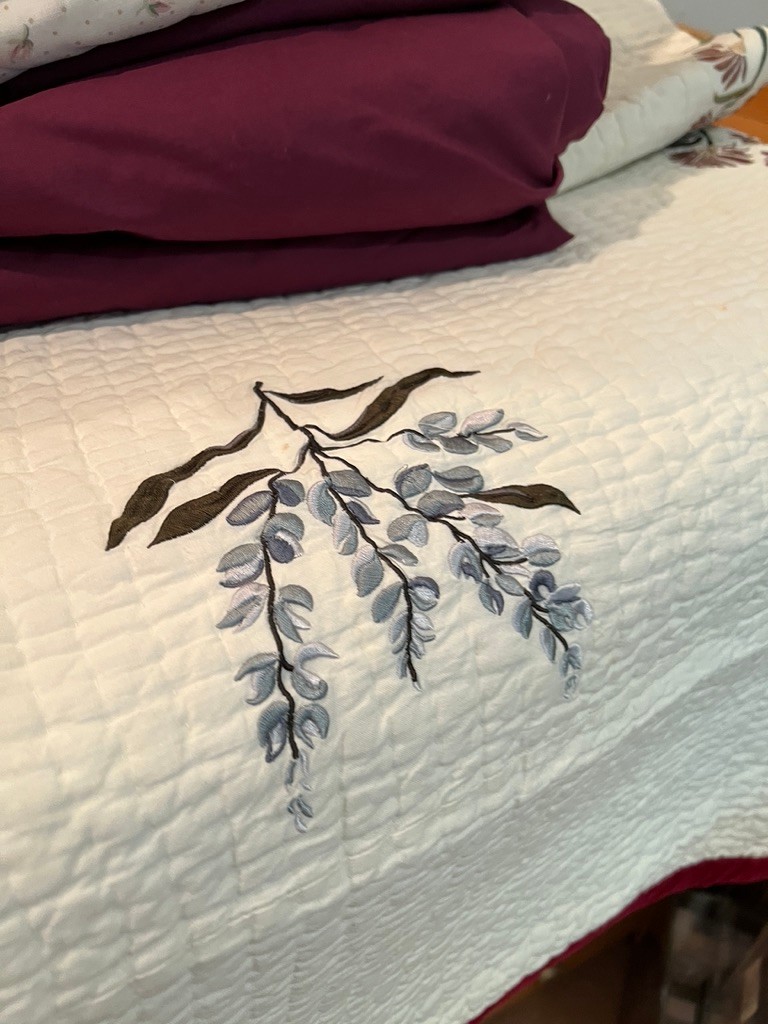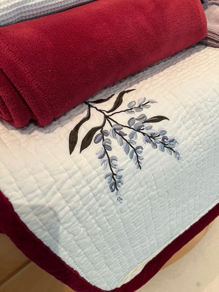 Notes: large bedspread has minor stains, has been professionally dry cleaned,