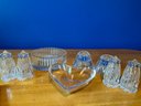 2 sets salt & Pepper w boxes; heart bowl w/ box; pair candleholders no box, ribbed bowl no box