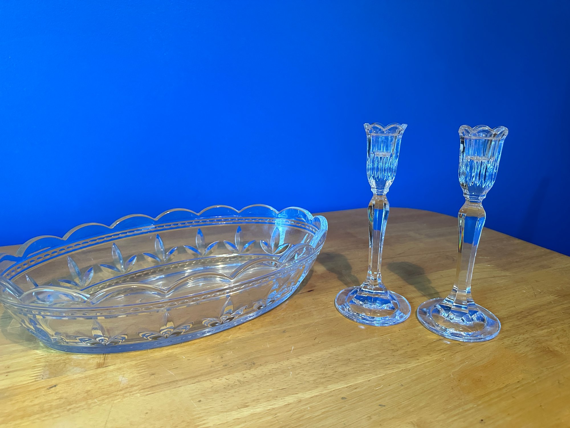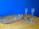all in very good condition. No chips or cracks. Oval bowl & pr. of taper holders