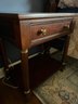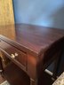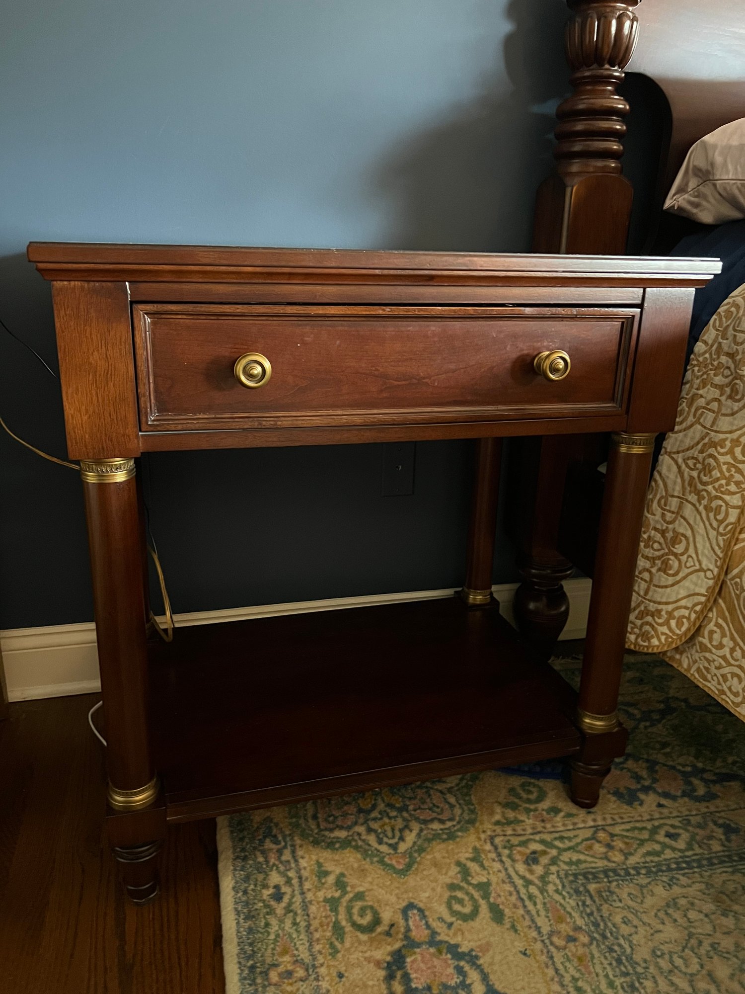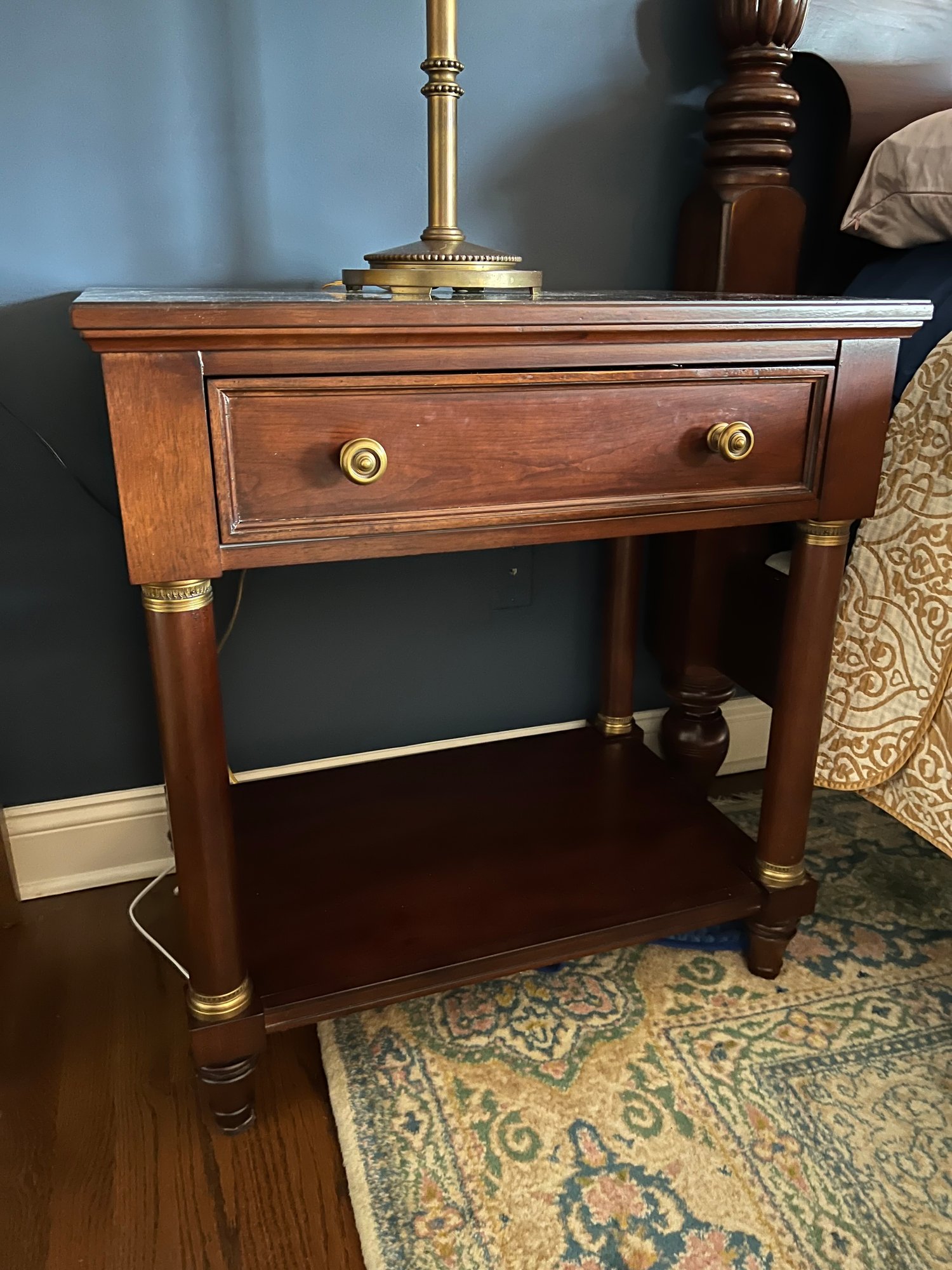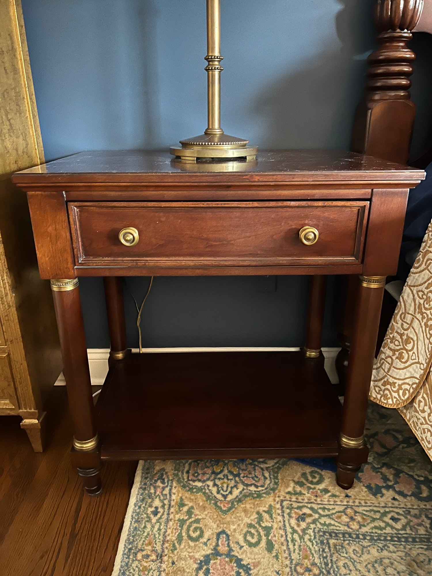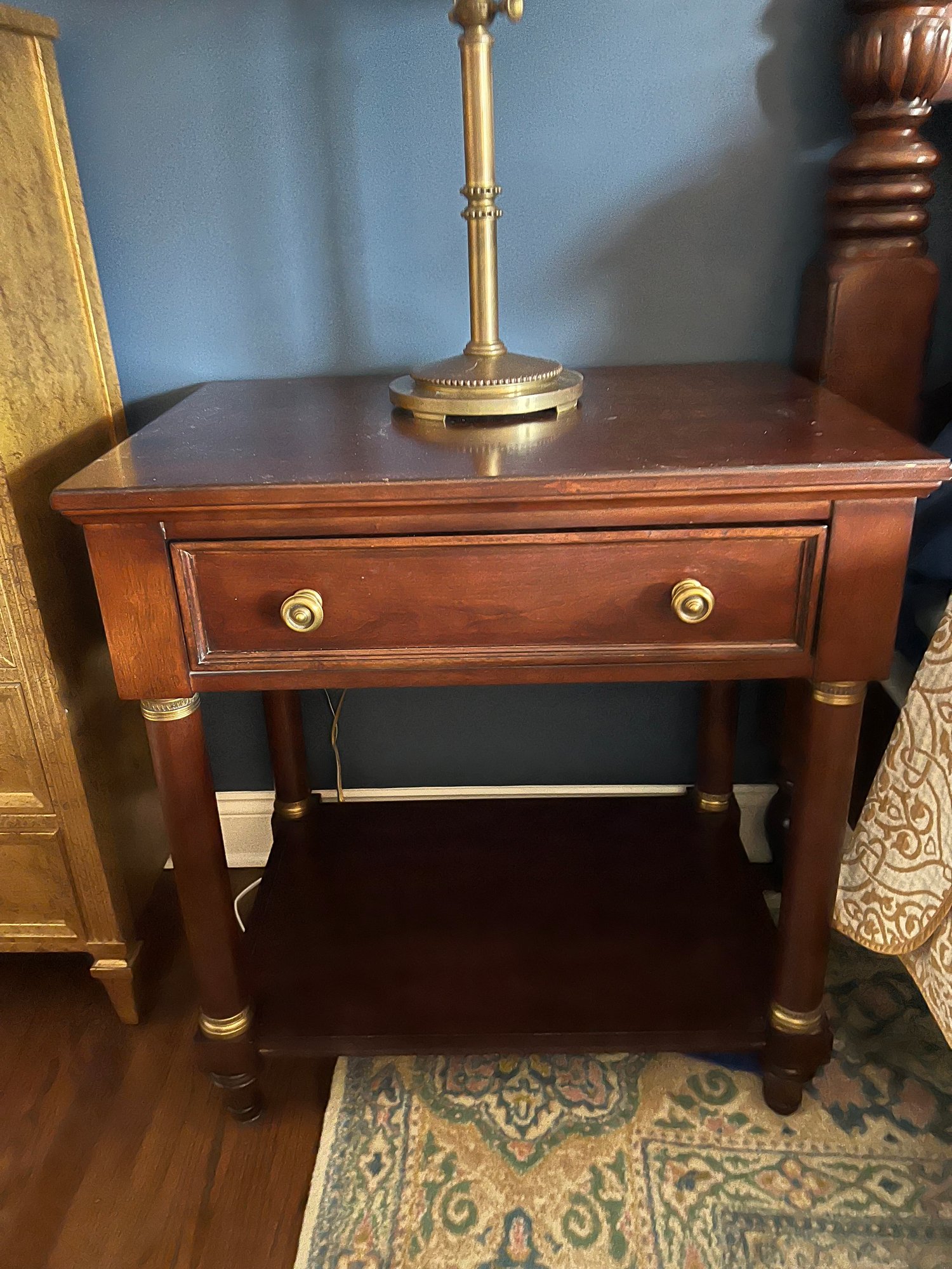 in a warm rich antiqued cherry finish. With top pullout drawer and bottom area shelf. Hardware and detailing is a beautiful tarnish resistant brass. Condition is overall good with some top finish wear to
