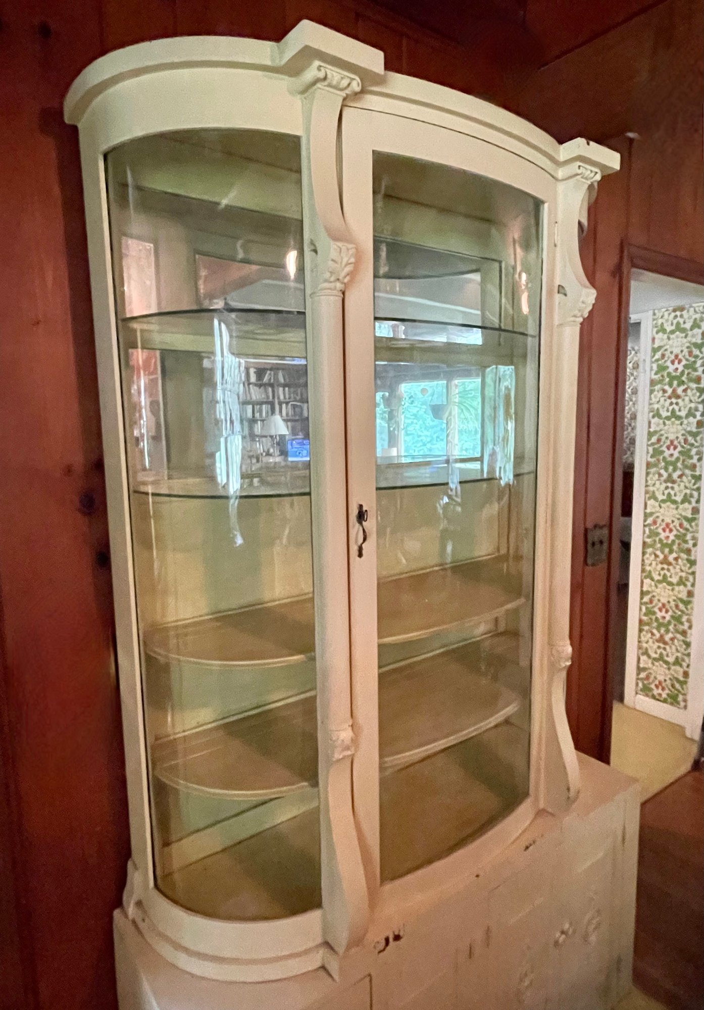 This is a wonderful early painted wood cabinet with curved glass and five shelves, two of which have mirrored backs. The case sits on a separate base with more cabinet space for storage. The case locks and has the original key as well.