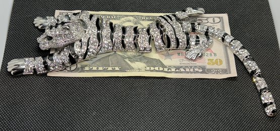 It is VERY large [used a $50- bill to show scale], meant to be worn draped over the shoulder. Fully articulated, from the head to the end of its' tail. Encrusted in clear rhinestones, with ebony enamel eyes and stripes. Measures 10.5" in length. Condition is excellent.